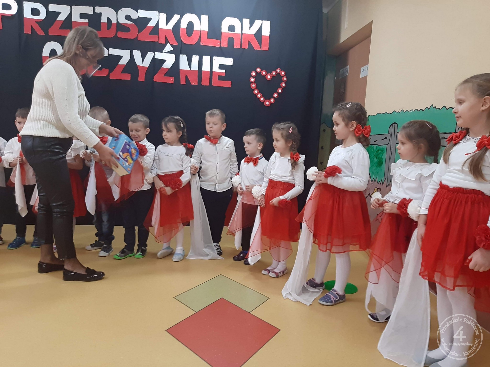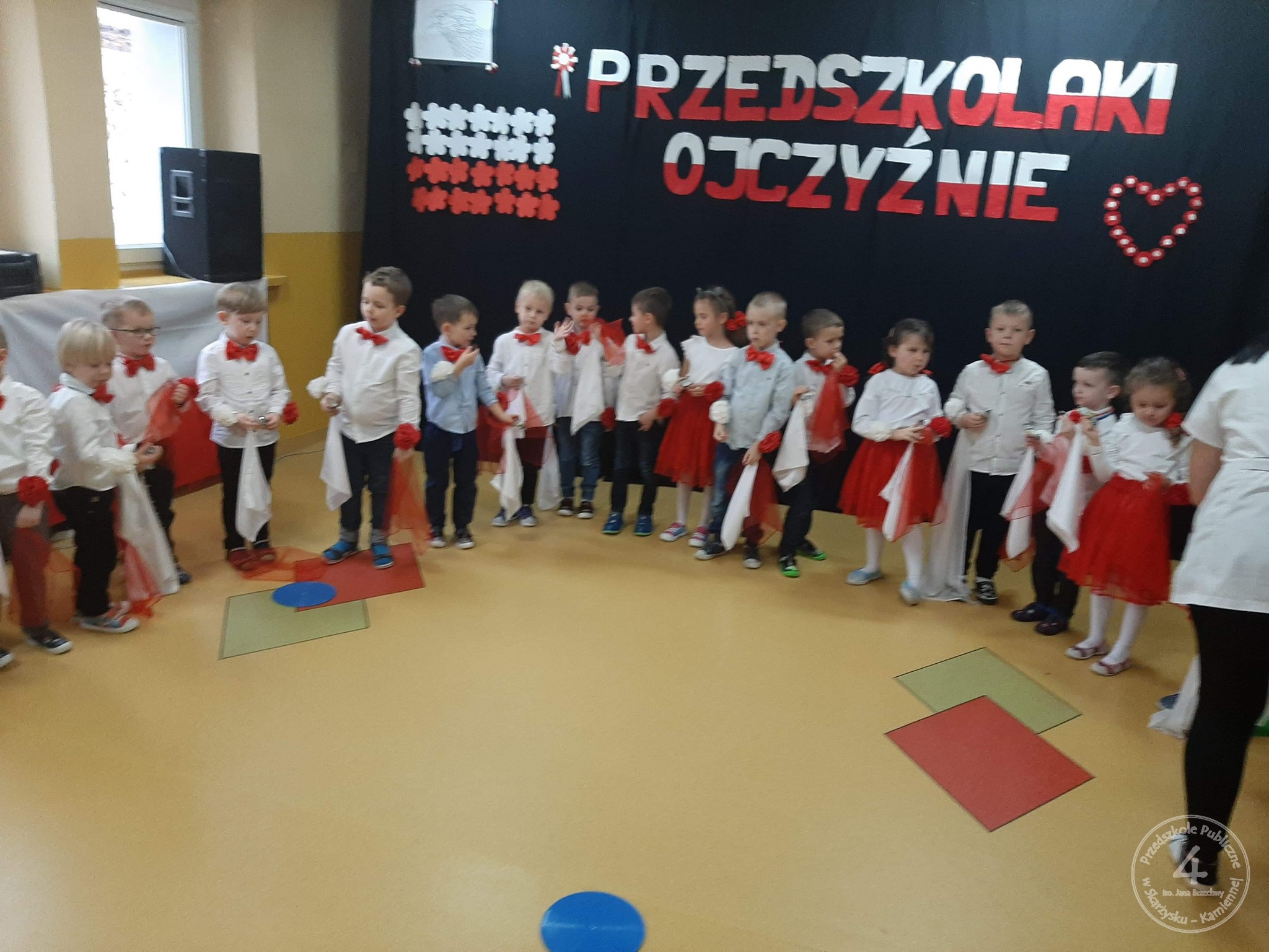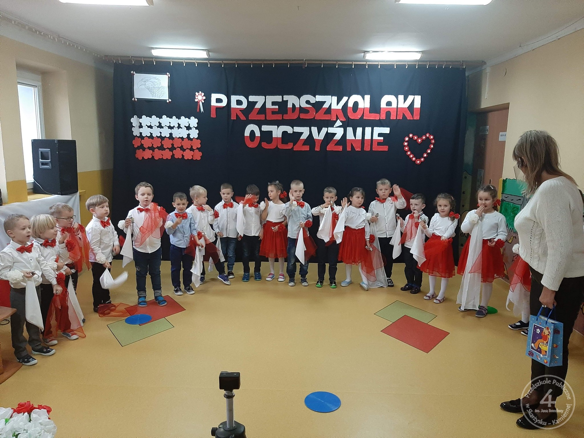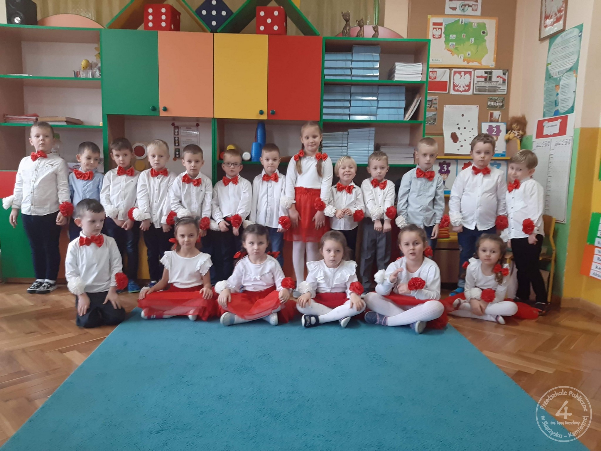 Jak co roku w naszym przedszkolu uroczyście obchodzimy Święto Niepodległości. Tego dnia przedszkolaki z naszej grupy odświętnie ubrane w biało-czerwone symbole narodowe zaprezentowały patriotyczny program artystyczny. Czcząc pamięć tamtych historycznych dni wszystkie przedszkolaki zaśpiewały Hymn Polski.