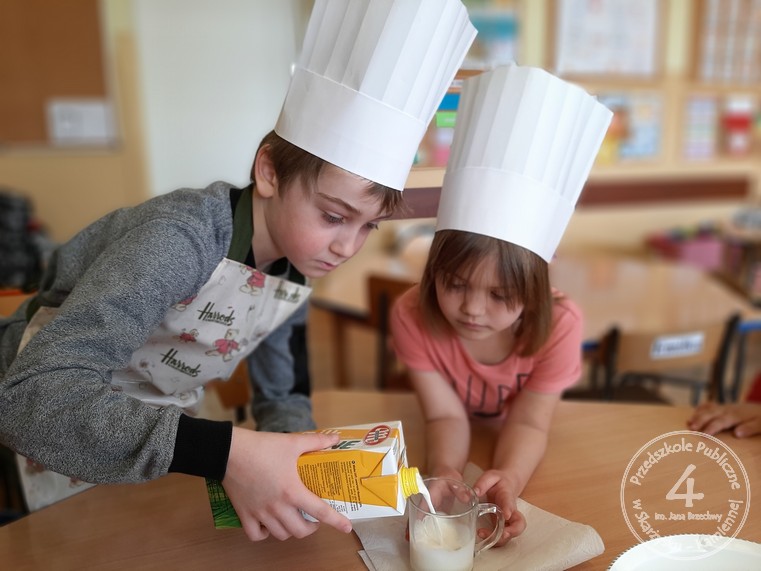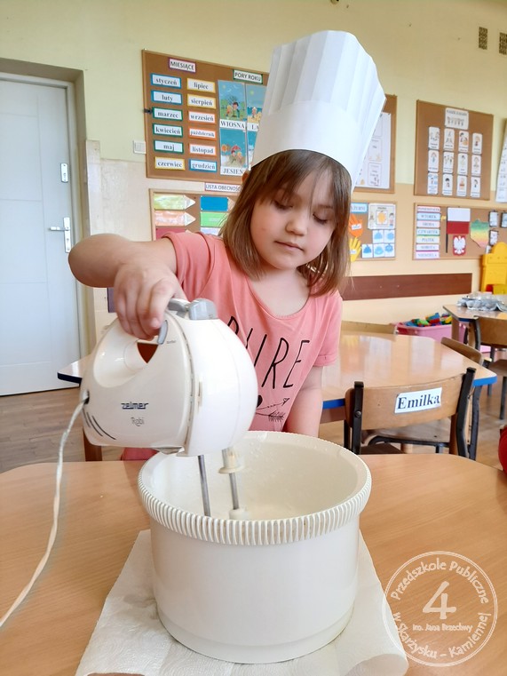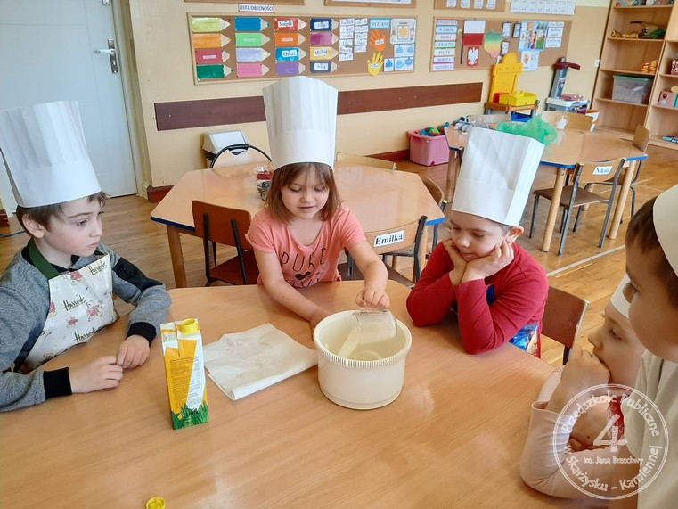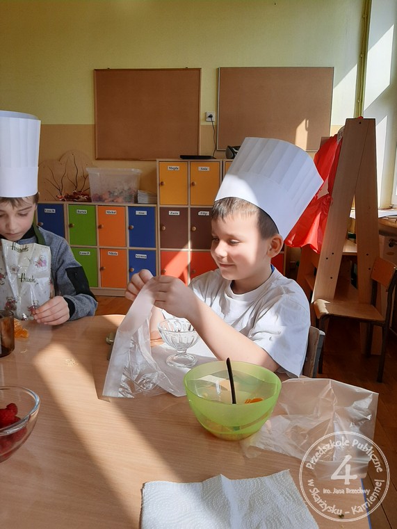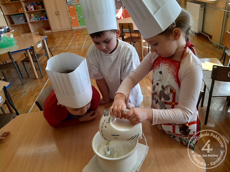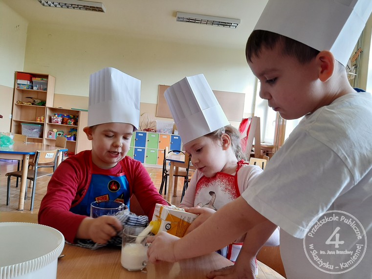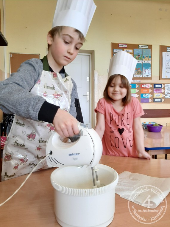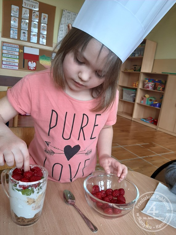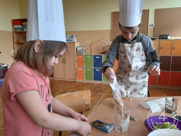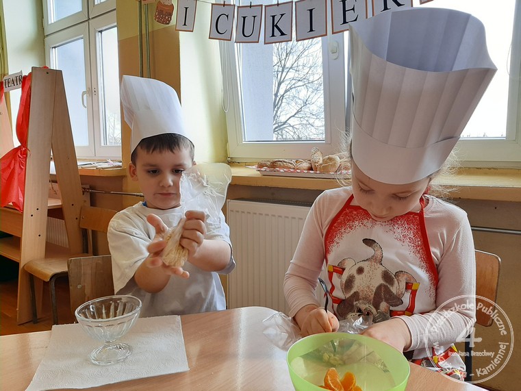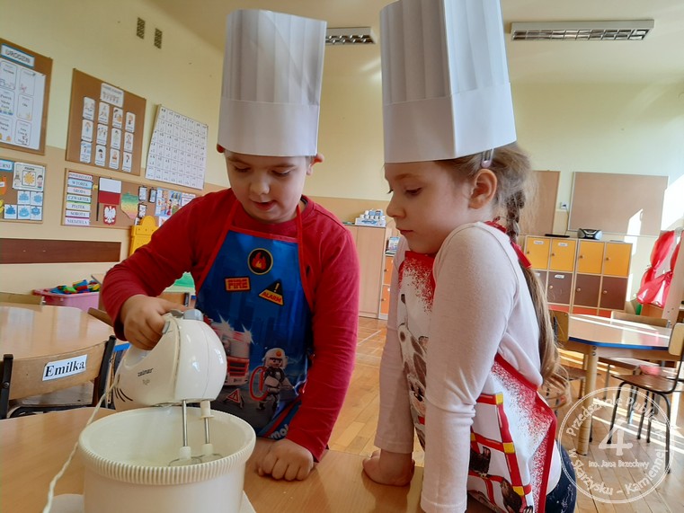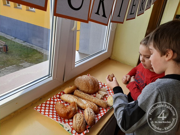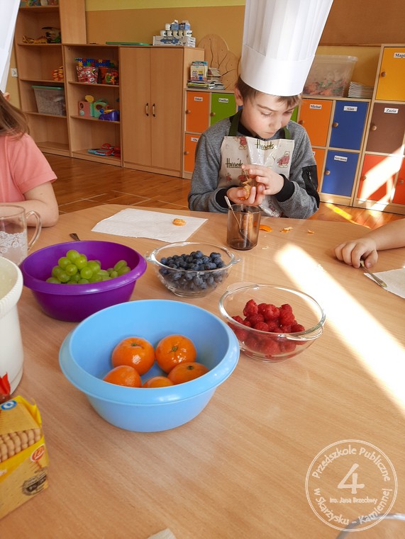 Przedszkolaki poznały pracę piekarza oraz funkcjonowanie piekarni na podstawie filmu „W piekarni”. Dowiedziały się także, jak powstaje chleb oraz poznały pracę poszczególnych osób w procesie powstawania chleba „od ziarenka do bochenka”. Następnie nazywały i degustowały różne rodzaje pieczywa. Na zakończenie dzieciaki zamieniły się w cukierników i samodzielnie przygotowały desery owocowe. Było smacznie!!!