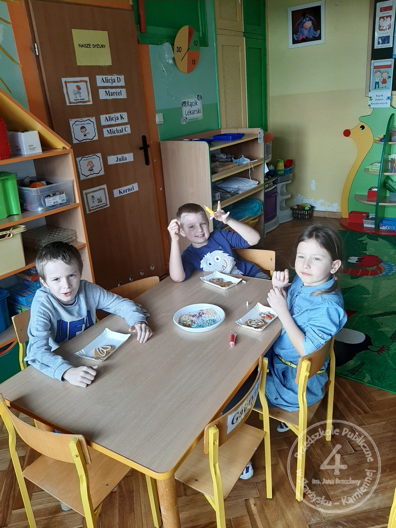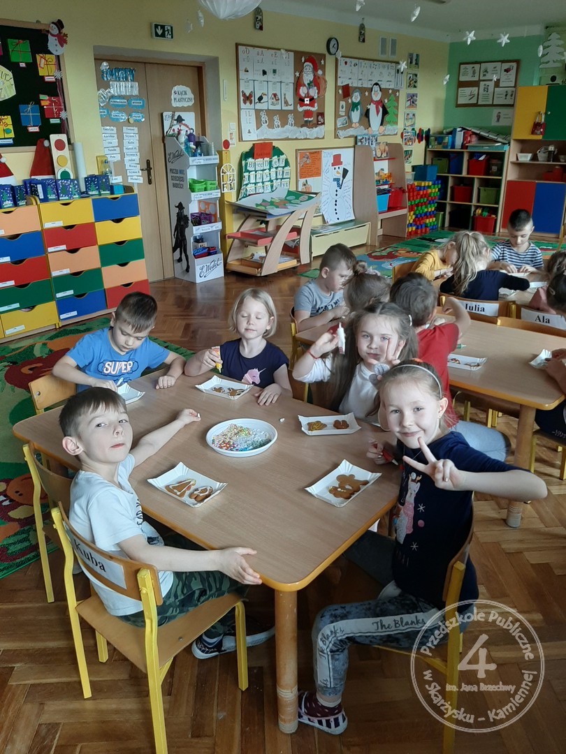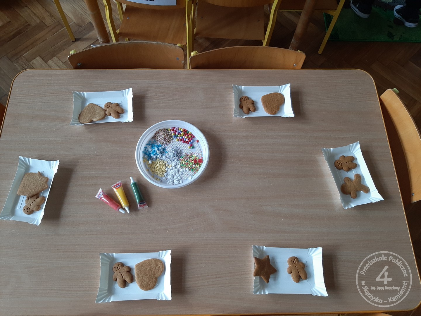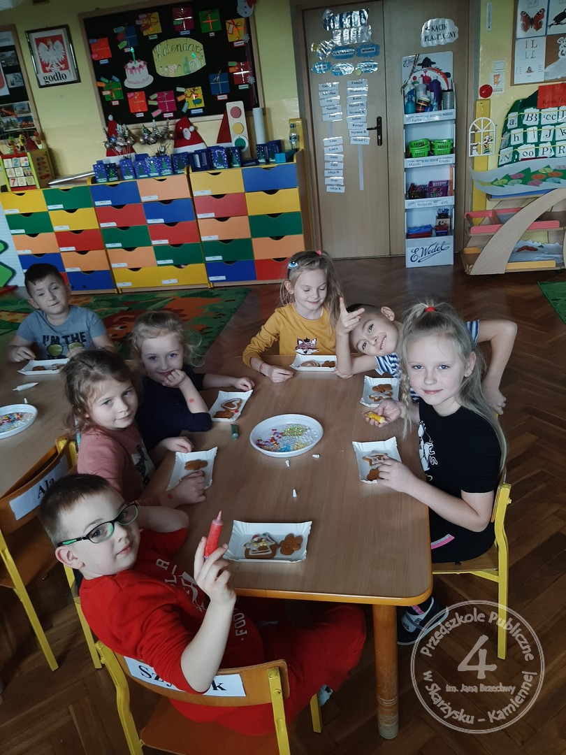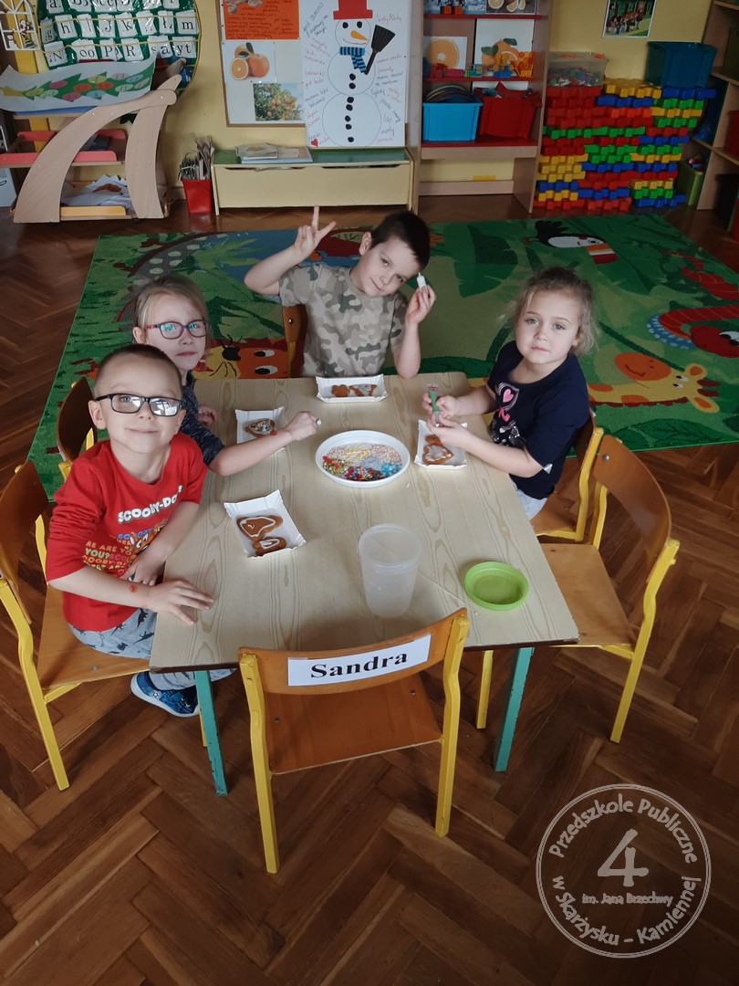 Smerfy brały udział w warsztatach z ozdabiania pierników, które zostały wcześniej wykonane przez mamę Antosia – panią Elżbietę. Dzieci najpierw dowiedziały jakich składników i przypraw używa się do produkcji ciasta. Dotykały, rozpoznawały po zapachu poszczególne przyprawy, po czym przyszła pora na dekorowanie. Z wielkim zaangażowaniem starszaki ozdabiały swoje ciasteczka różnokolorowym lukrem, a także barwną posypką. Każdy pierniczek był wyjątkowy i bardzo kolorowy. Później przyszedł czas na skosztowanie swoich słodkości.