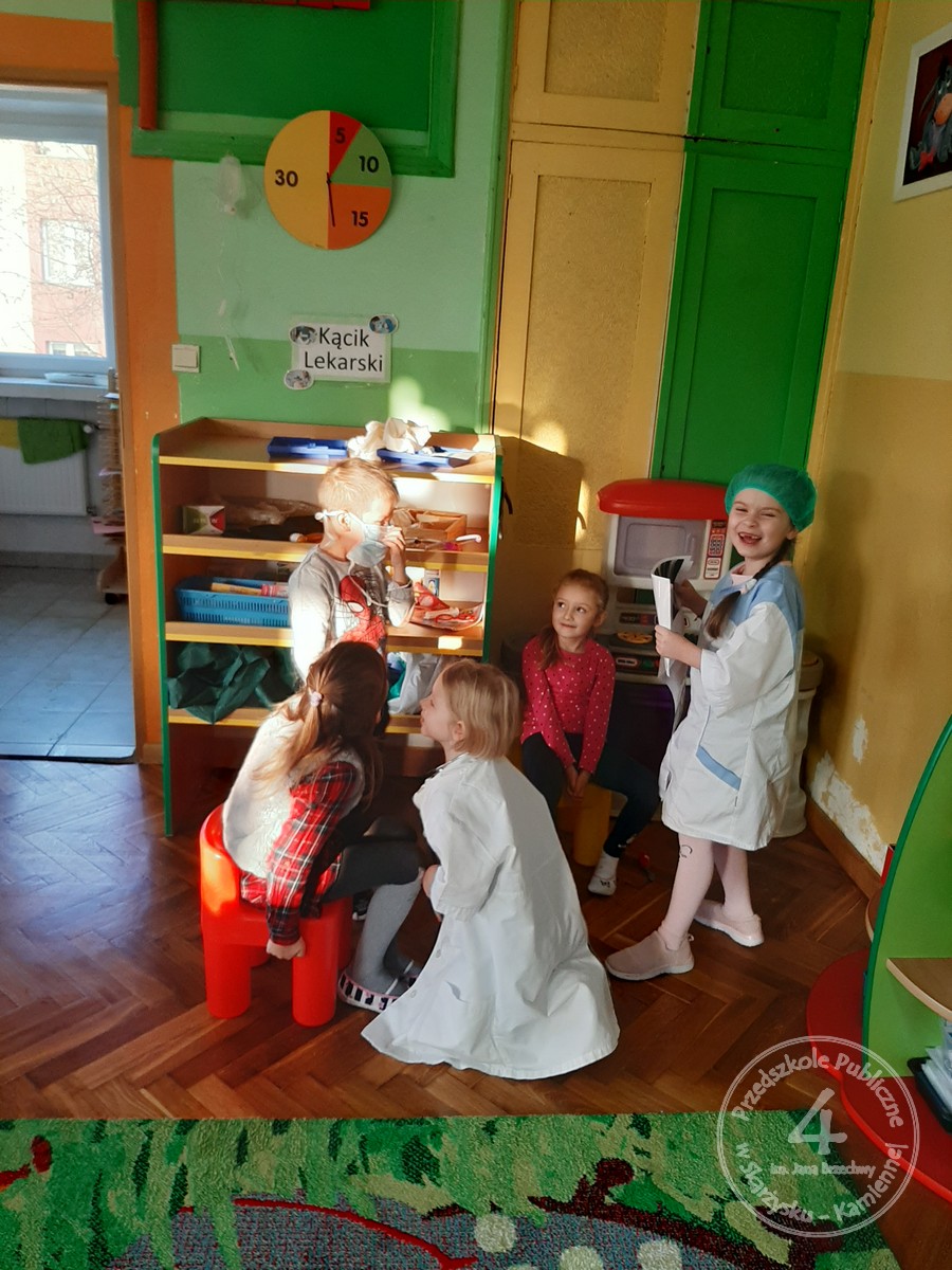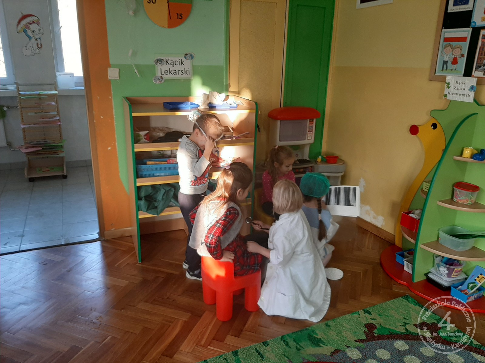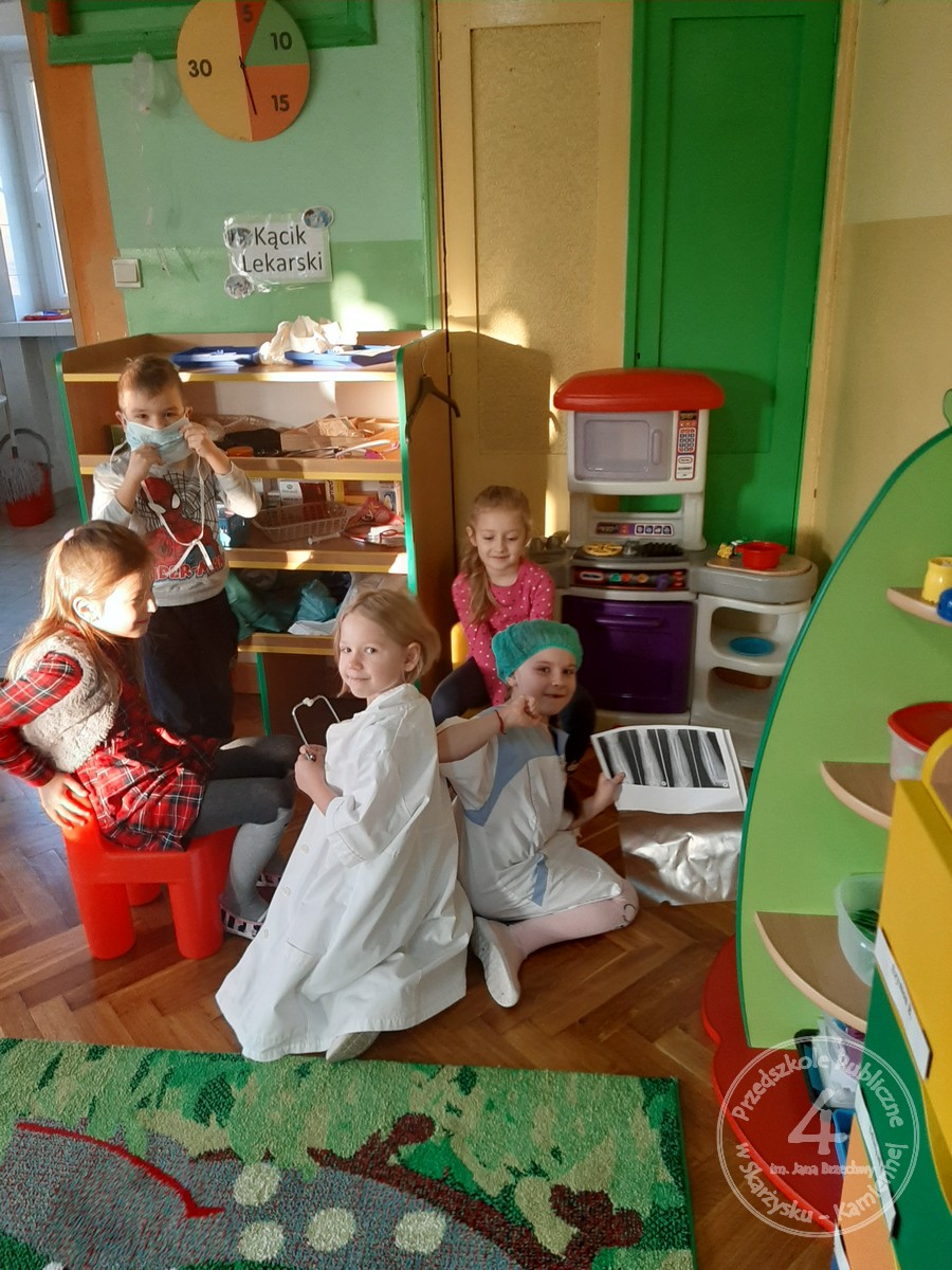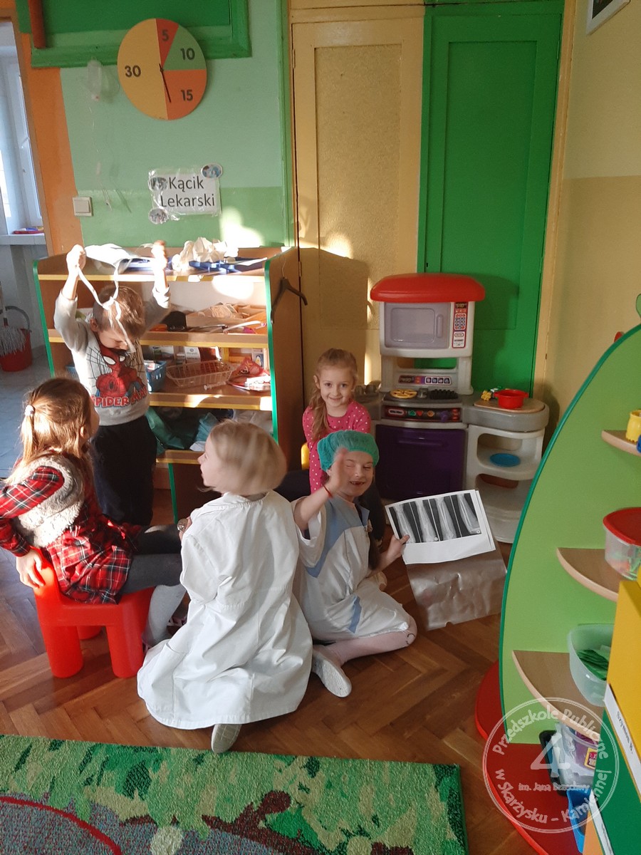 U Smerfów został zorganizowały kącik lekarski. Przedszkolaki utrwalały sobie wiadomości związane z zawodem lekarza, pielęgniarki oraz opowiadały o tym co robić, aby być zdrowym, jak dbać