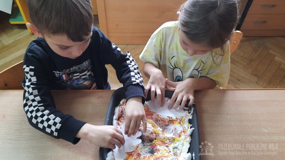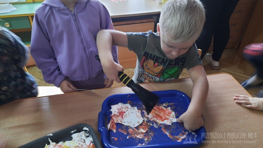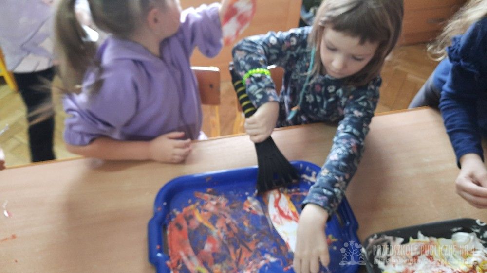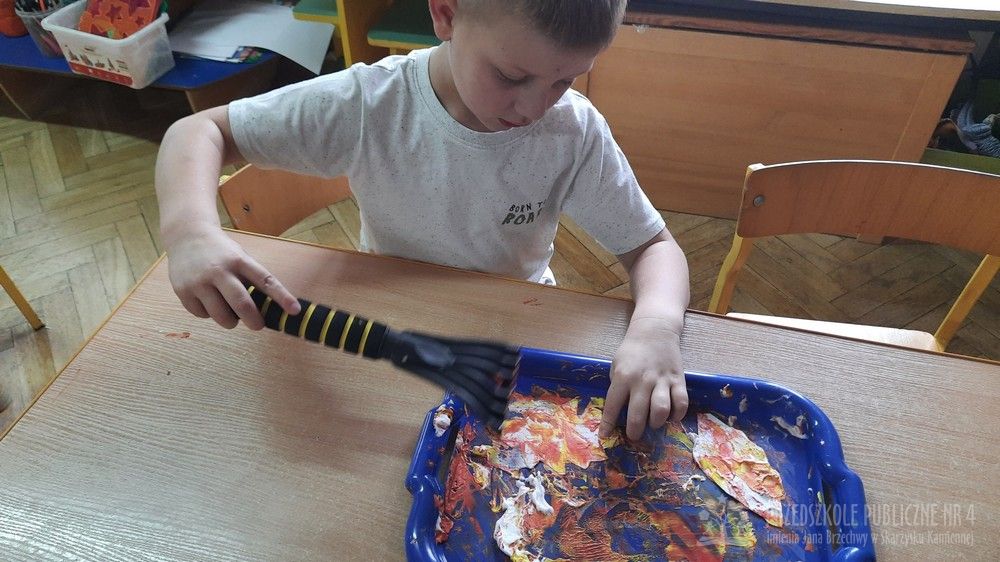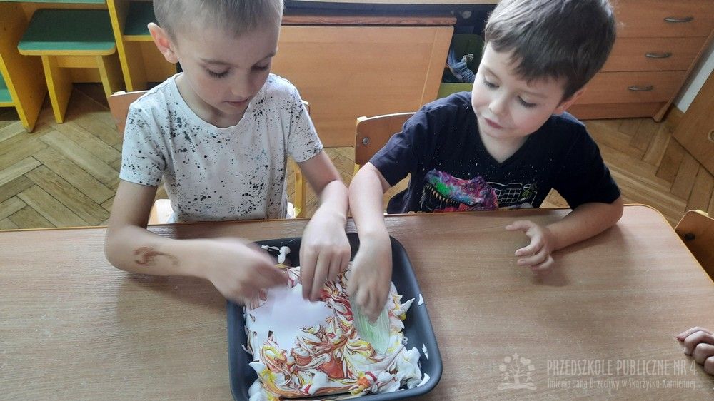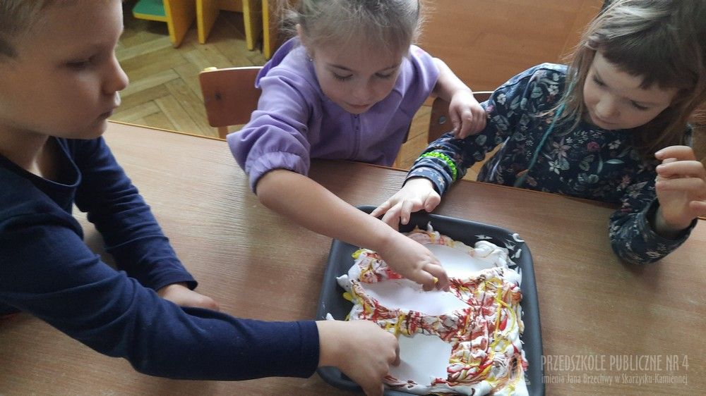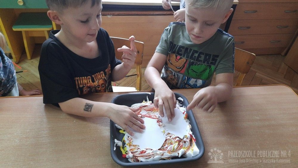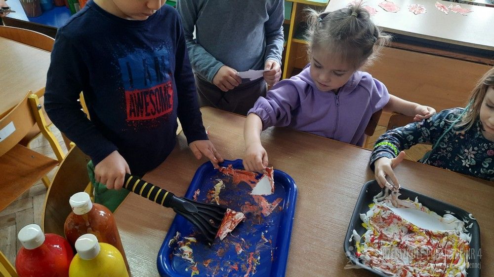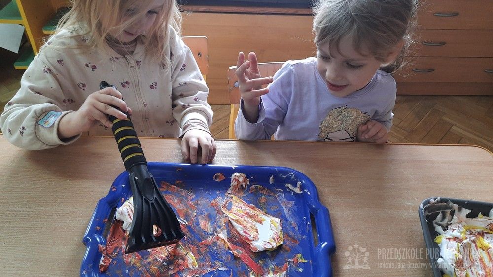 W ramach zajęć sensoplastycznych przedszkolaki wykonały listki w parach zadaniowych. Maczały samodzielnie wycięte kształty listków w piance do golenia połączoną z farbami. Następnie zbierały skrobaczką nadmiar pianki i tak powstały kazżdemu kolorowe listki.