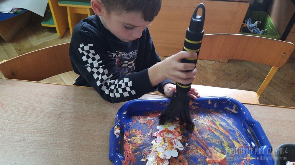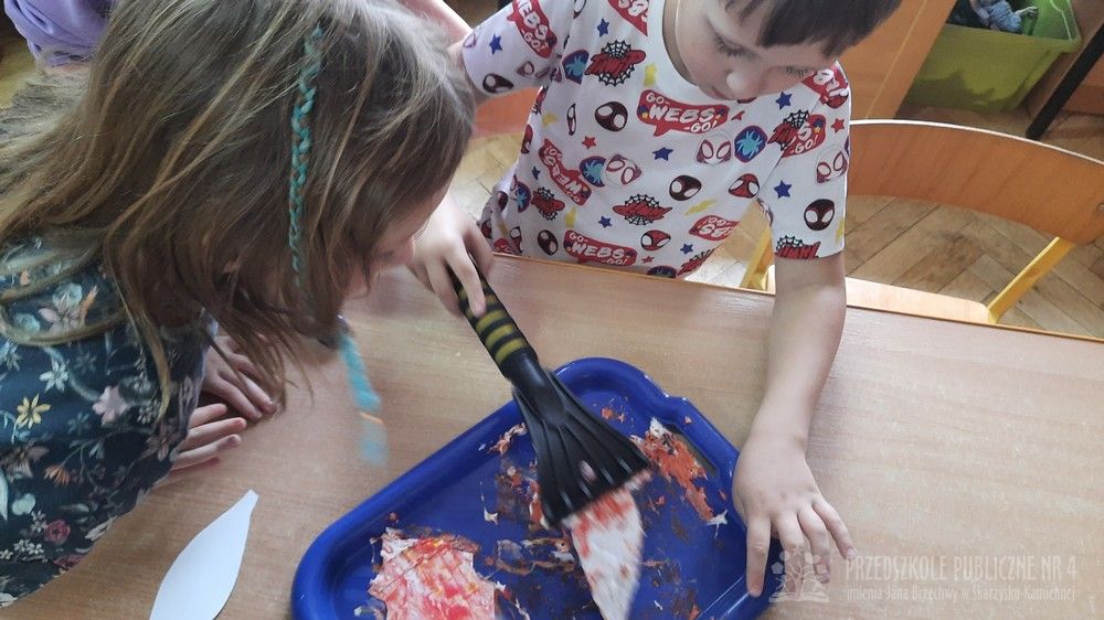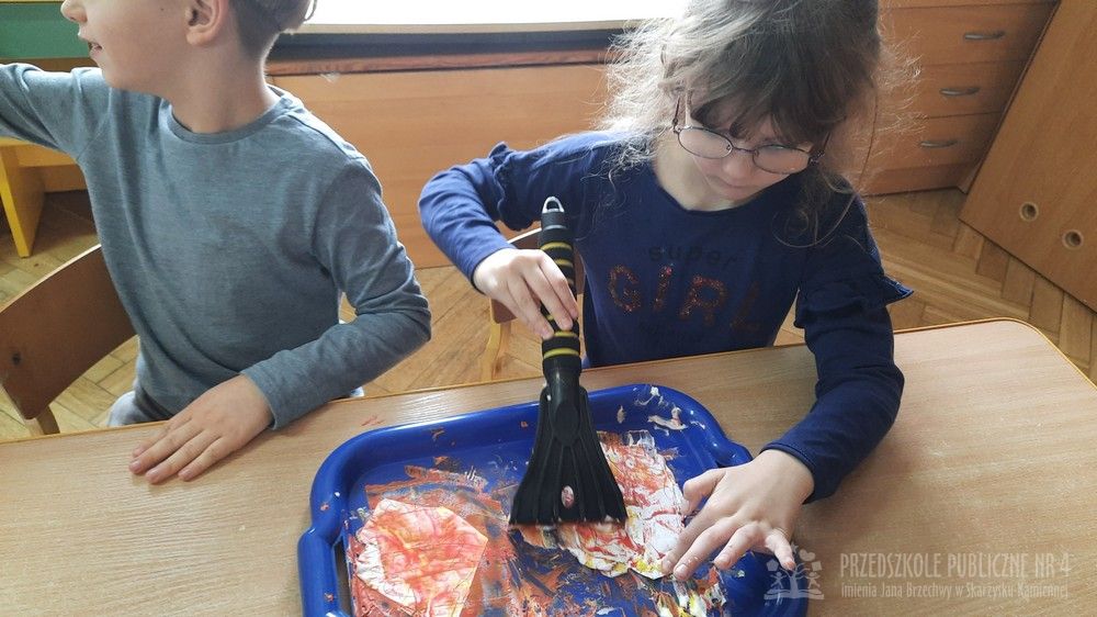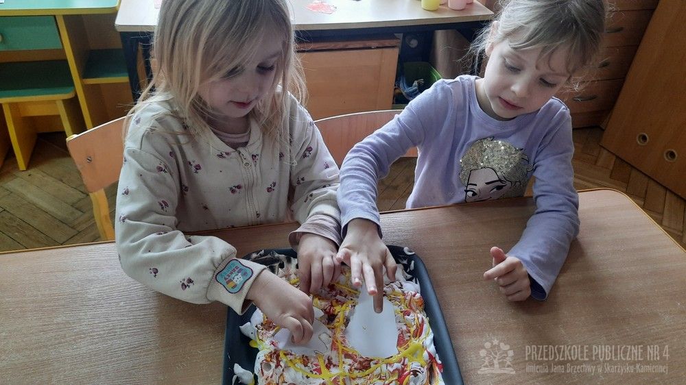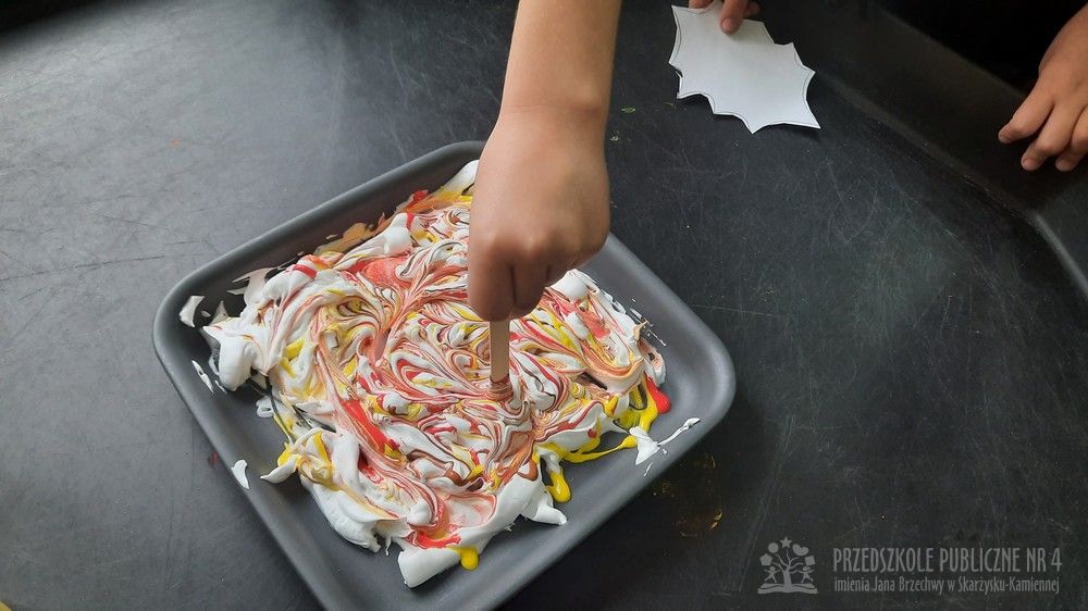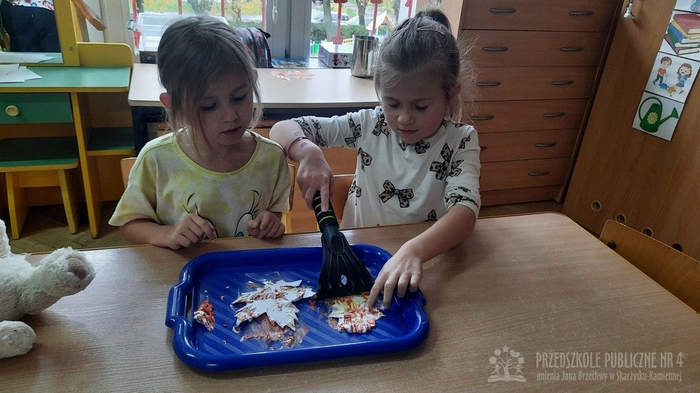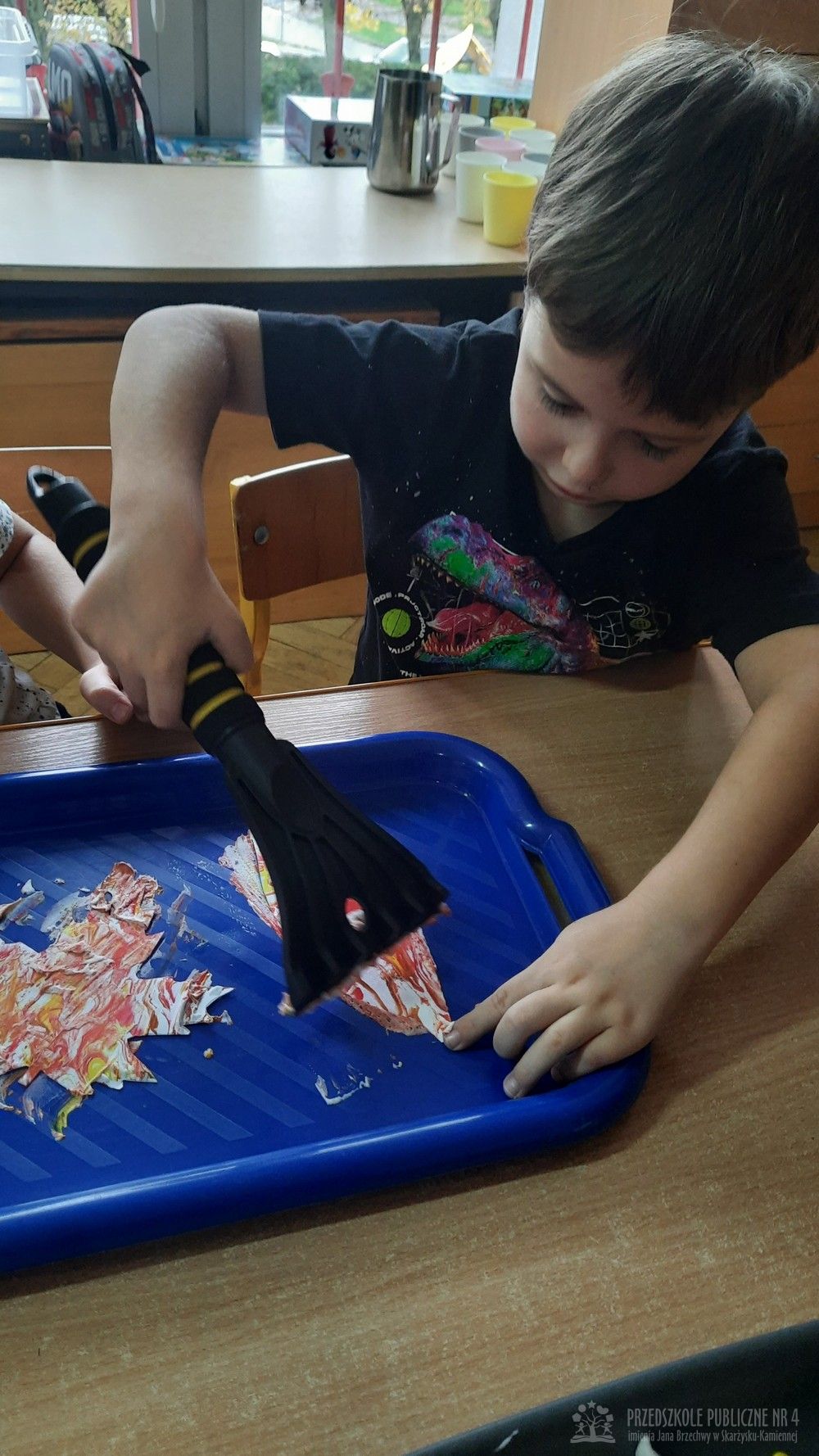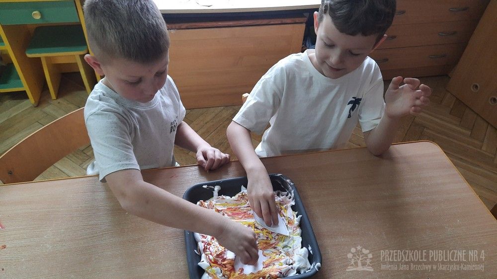 W ramach zajęć sensoplastycznych przedszkolaki wykonały listki w parach zadaniowych. Maczały samodzielnie wycięte kształty listków w piance do golenia połączoną z farbami. Następnie zbierały skrobaczką nadmiar pianki i tak powstały kazżdemu kolorowe listki.