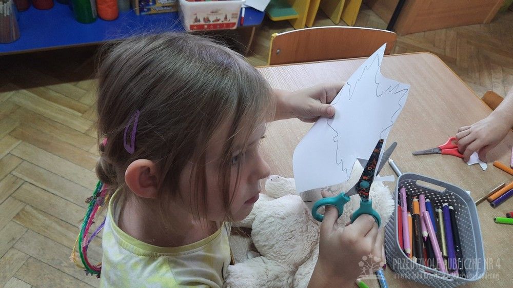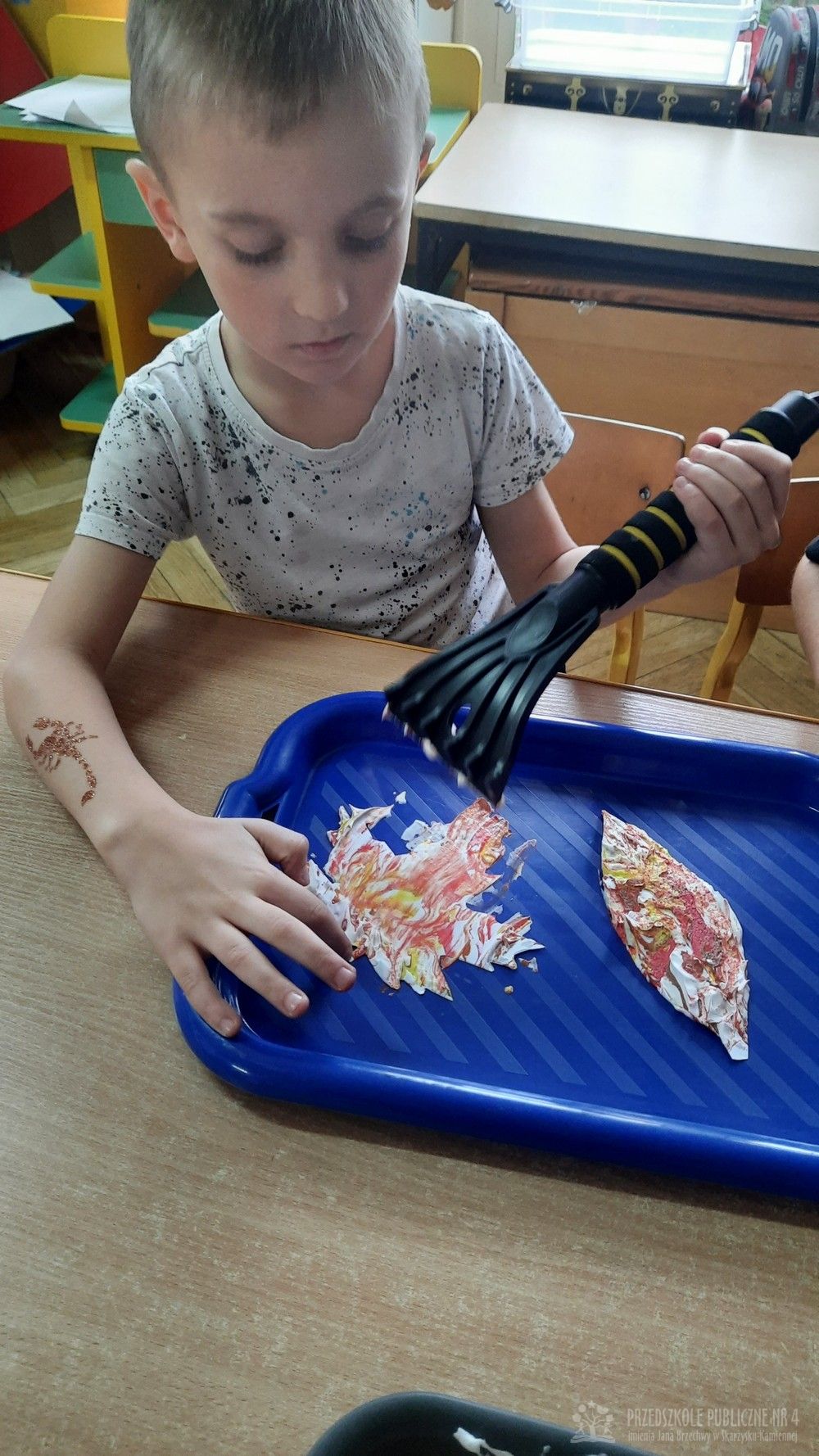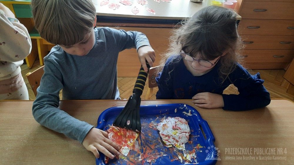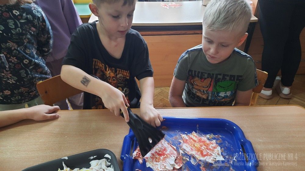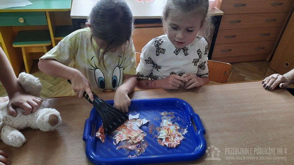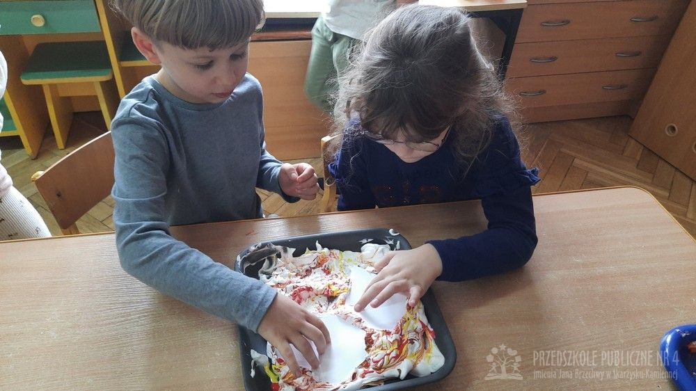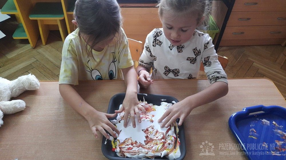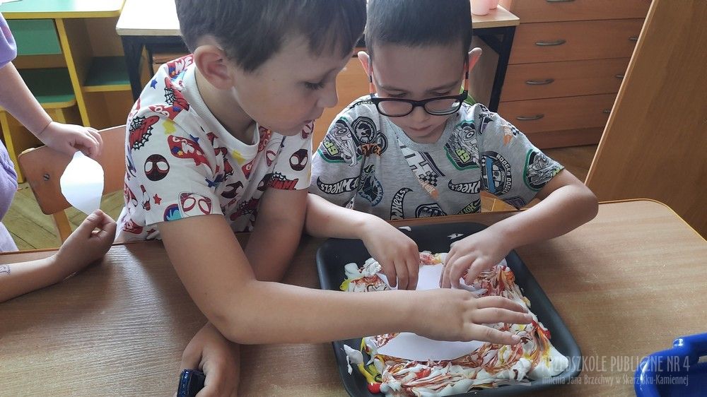 W ramach zajęć sensoplastycznych przedszkolaki wykonały listki w parach zadaniowych. Maczały samodzielnie wycięte kształty listków w piance do golenia połączoną z farbami. Następnie zbierały skrobaczką nadmiar pianki i tak powstały kazżdemu kolorowe listki.