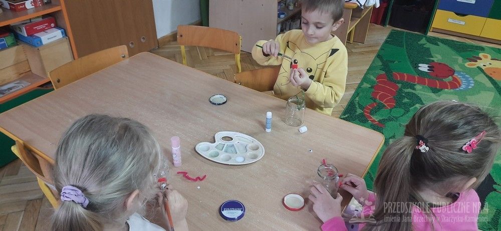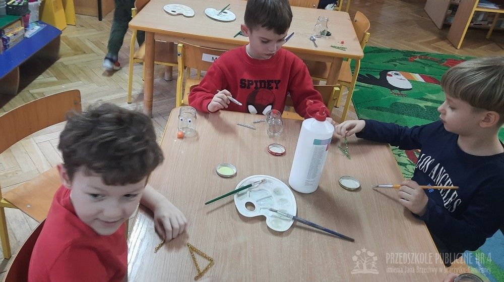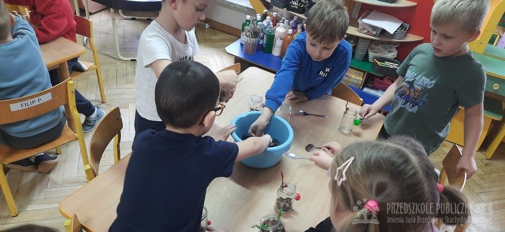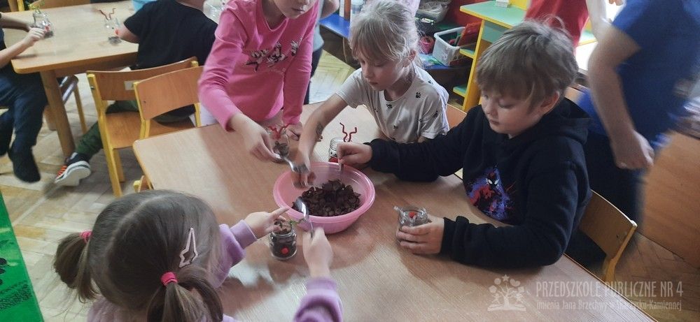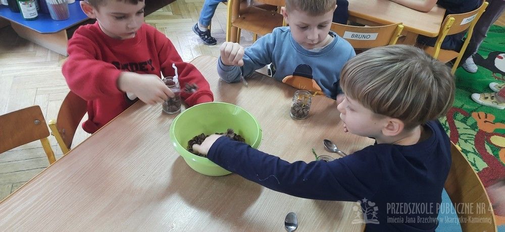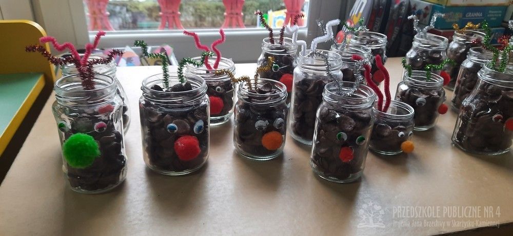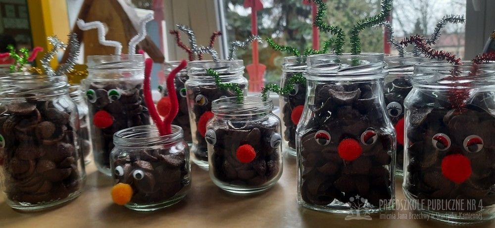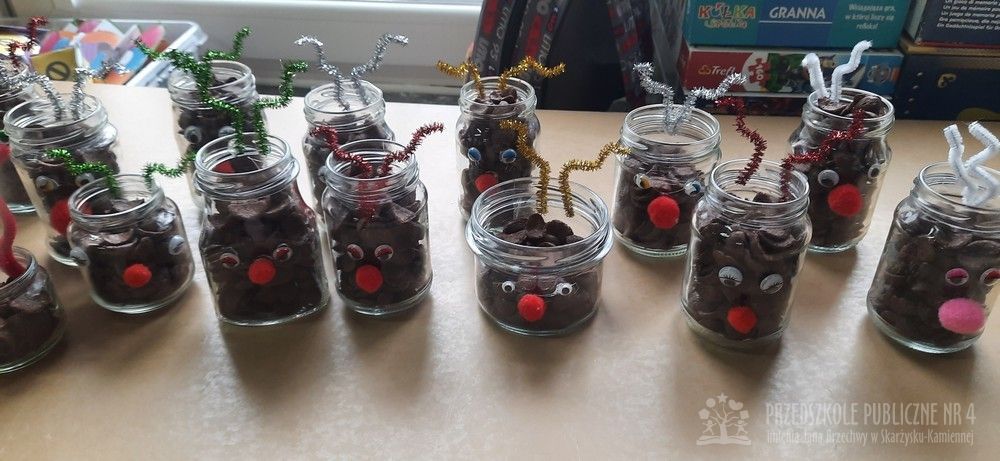 Dzieci z grupy Biedronki do słoiczka wsypały płatki czekoladowe. Przykleiły na słoiczku oczy, rogi i nosek. Tak powstał renifer.