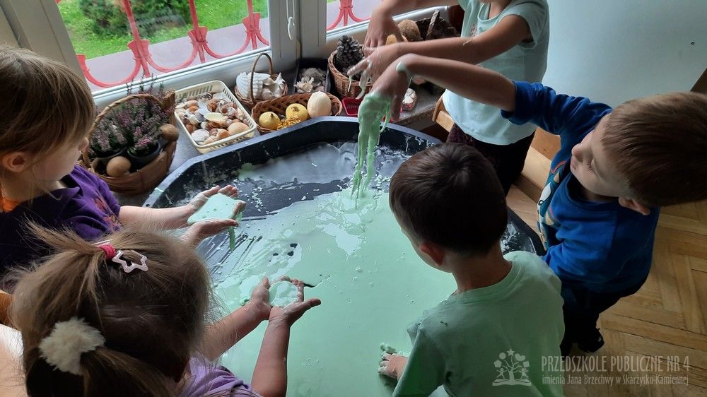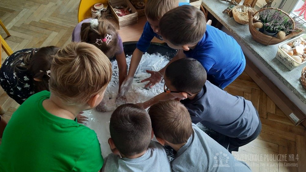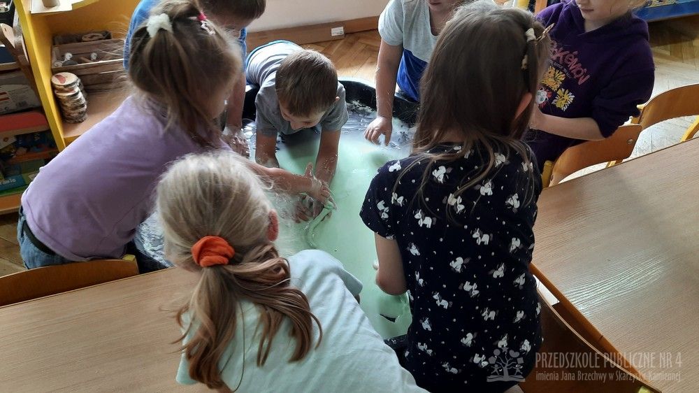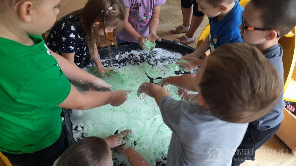 Zabawy cieczą nienewtonowską w grupie Biedroneczek w ramach zajęć sensorycznych. Ciecz nienewtonowska to mieszanina, której lepkość zmienia się w zależności od siły, jaką na nią wywieramy. Eksperyment z cieczą to doskonały sposób, by zobaczyć, jak różne mogą być właściwości płynów.