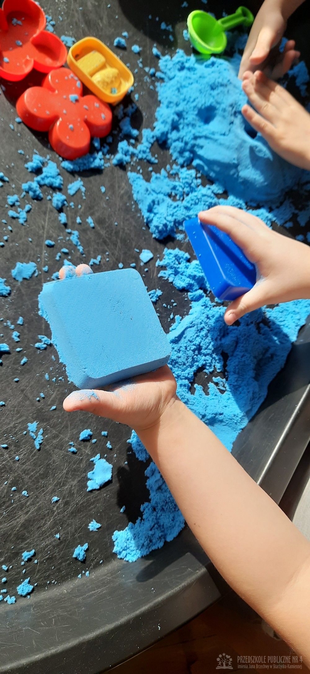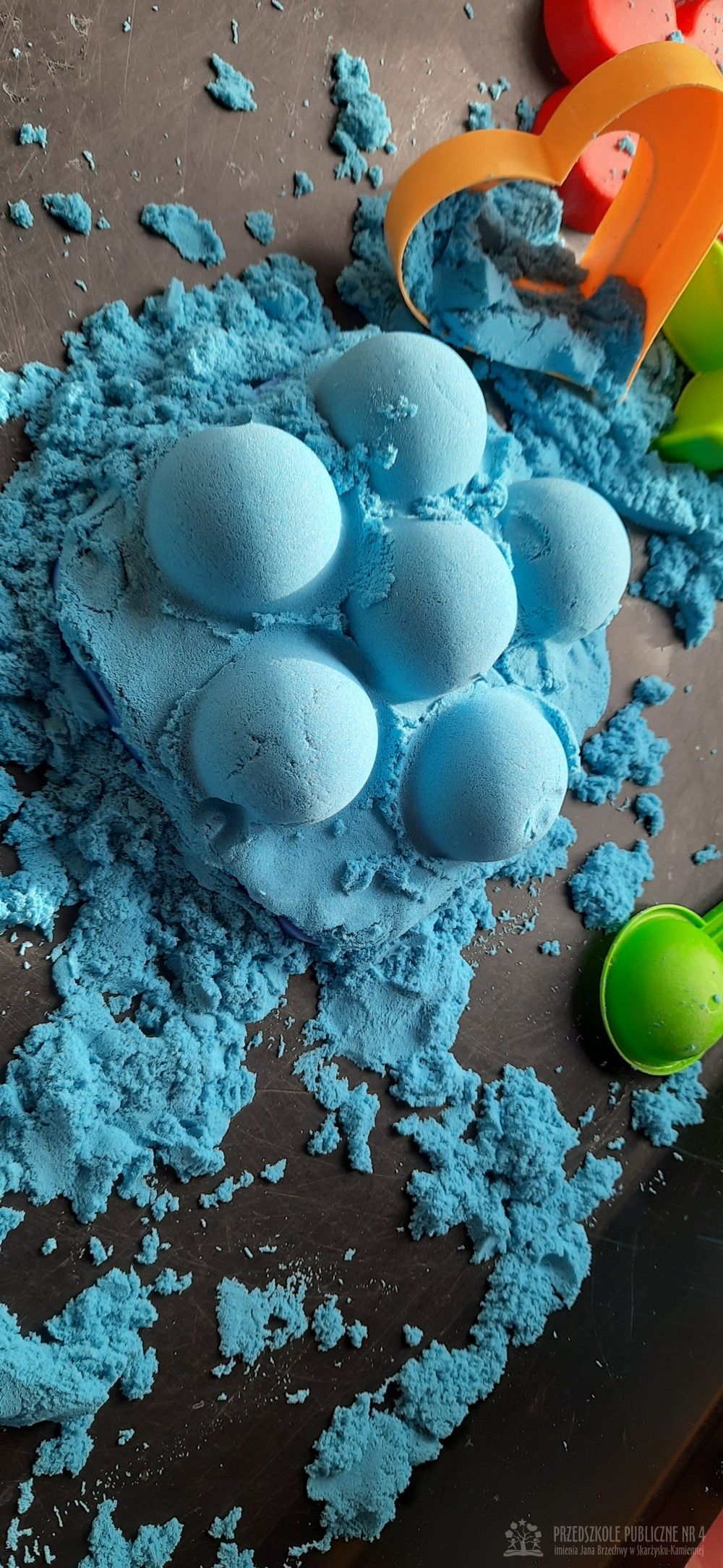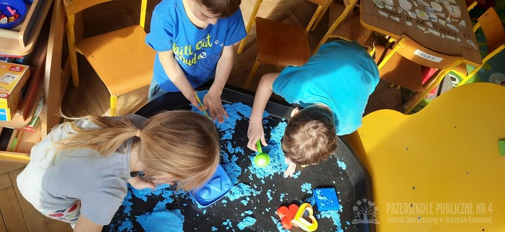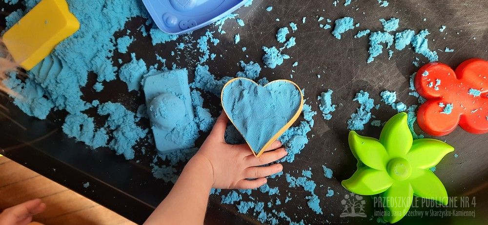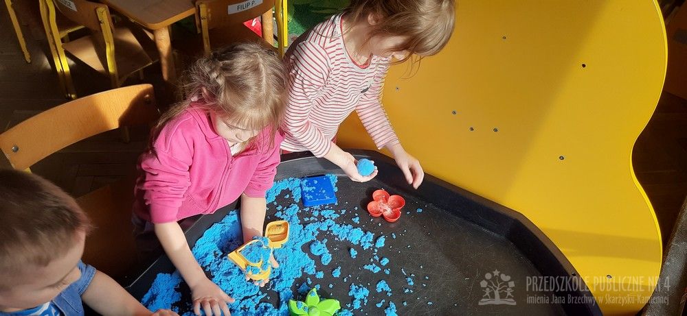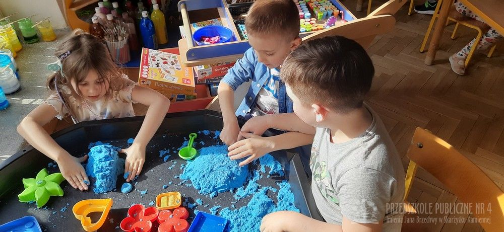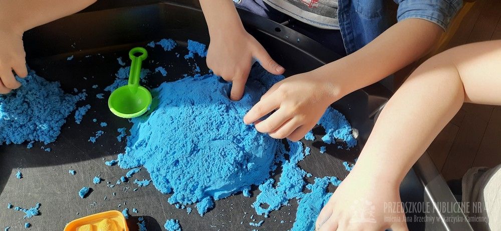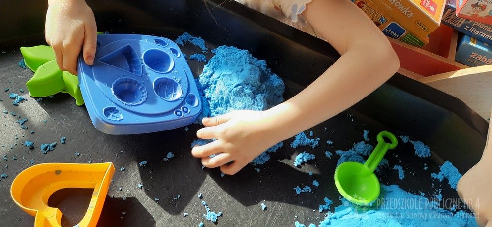 Zabawy sensoryczne z piaskiem kinetycznym doskonale rozwijają małą motorykę, kreatywność oraz działają relaksująco, pomagając w wyciszeniu. Dzieci mogą ugniatać, kroić, formować budowle i przesypywać piasek, co stymuluje zmysł dotyku.
