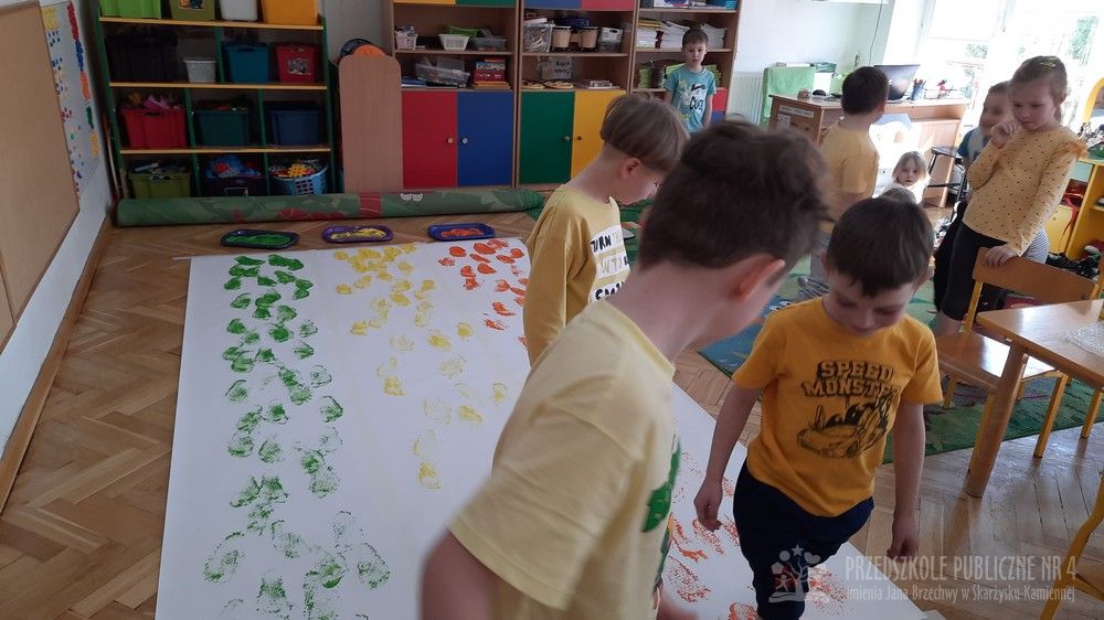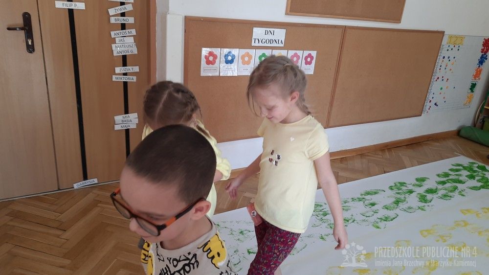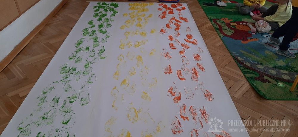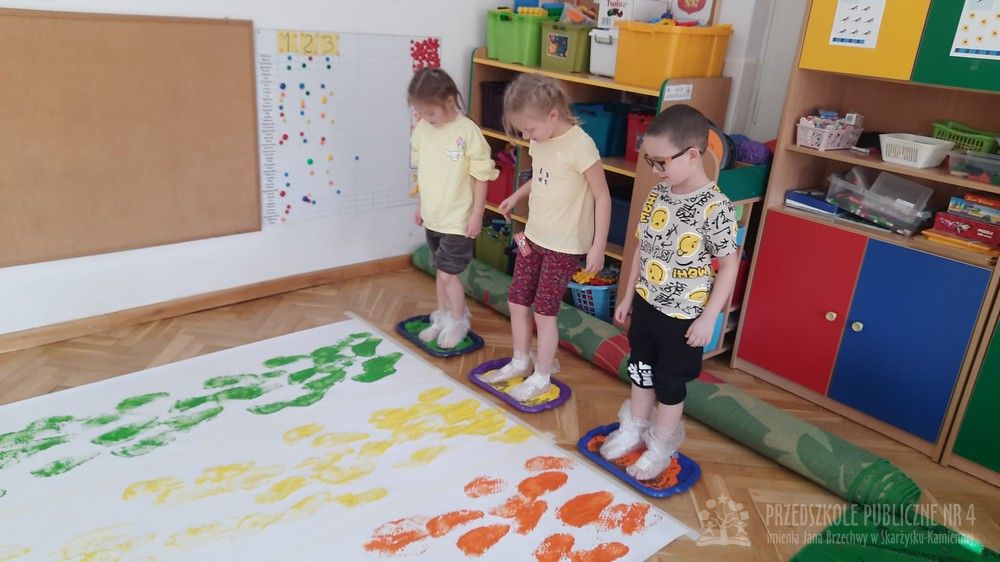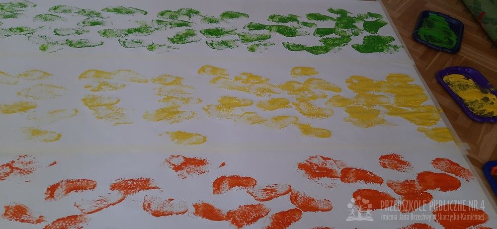 Tym razem starszaki na dodatkowych zajęciach sensoryczno-sensoplastycznych malowały stopami. Na stopach dzieci miały folie bąbelkową. Nóżki zamaczały w farbach i odbijały je na dużym arkuszu papieru. Sensoplastyka oddziałuje na wszystkie zmysły jednocześnie i pomaga dzieciom rozwijać nieskrępowaną aktywność na wszelkich płaszczyznach.