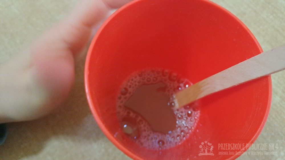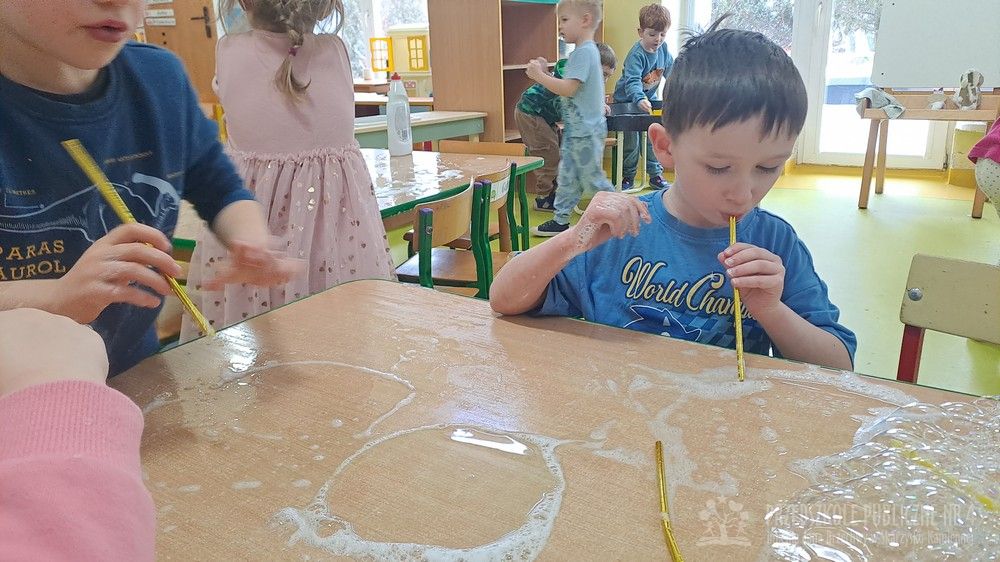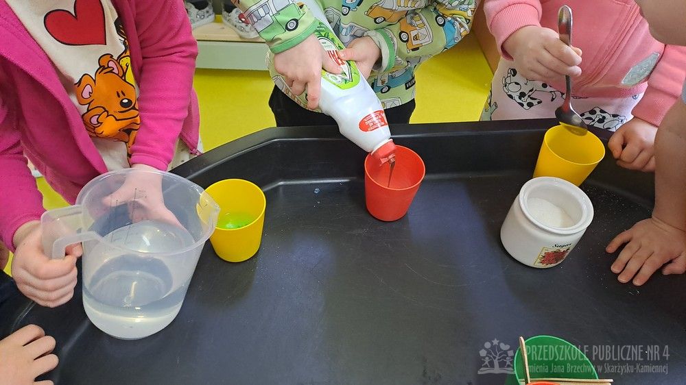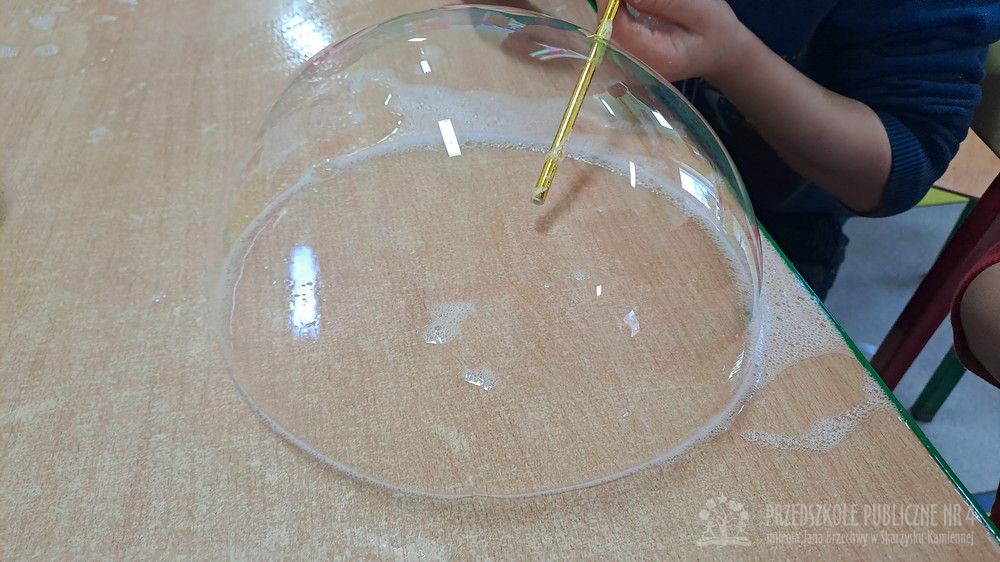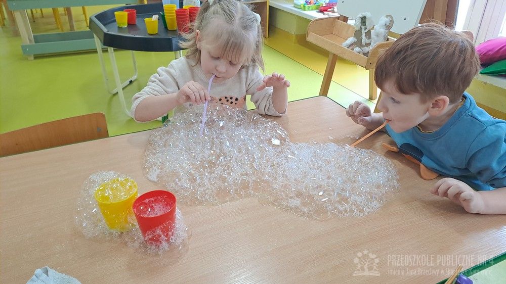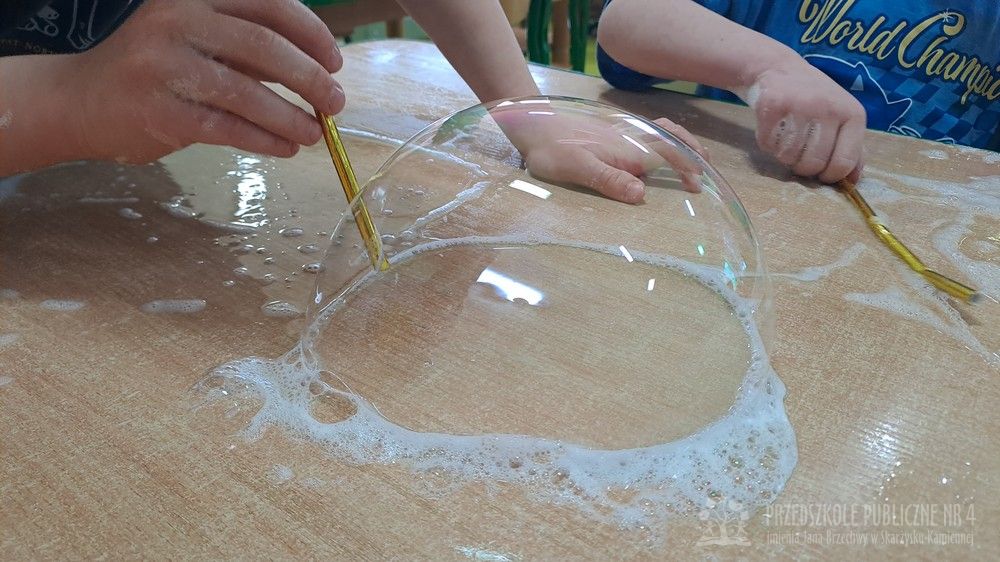Eksperyment polegał na samodzielnym przygotowaniu przez dzieci mikstury do baniek mydlanych z wody, cukru oraz płynu do naczyń. Dzieci aktywnie uczestniczyły w całym procesie – samodzielnie dodawały składniki, odmierzały je oraz mieszały, obserwując zmiany zachodzące w powstającym roztworze. Zgodnie z koncepcją planu daltońskiego nauczyciel pełnił jedynie rolę osoby wspierającej i czuwającej nad bezpieczeństwem, pozostawiając dzieciom swobodę działania i podejmowania prostych decyzji. Po przygotowaniu mikstury dzieci przystąpiły do dmuchania baniek mydlanych, co sprawiło im wiele radości i było naturalnym przedłużeniem eksperymentu. Zajęcia rozwijały samodzielność, wiarę we własne możliwości oraz uczyły odpowiedzialności za wykonywane czynności. Dzieci ćwiczyły także koordynację wzrokowo-ruchową, koncentrację oraz cierpliwość. Dmuchanie baniek stanowiło dodatkowo doskonałe ćwiczenie oddechowe – dzieci trenowały prawidłowy, spokojny wydech, co wspiera rozwój aparatu mowy i ogólną sprawność oddechową. Zajęcia łączyły w sobie elementy eksperymentowania, zabawy i nauki, dostarczając dzieciom pozytywnych emocji oraz cennych doświadczeń edukacyjnych.