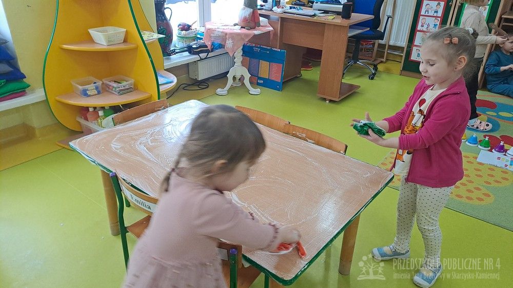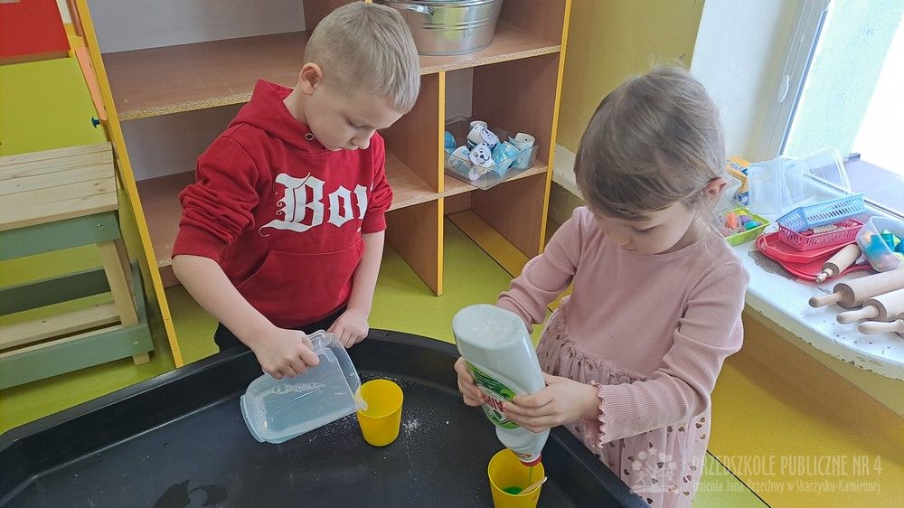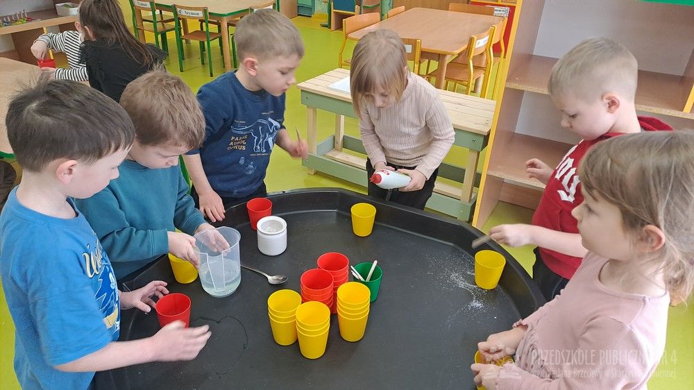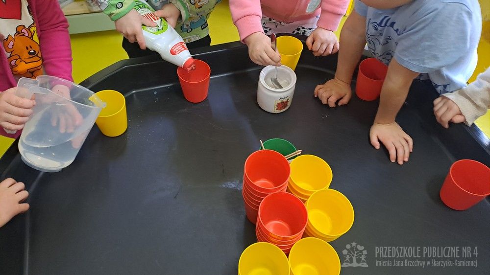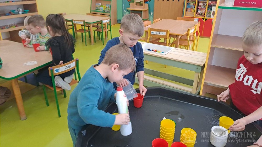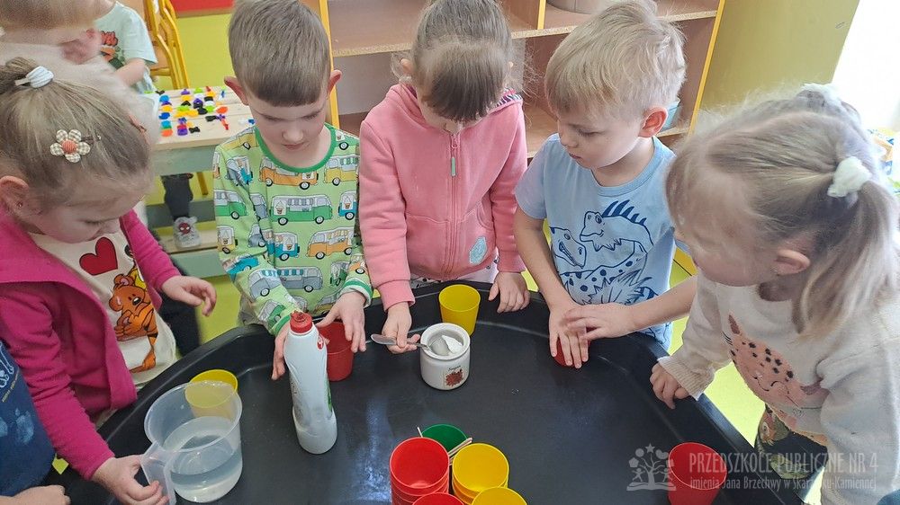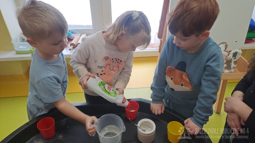 Eksperyment polegał na samodzielnym przygotowaniu przez dzieci mikstury do baniek mydlanych z wody, cukru oraz płynu do naczyń. Dzieci aktywnie uczestniczyły w całym procesie – samodzielnie dodawały składniki, odmierzały je oraz mieszały, obserwując zmiany zachodzące w powstającym roztworze. Zgodnie z koncepcją planu daltońskiego nauczyciel pełnił jedynie rolę osoby wspierającej i czuwającej nad bezpieczeństwem, pozostawiając dzieciom swobodę działania i podejmowania prostych decyzji. Po przygotowaniu mikstury dzieci przystąpiły do dmuchania baniek mydlanych, co sprawiło im wiele radości i było naturalnym przedłużeniem eksperymentu. Zajęcia rozwijały samodzielność, wiarę we własne możliwości oraz uczyły odpowiedzialności za wykonywane czynności. Dzieci ćwiczyły także koordynację wzrokowo-ruchową, koncentrację oraz cierpliwość. Dmuchanie baniek stanowiło dodatkowo doskonałe ćwiczenie oddechowe – dzieci trenowały prawidłowy, spokojny wydech, co wspiera rozwój aparatu mowy i ogólną sprawność oddechową. Zajęcia łączyły w sobie elementy eksperymentowania, zabawy i nauki, dostarczając dzieciom pozytywnych emocji oraz cennych doświadczeń edukacyjnych.