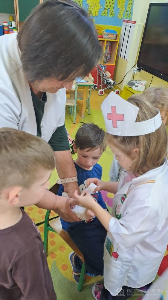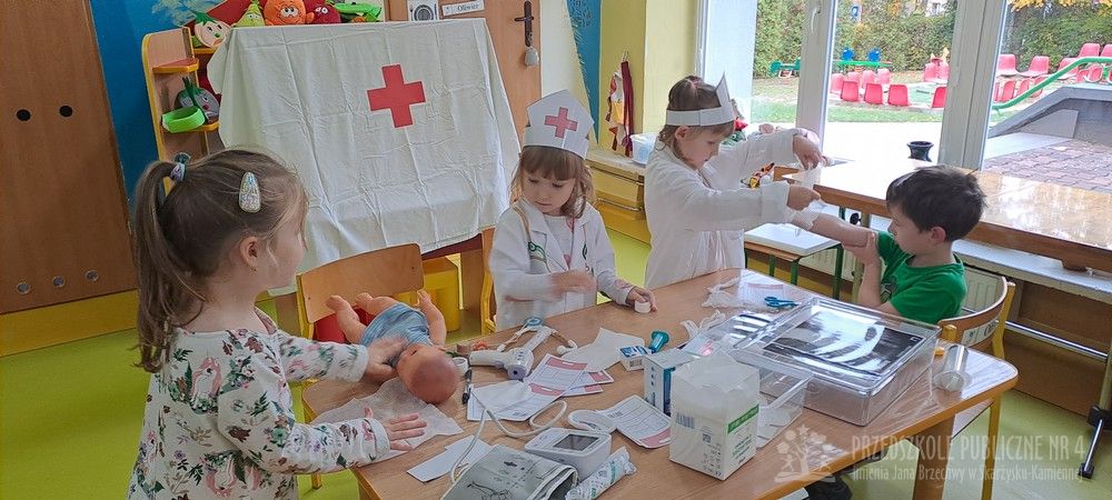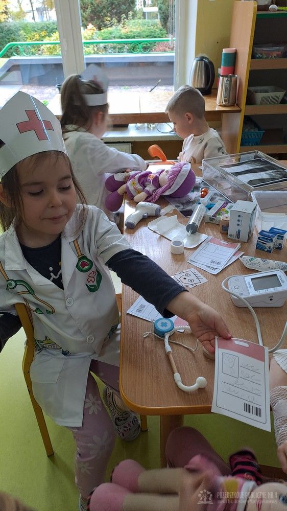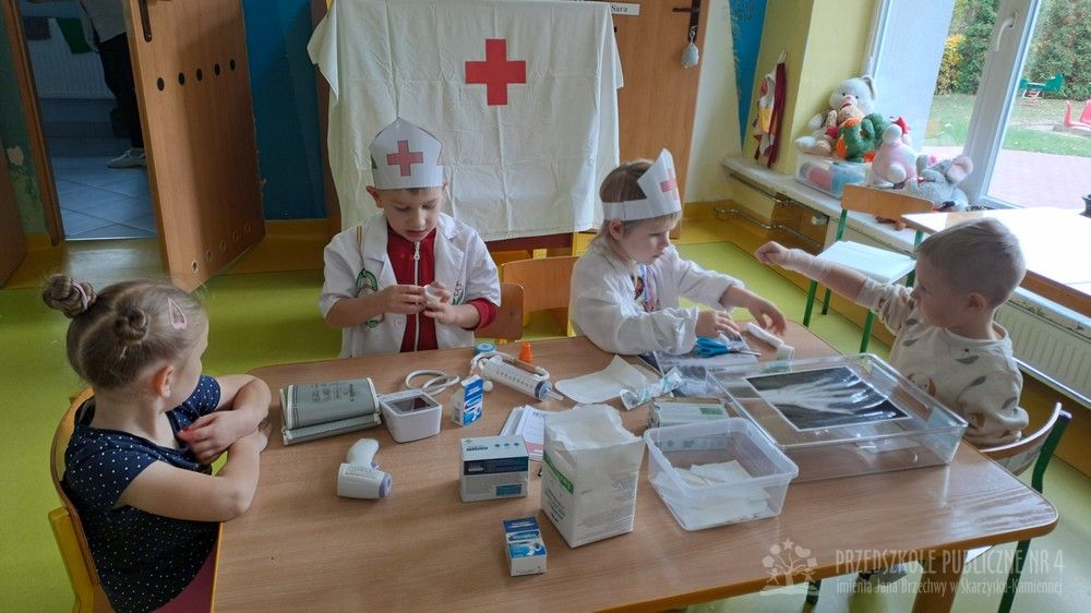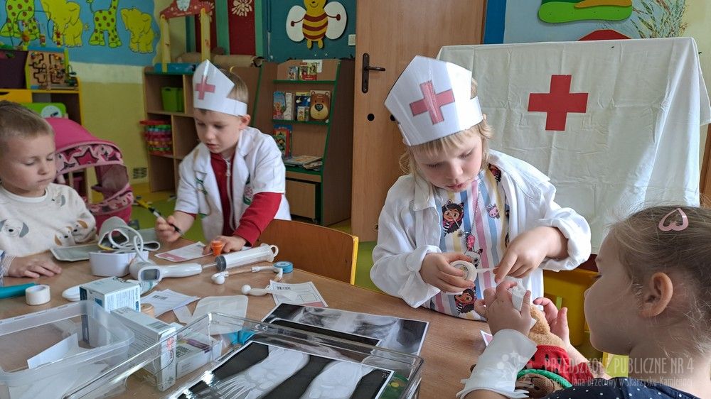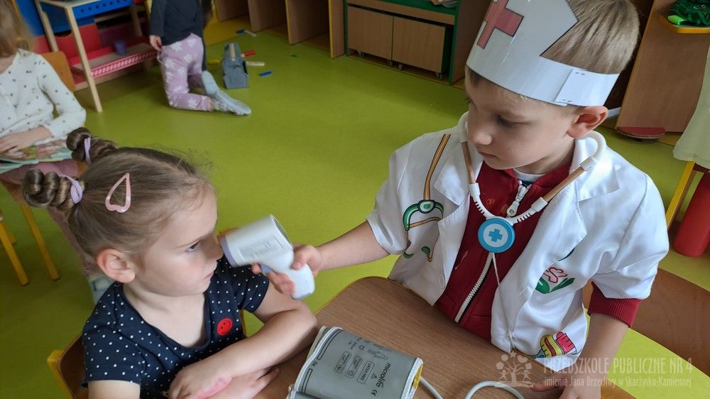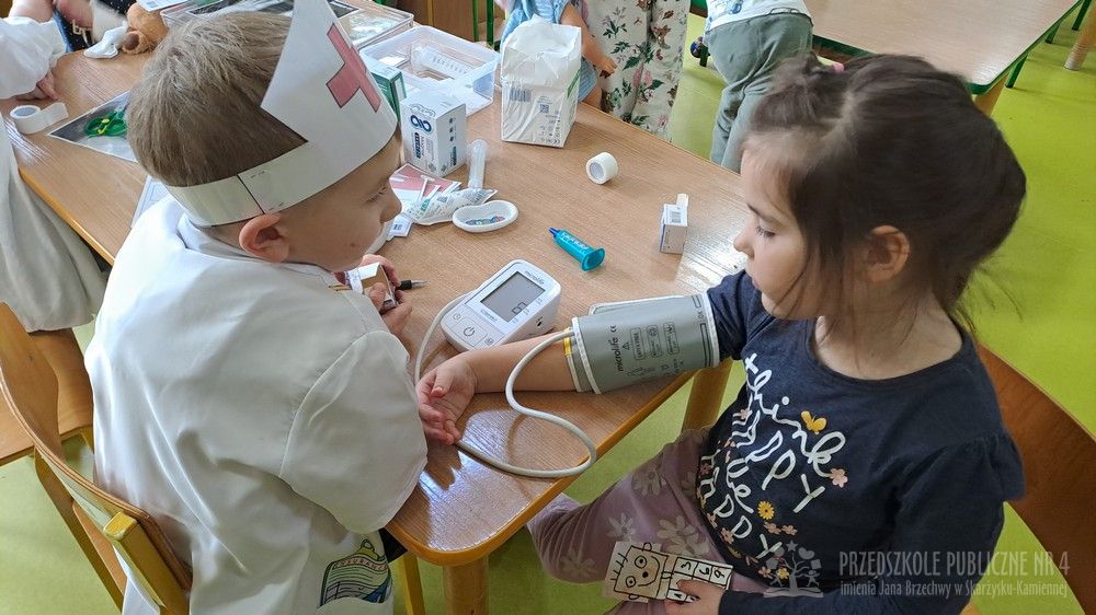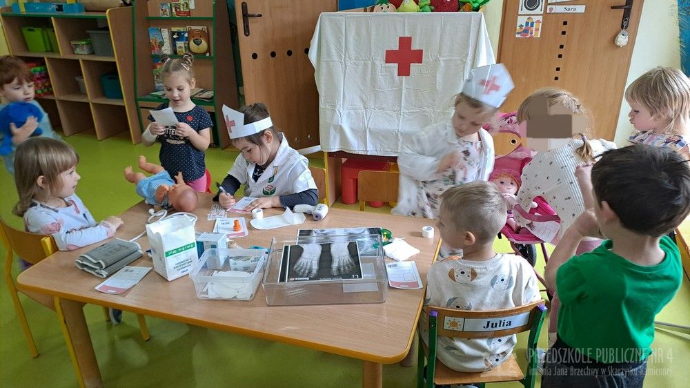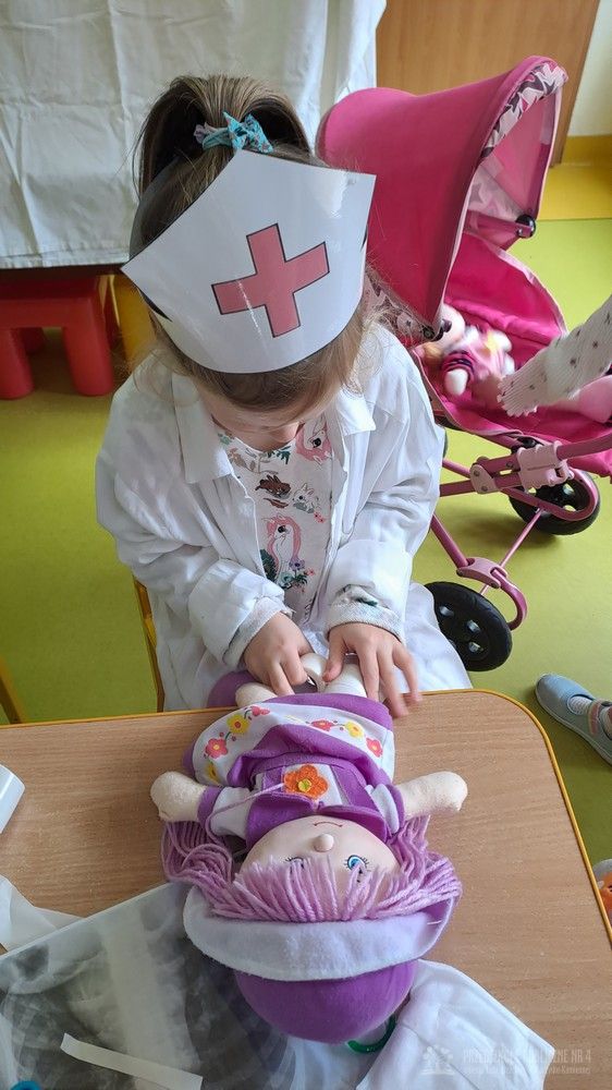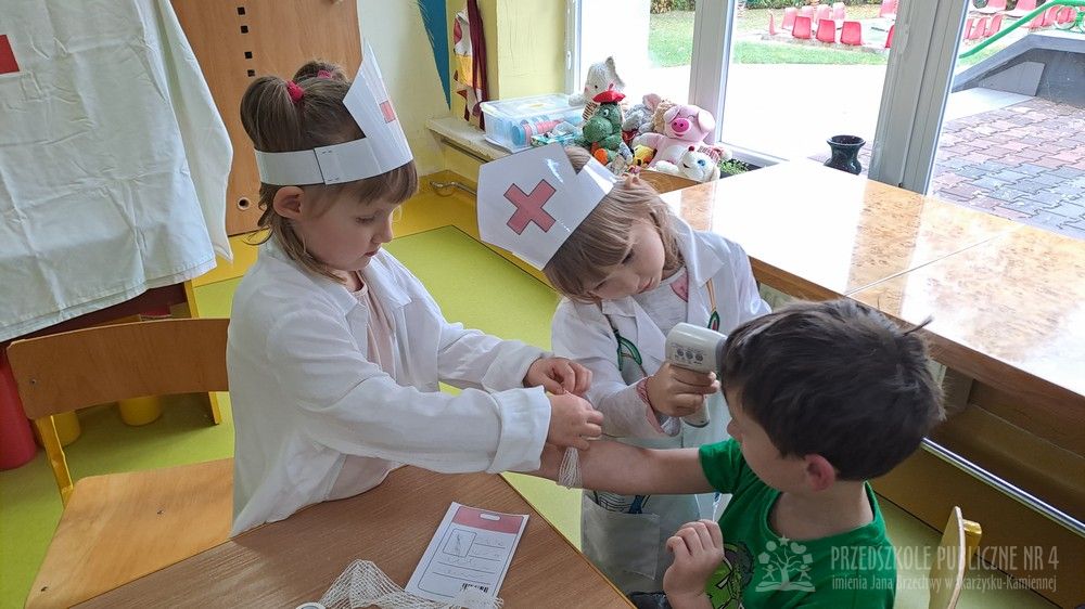 Zdrowie to bardzo ważna sprawa, wiedzą już o tym wszystkie Krasnale. W ostatnim czasie w naszej grupie zajmowaliśmy się tematem zdrowia. W toku zabaw dzieci poznały zasady zdrowego odżywiania oraz przygotowały szaszłyki owocowe, które były przepyszne. Gościliśmy w naszej grupie panią pielęgniarkę, która opowiedziała dzieciom o tym, jak zachować zasady higieny i zdrowego stylu życia. Krasnale dowiedziały się również, na czym polega praca pielęgniarki. Następnie miały okazję wcielić się role pracowników służby zdrowia - lekarza i pielęgniarki. Poprzez zabawę i aktywne działanie dzieci poznały atrybuty i narzędzia pracy przedstawicieli tych zawodów.