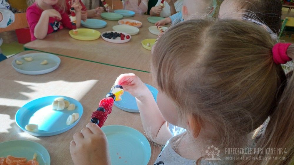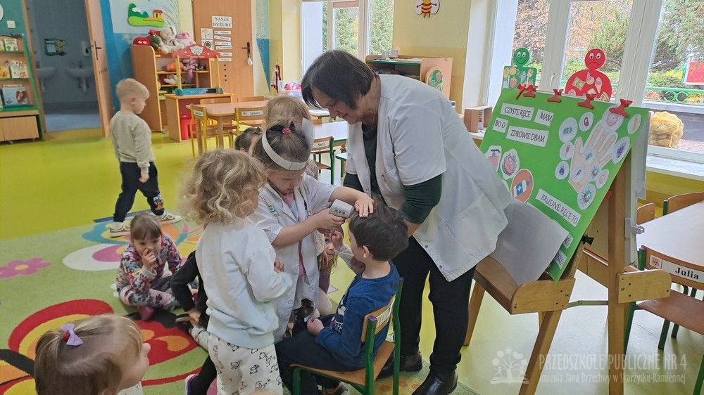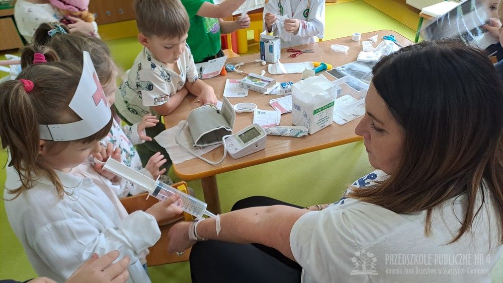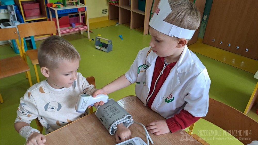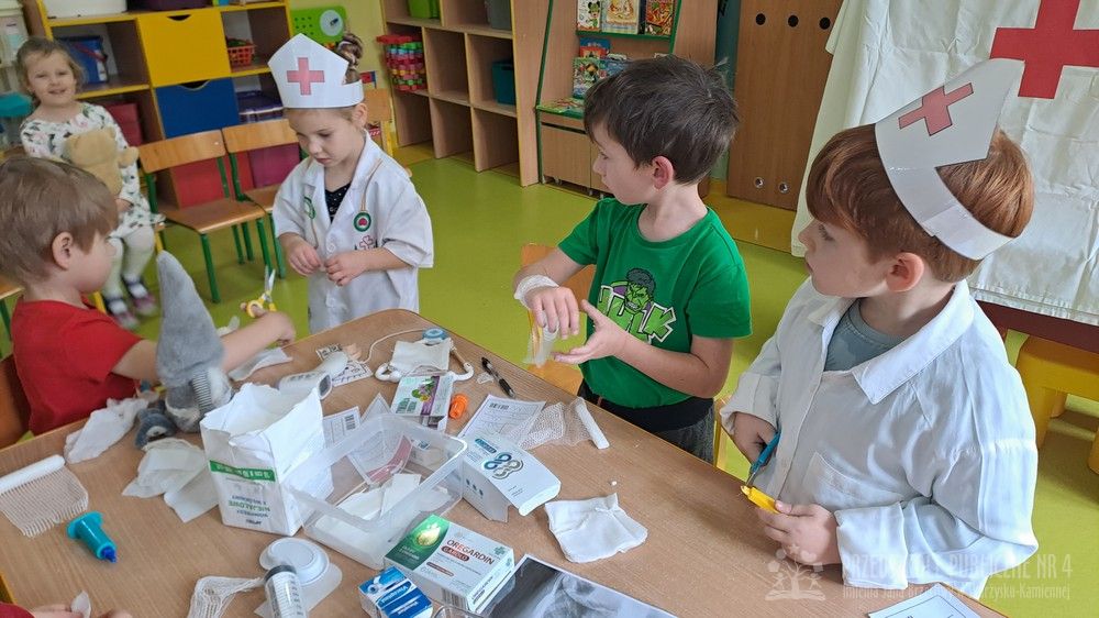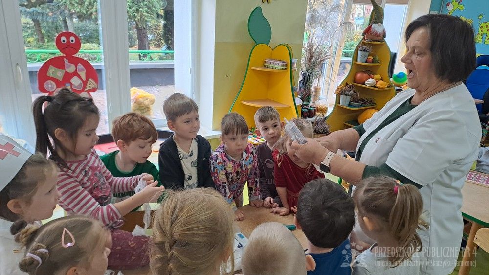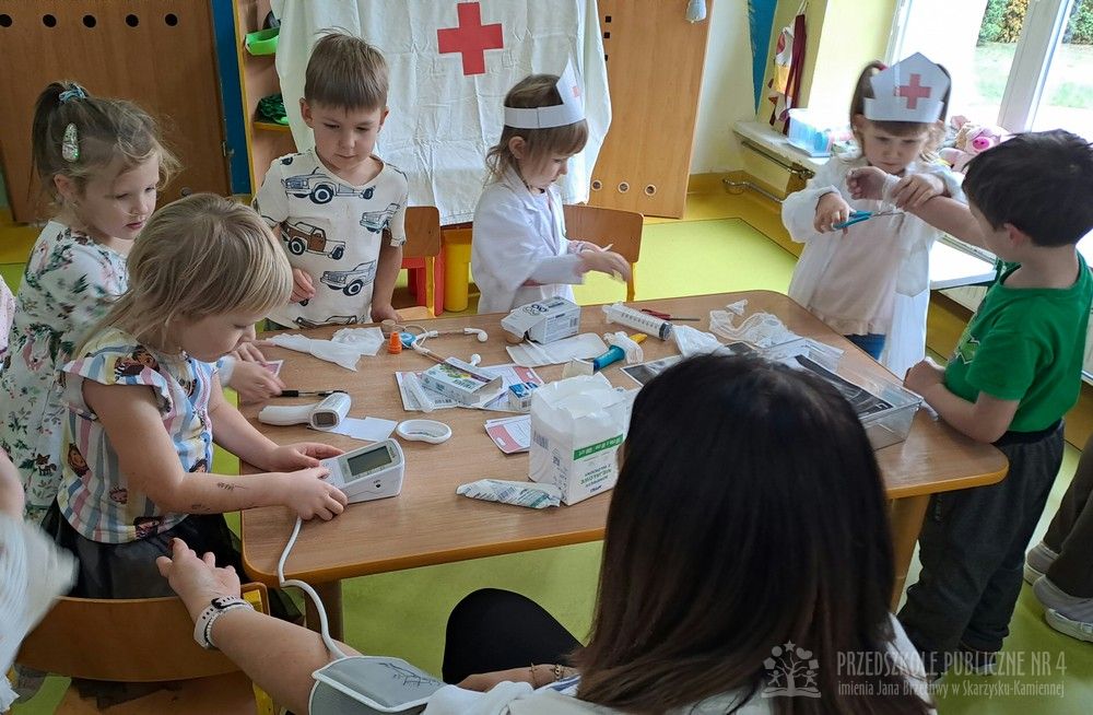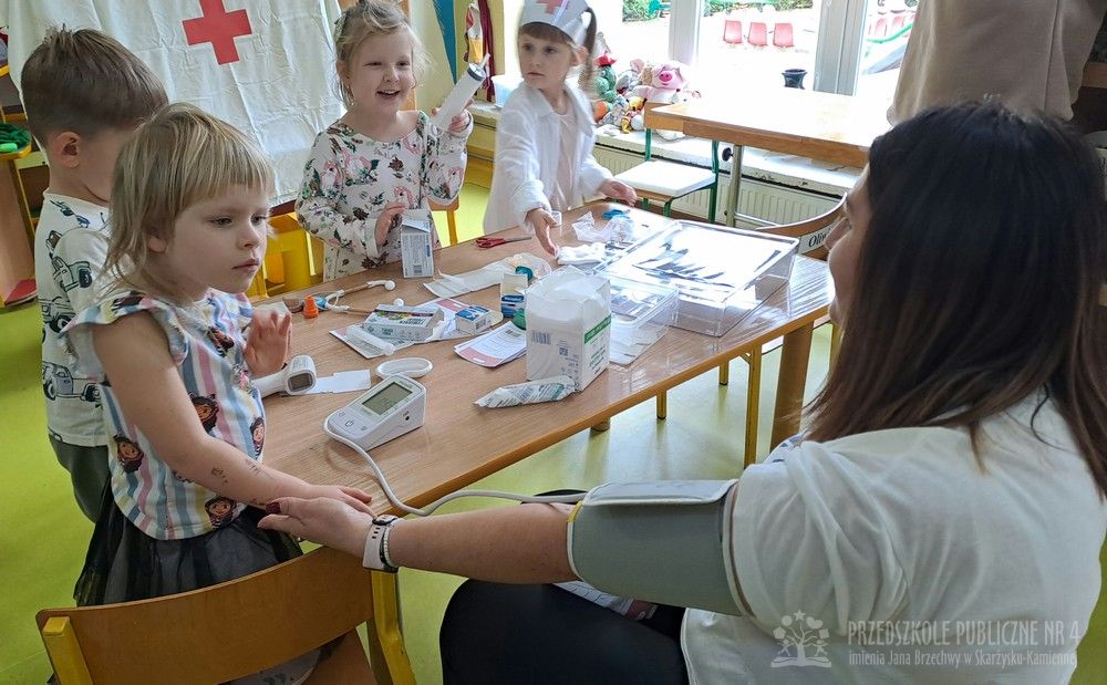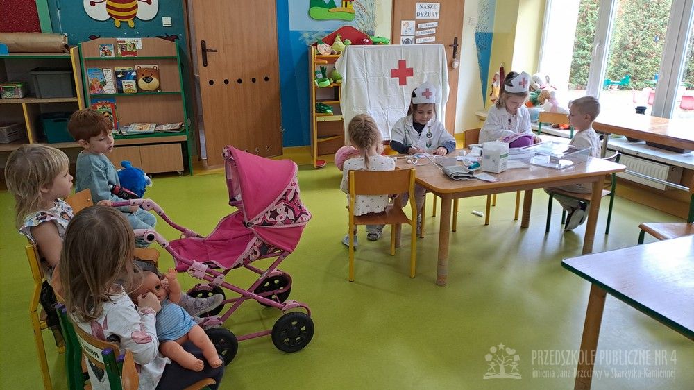 Zdrowie to bardzo ważna sprawa, wiedzą już o tym wszystkie Krasnale. W ostatnim czasie w naszej grupie zajmowaliśmy się tematem zdrowia. W toku zabaw dzieci poznały zasady zdrowego odżywiania oraz przygotowały szaszłyki owocowe, które były przepyszne. Gościliśmy w naszej grupie panią pielęgniarkę, która opowiedziała dzieciom o tym, jak zachować zasady higieny i zdrowego stylu życia. Krasnale dowiedziały się również, na czym polega praca pielęgniarki. Następnie miały okazję wcielić się role pracowników służby zdrowia - lekarza i pielęgniarki. Poprzez zabawę i aktywne działanie dzieci poznały atrybuty i narzędzia pracy przedstawicieli tych zawodów.