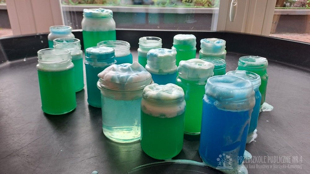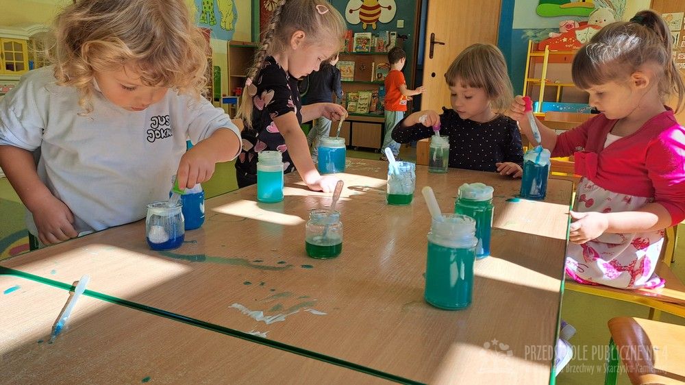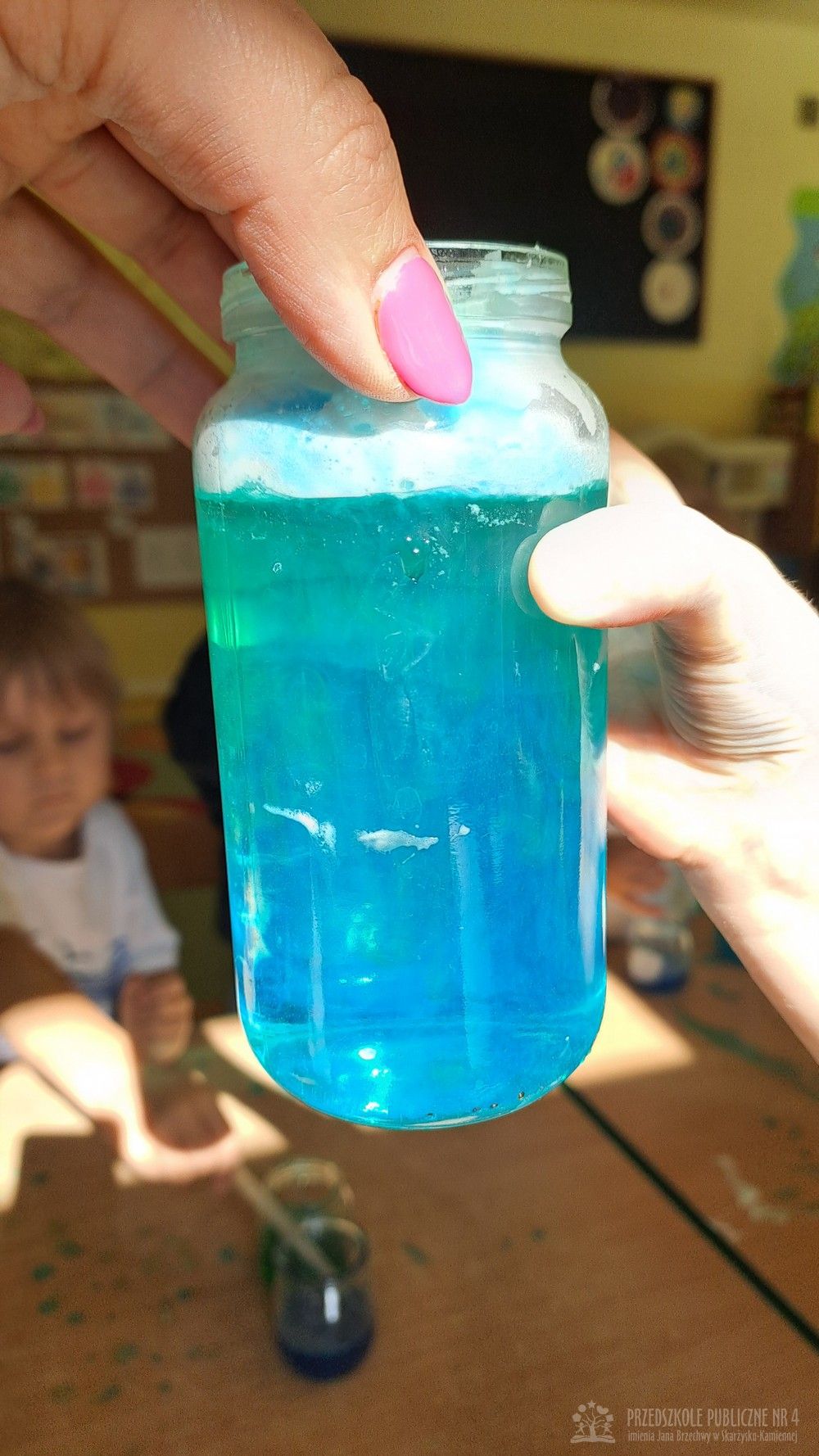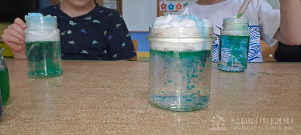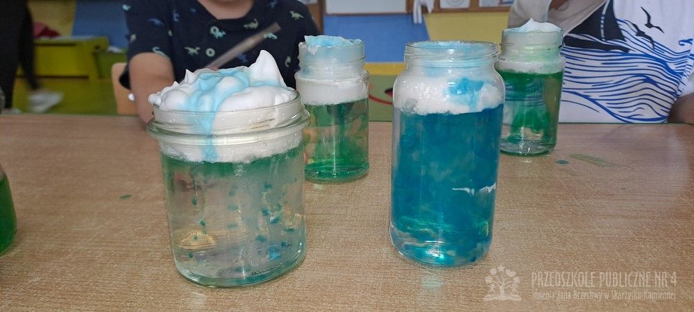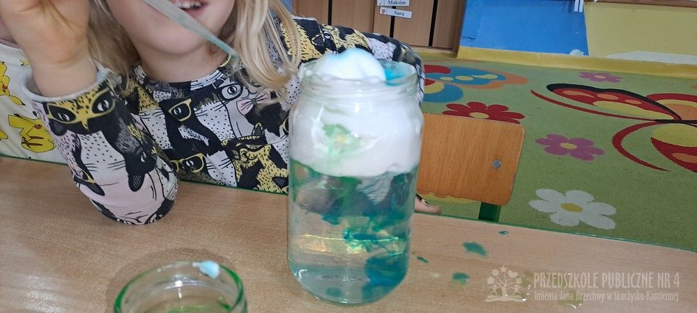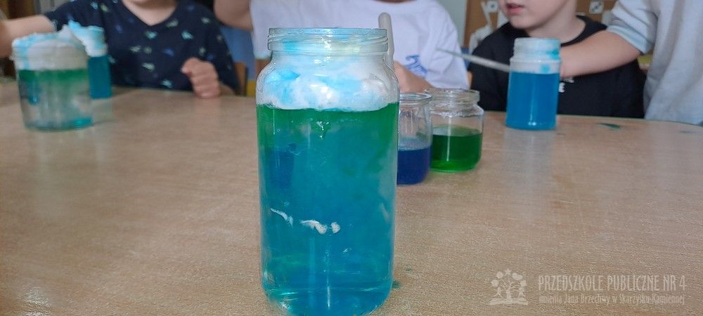 "Deszczowa chmura" - kolejny eksperyment w ramach zajęć dodatkowych w grupie Krasnali. Do przygotowania chmury wykorzystaliśmy wodę, piankę do golenia oraz niebieski barwnik. Efekt był niesamowity.