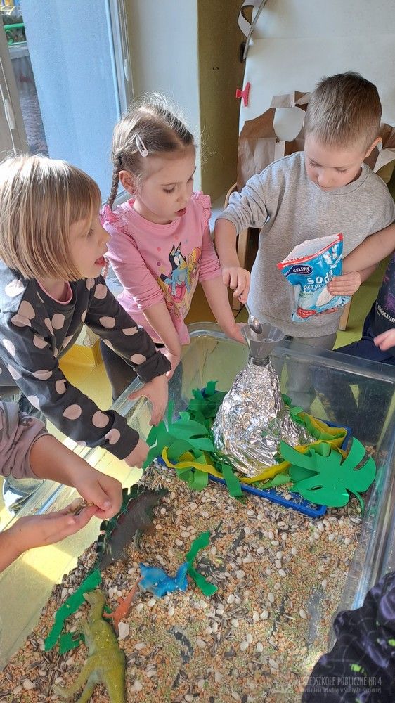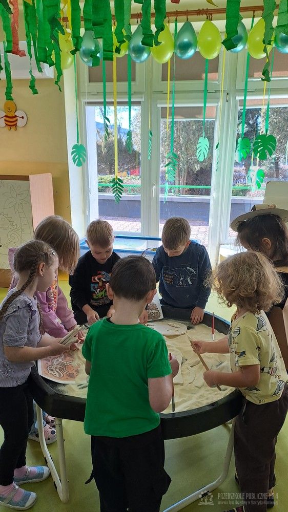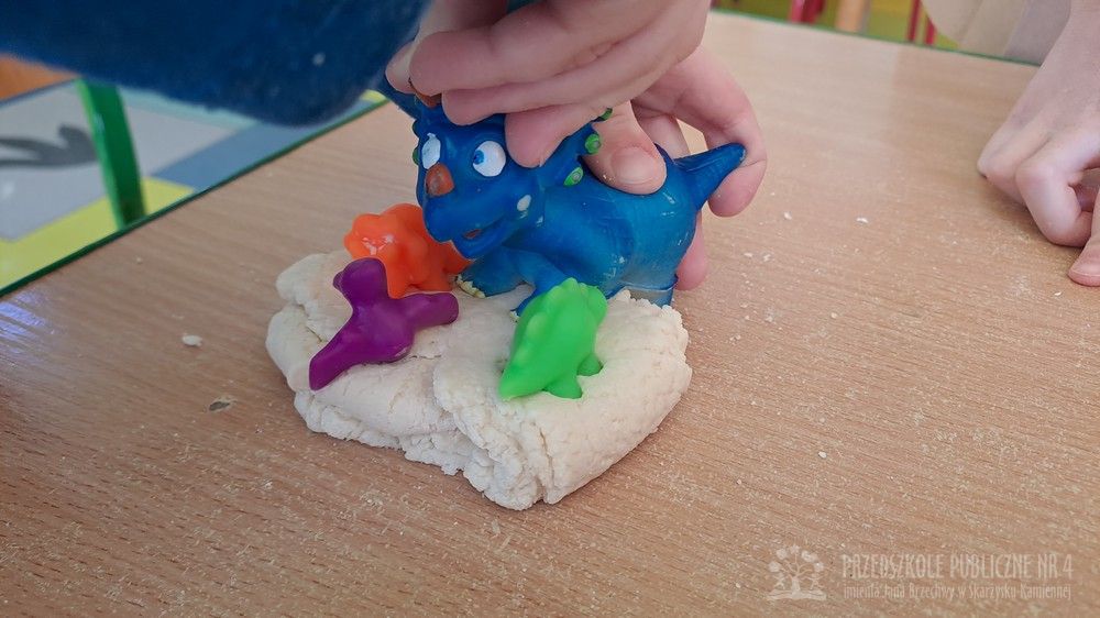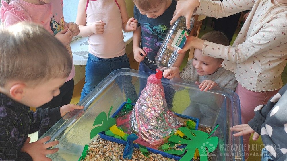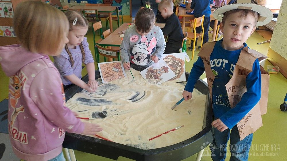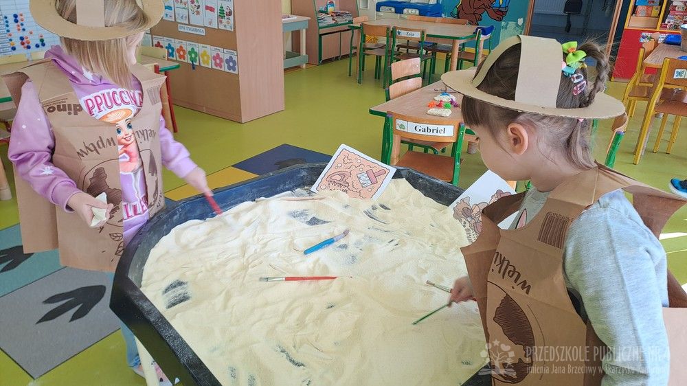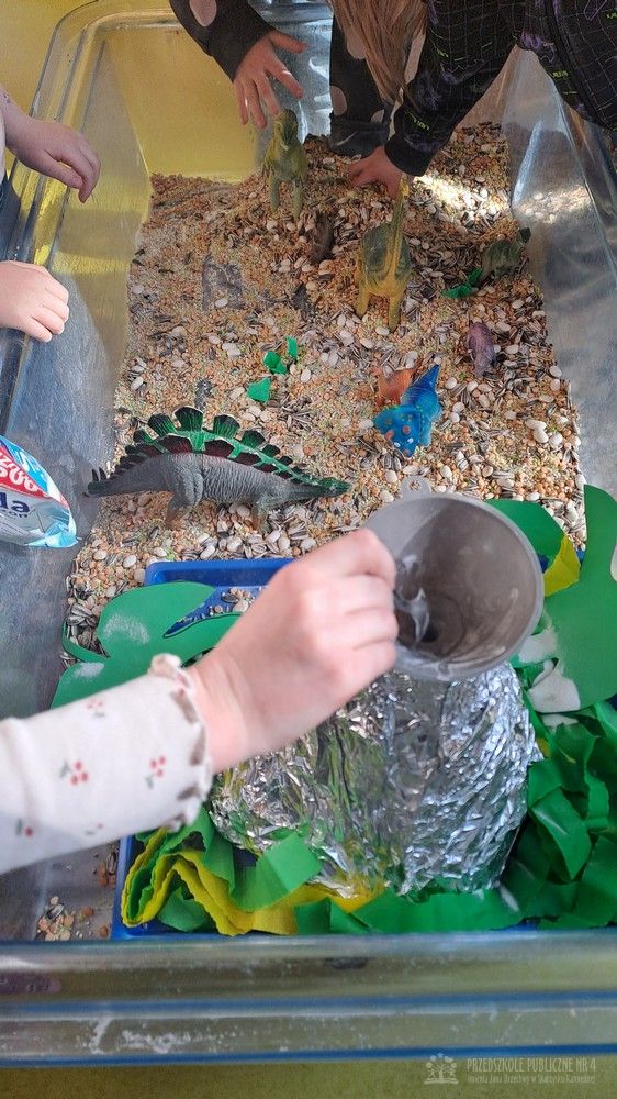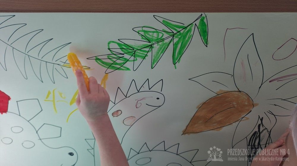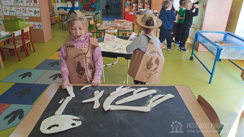 26 lutego w grupie Krasnali odbyły się wyjątkowe obchody Dnia Dinozaura, które przeniosły dzieci w fascynujący, prehistoryczny świat sprzed milionów lat. Podczas zajęć dzieci aktywnie działały zgodnie z założeniami planu daltońskiego – samodzielnie podejmowały decyzje, współpracowały w zespołach i odpowiedzialnie realizowały powierzone zadania. Tego dnia przedszkolaki zamieniły się w prawdziwych paleontologów – odkopywały kości dinozaura, a następnie wspólnie układały szkielet w całość, rozwijając umiejętność współpracy. Przedszkolaki z ogromnym zaangażowaniem wykonały pracę plastyczną według instrukcji, rozwijając przy tym swoją samodzielność, kreatywność oraz umiejętność działania krok po kroku. Nie zabrakło również fascynujących eksperymentów! Dzieci z zaciekawieniem obserwowały „lodowe jajka dinozaurów”, z których po stopniowym rozpuszczeniu lodu wyłaniały się ukryte niespodzianki. Ogromne emocje wzbudził także „wybuch wulkanu”. Dzieci kolorowały ilustracje prehistorycznych gadów oraz brały udział w ruchowej zabawie w klasy, poruszając się po śladach dinozaurów, co dostarczyło im mnóstwo radości i energii. To był dzień pełen wrażeń, nauki poprzez zabawę i niezapomnianych emocji, który na długo pozostanie w pamięci naszych małych odkrywców.