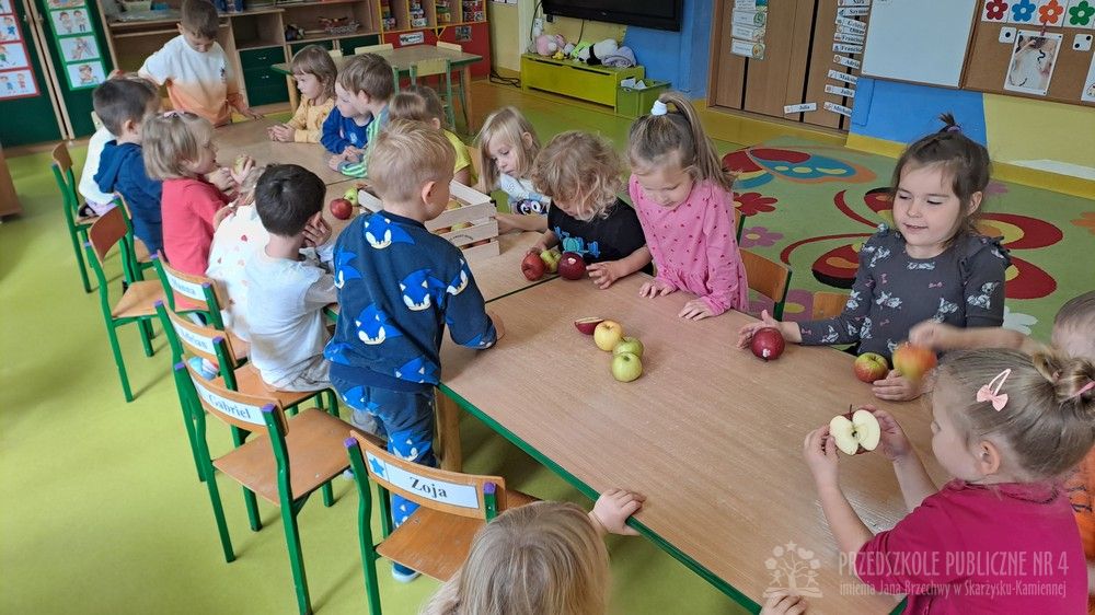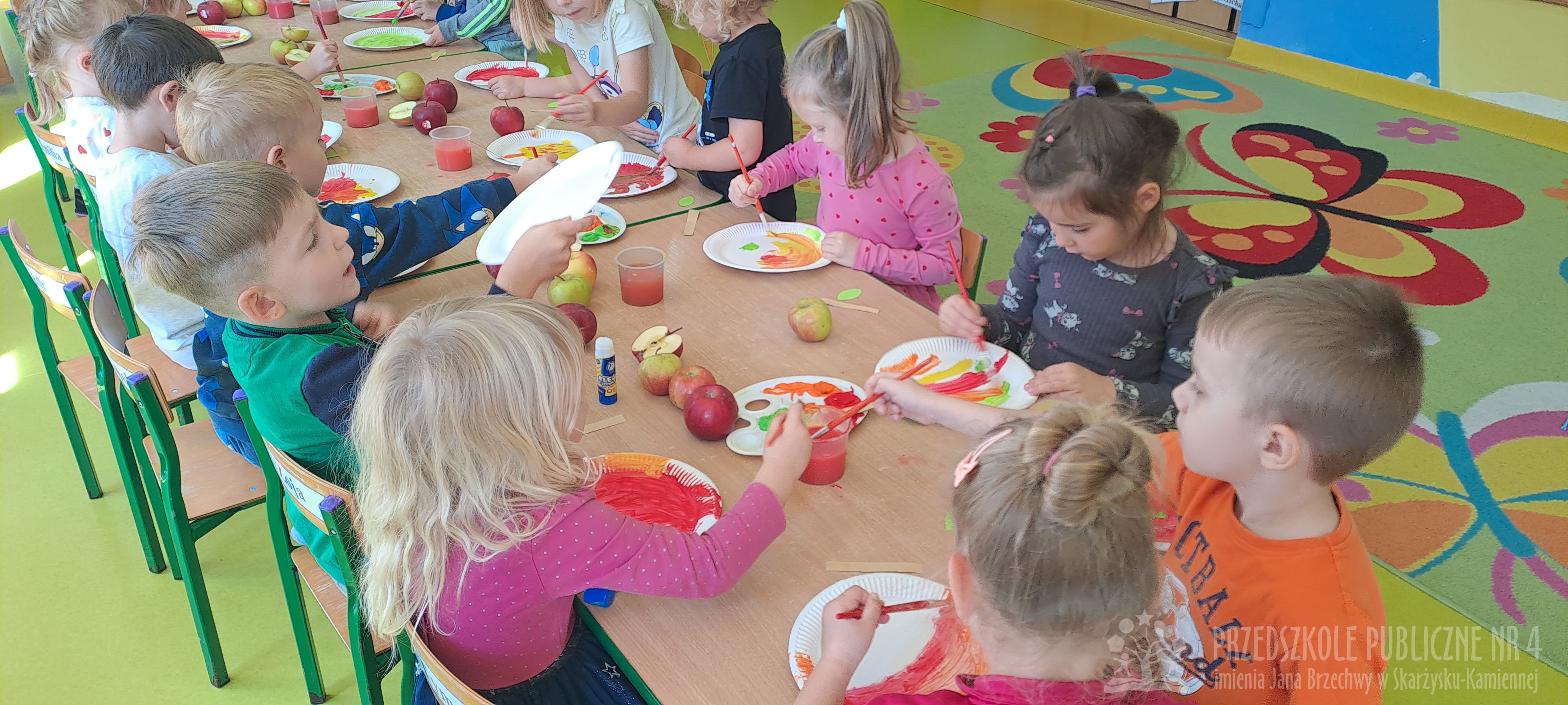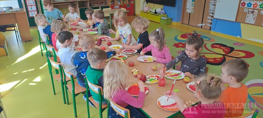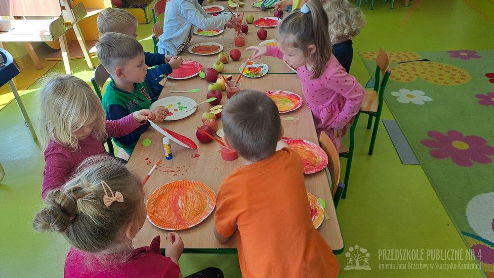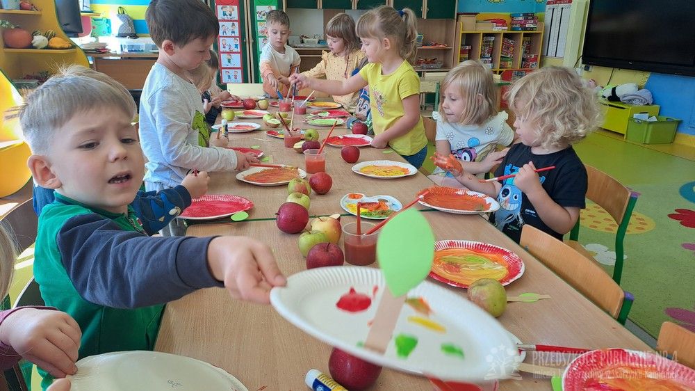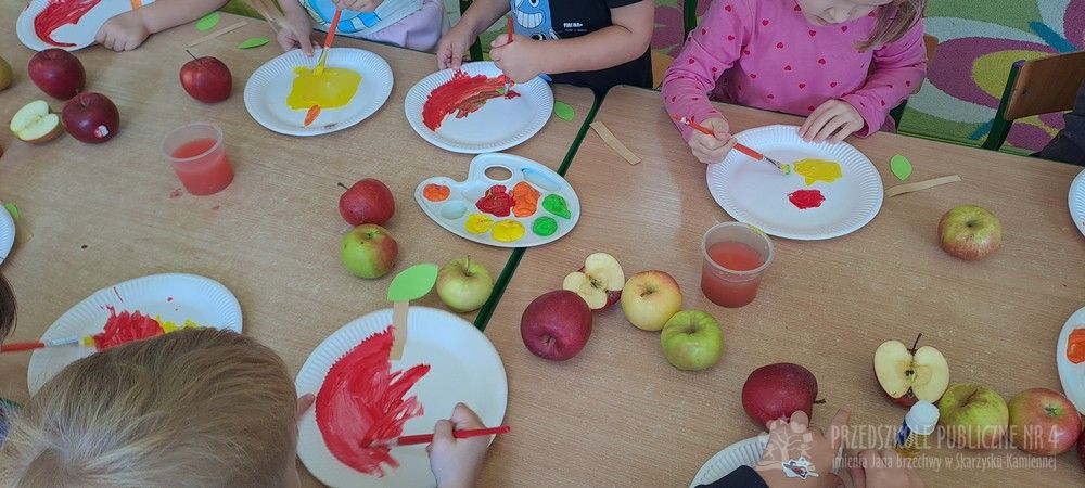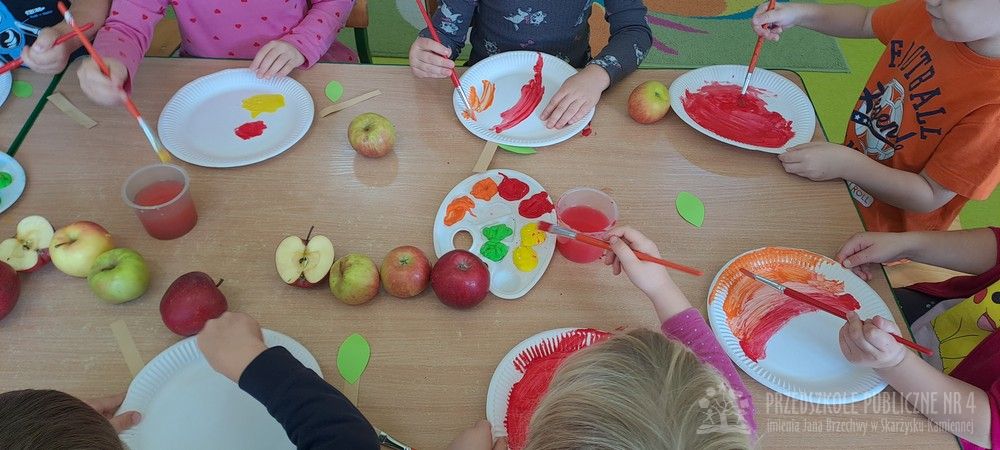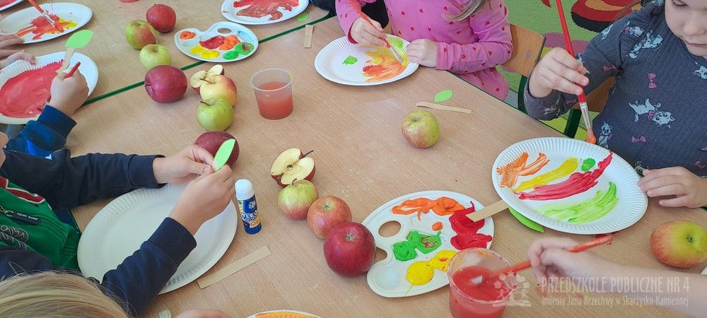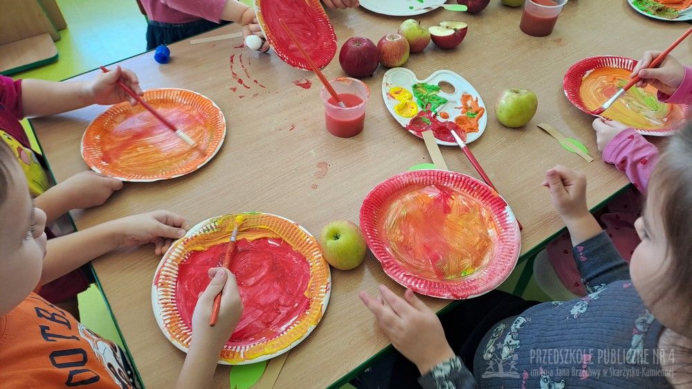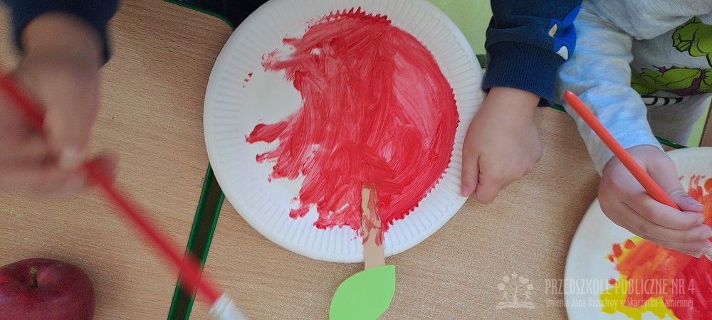 Rumiane jabłuszka stały się inspiracją do wykonania pracy plastycznej z wykorzystaniem talerzyków papierowych. Zanim przystąpiliśmy do pracy, dokładnie obejrzeliśmy jabłuszka z naszego kącika przyrody, żeby sprawdzić jakich kolorów farb powinniśmy użyć. Srawdziliśmy także, jak jabłka wyglądają w środku, a po skończonej pracy zjedliśmy je ze smakiem.