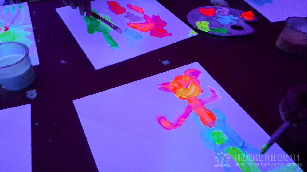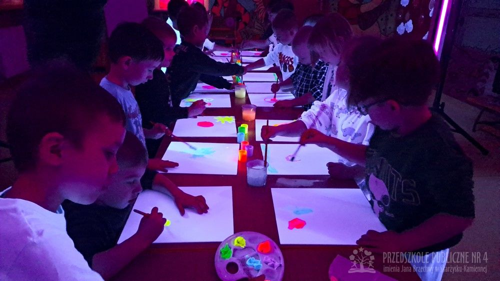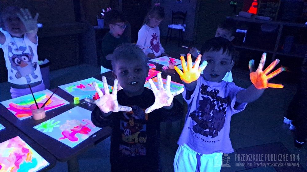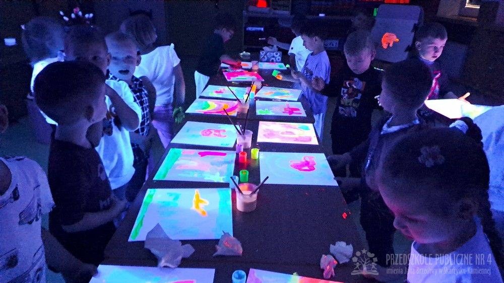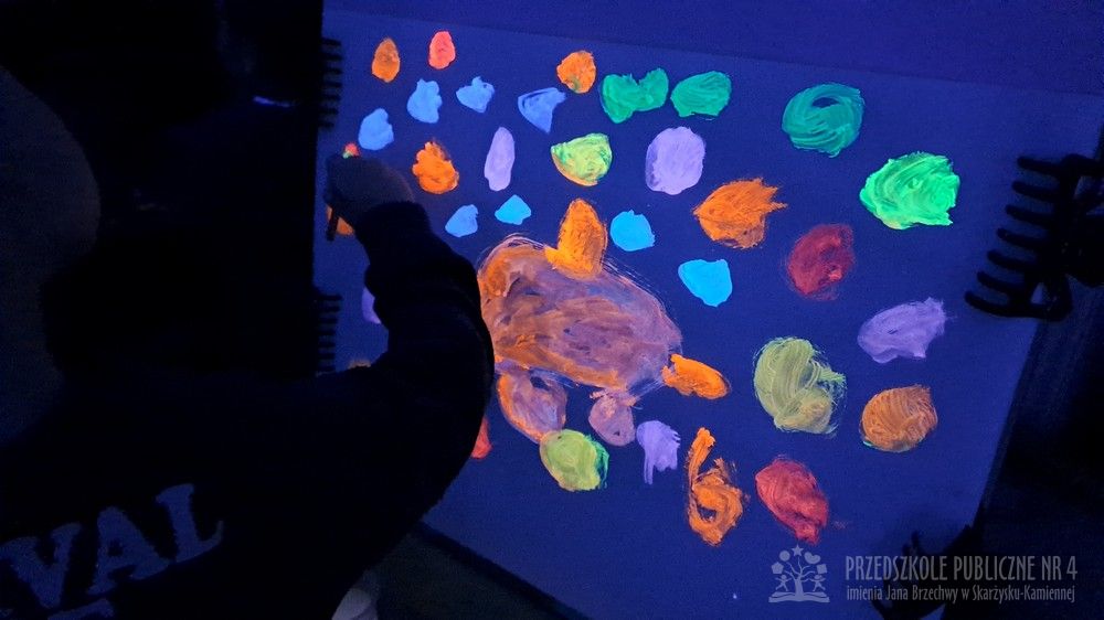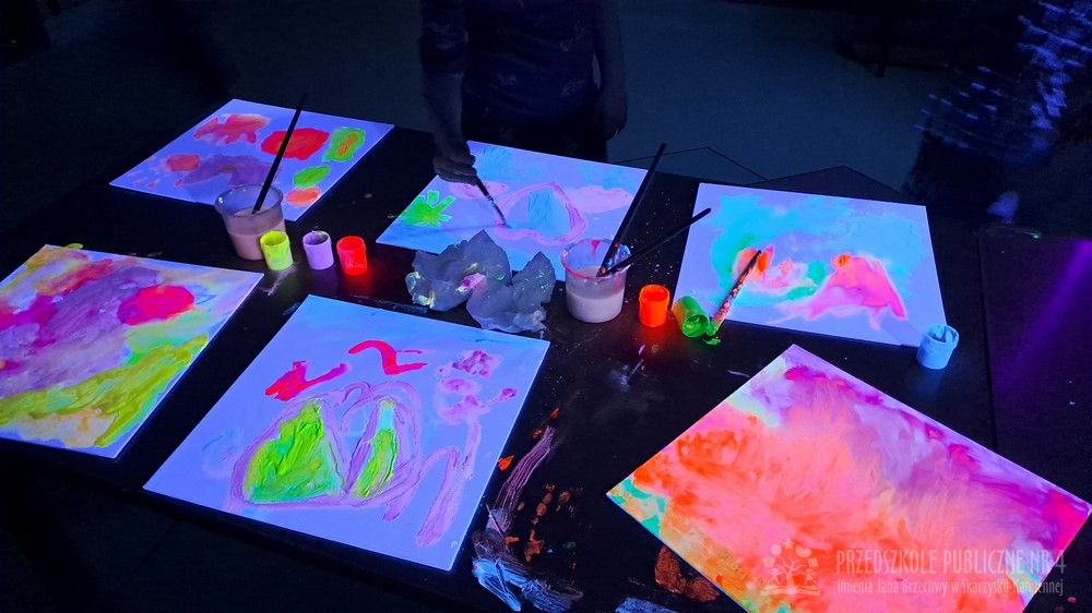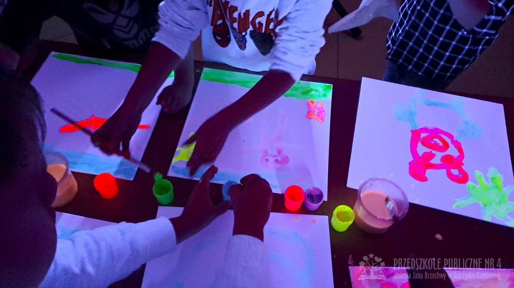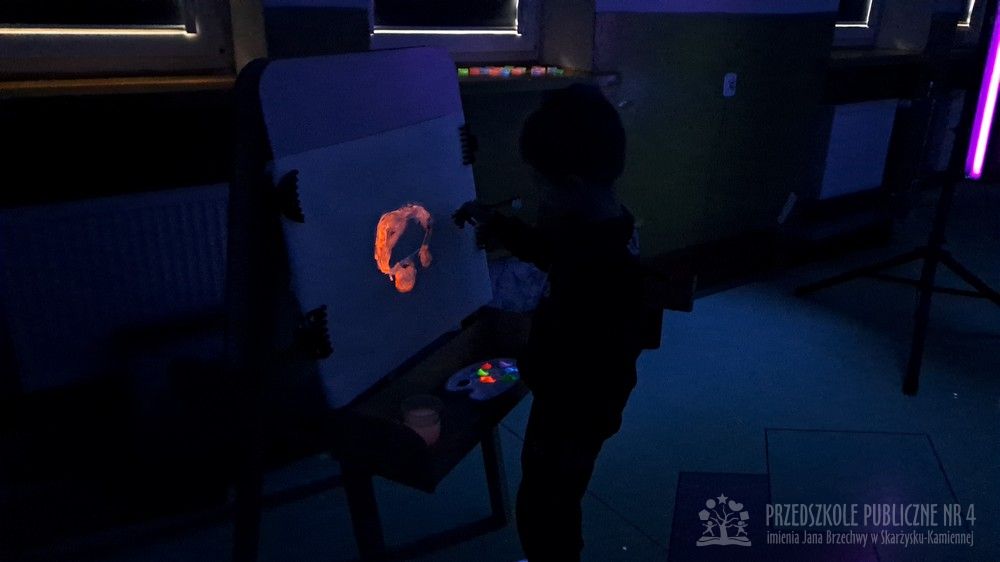 Krasnale przeniosły się do magicznego świata świecących barw. Podczas zajęć mali artyści malowali w ciemności przy użyciu farb fluorescencyjnych i świteł UV, co sprawiło, że zwykle białe kartki zamieniły sie w prawdziwe bajkowe obrazy. Było mnóstwo radości, zachwytu i twórczej zabawy, która pobudziła ciekawość, wyobraźnię oraz zachęciła dzieci do działania i odkrywania świata w niecodzienny sposób. Malowanie w ciemności to nie tylko wartościowe doświadczenie edukacyjne, ale również świetna zabawa i niezapomniane emocje, które na długo pozostanią w pamięci naszych przedszkolaków