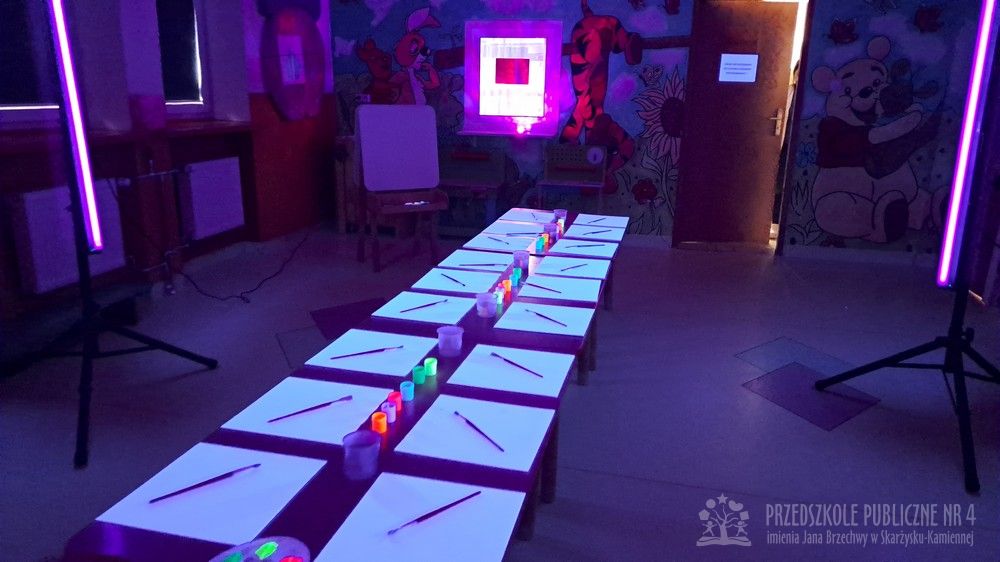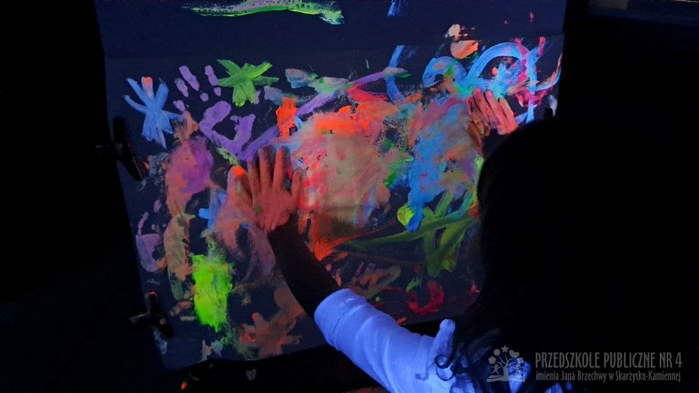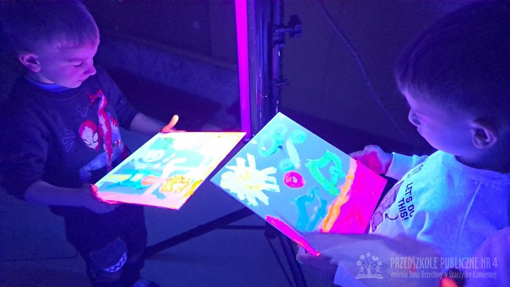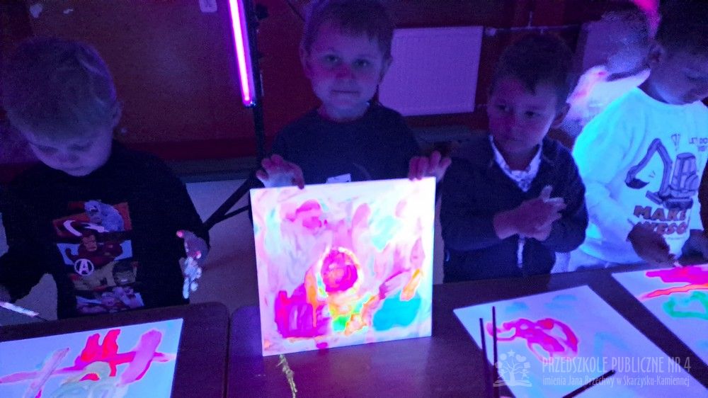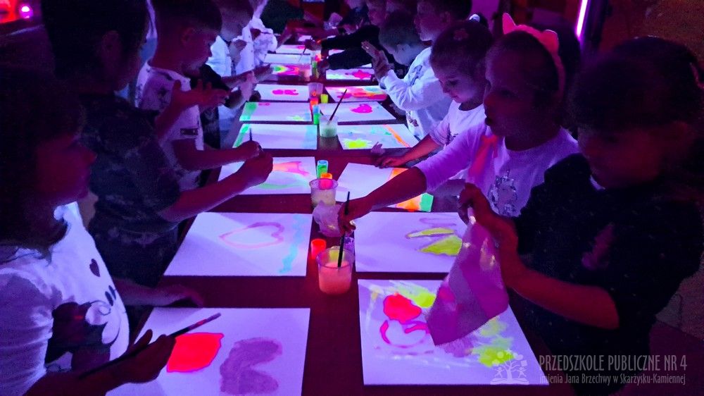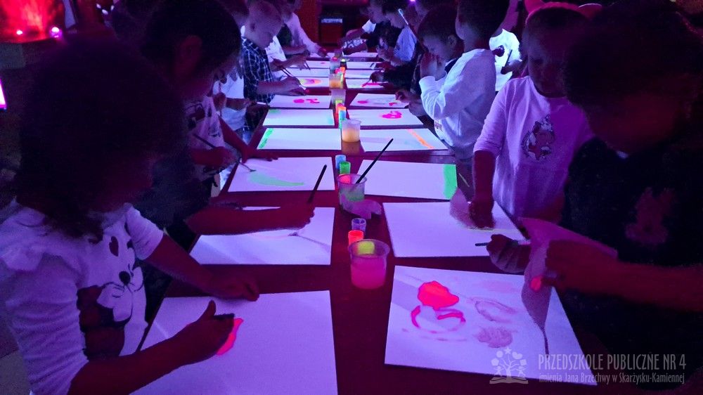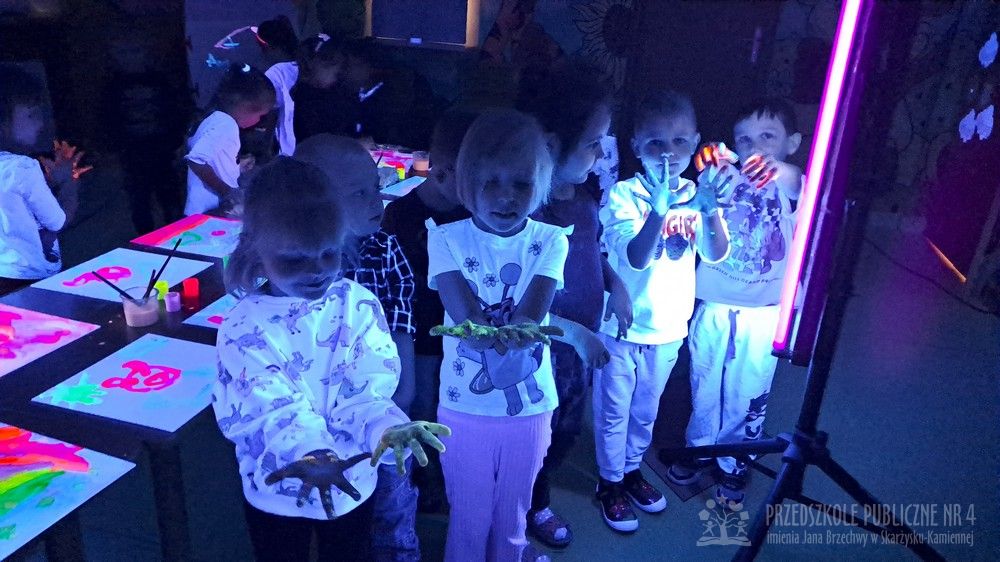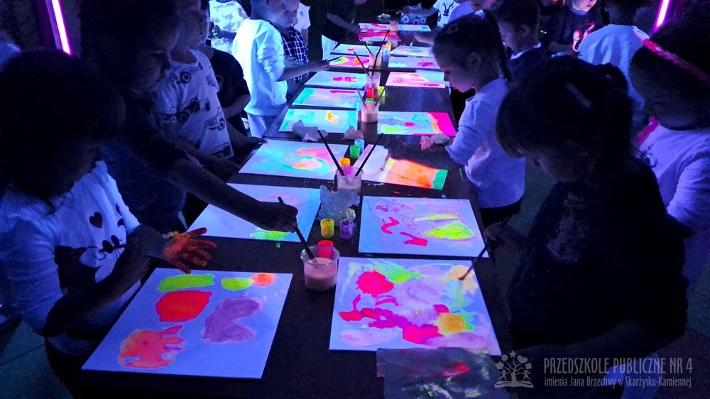 Krasnale przeniosły się do magicznego świata świecących barw. Podczas zajęć mali artyści malowali w ciemności przy użyciu farb fluorescencyjnych i świteł UV, co sprawiło, że zwykle białe kartki zamieniły sie w prawdziwe bajkowe obrazy. Było mnóstwo radości, zachwytu i twórczej zabawy, która pobudziła ciekawość, wyobraźnię oraz zachęciła dzieci do działania i odkrywania świata w niecodzienny sposób. Malowanie w ciemności to nie tylko wartościowe doświadczenie edukacyjne, ale również świetna zabawa i niezapomniane emocje, które na długo pozostanią w pamięci naszych przedszkolaków
