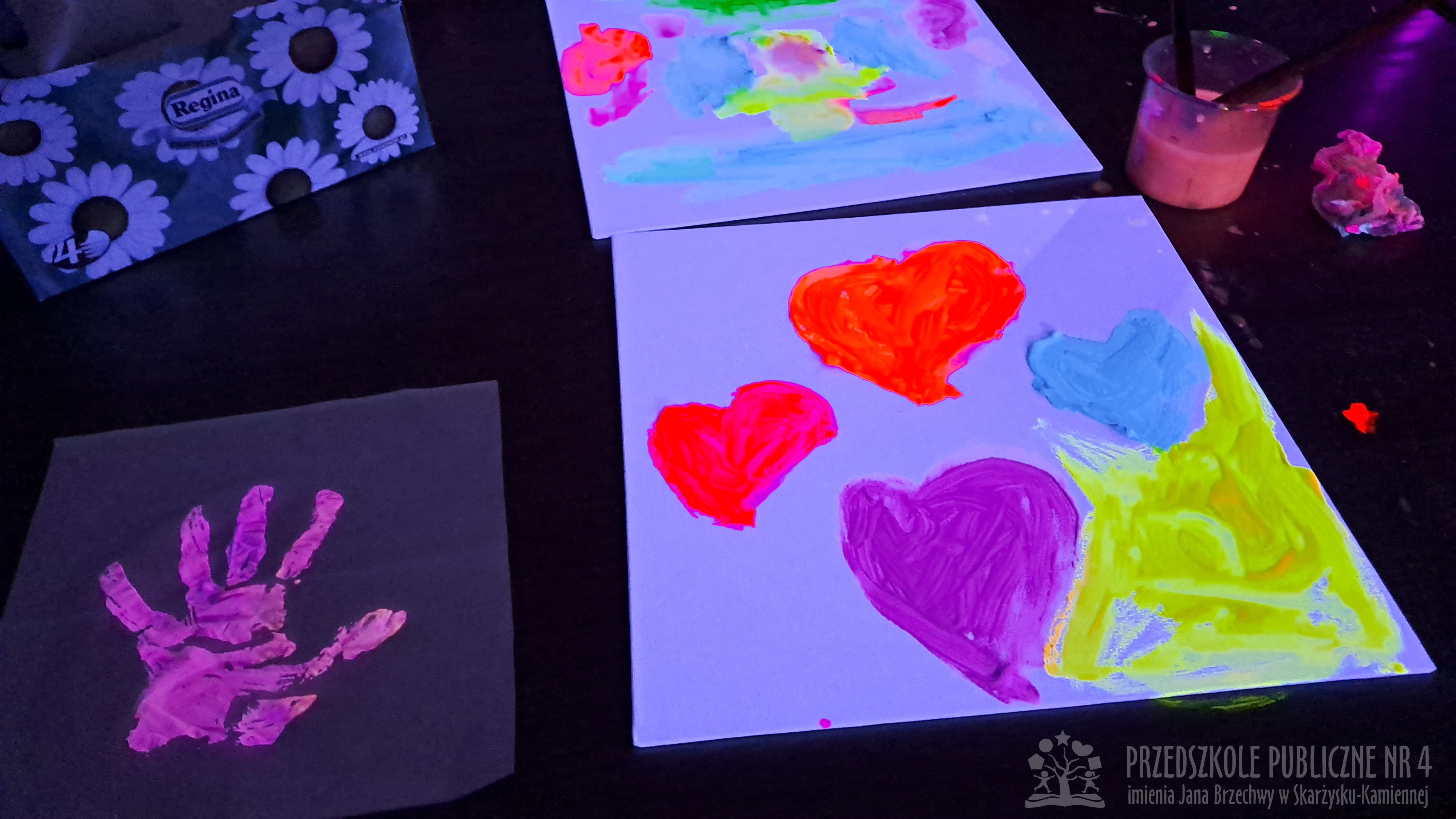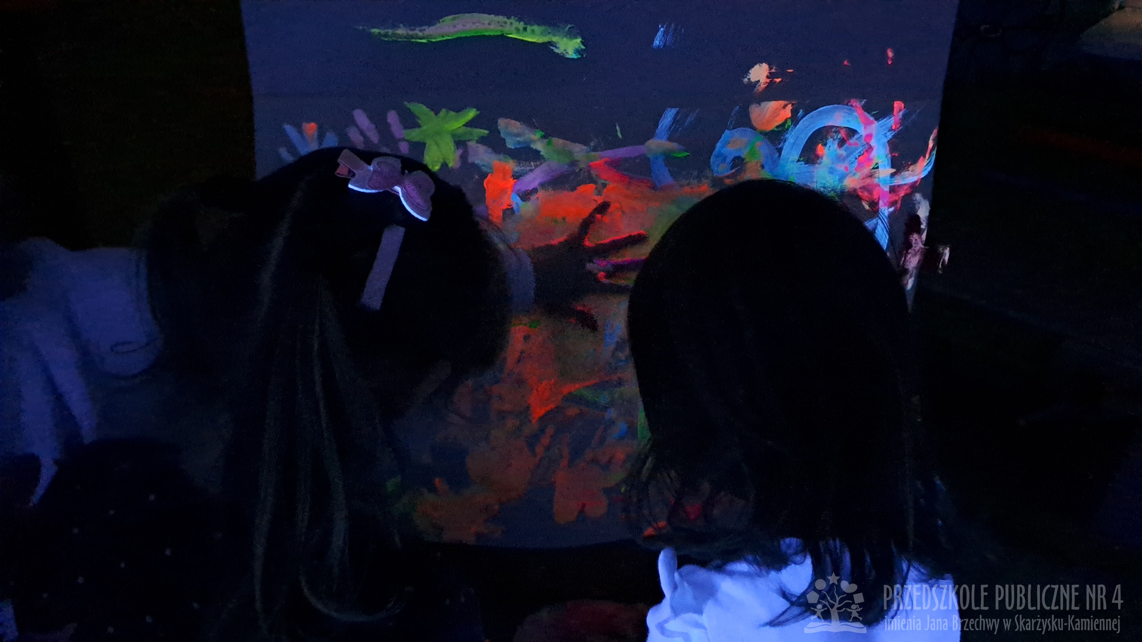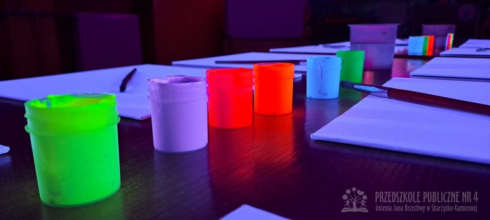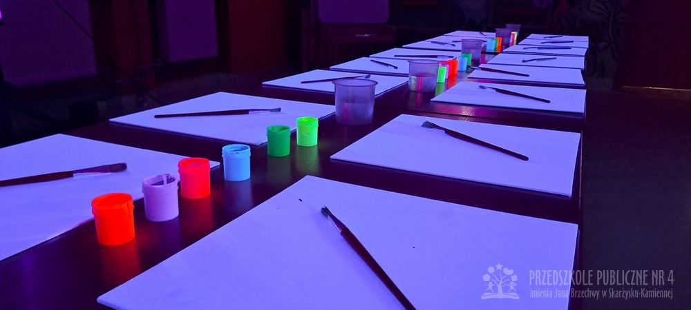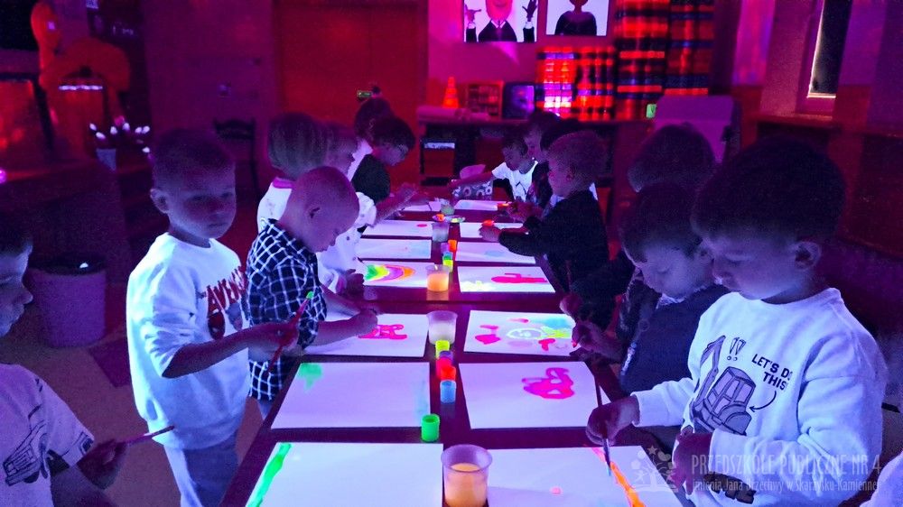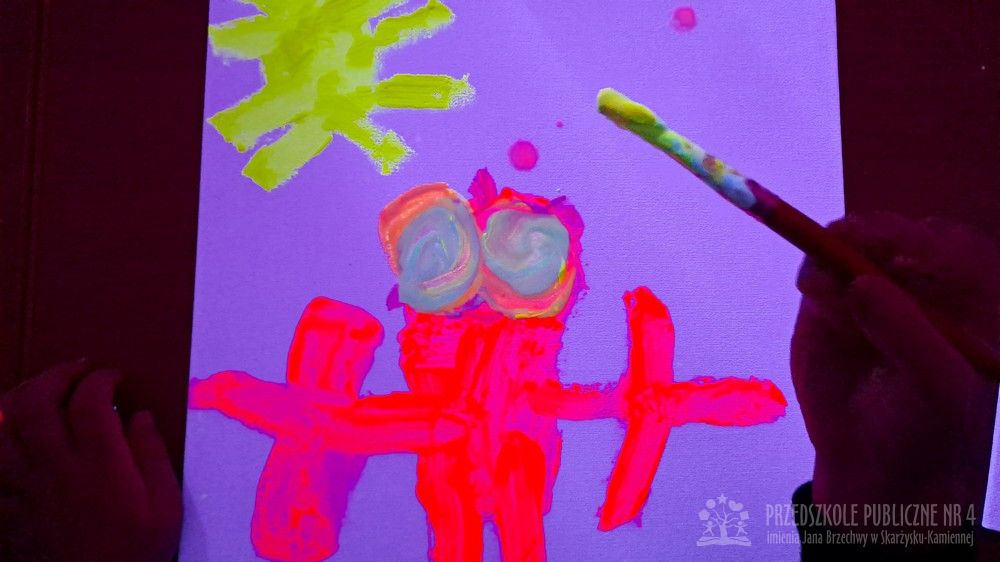 Krasnale przeniosły się do magicznego świata świecących barw. Podczas zajęć mali artyści malowali w ciemności przy użyciu farb fluorescencyjnych i świteł UV, co sprawiło, że zwykle białe kartki zamieniły sie w prawdziwe bajkowe obrazy. Było mnóstwo radości, zachwytu i twórczej zabawy, która pobudziła ciekawość, wyobraźnię oraz zachęciła dzieci do działania i odkrywania świata w niecodzienny sposób. Malowanie w ciemności to nie tylko wartościowe doświadczenie edukacyjne, ale również świetna zabawa i niezapomniane emocje, które na długo pozostanią w pamięci naszych przedszkolaków