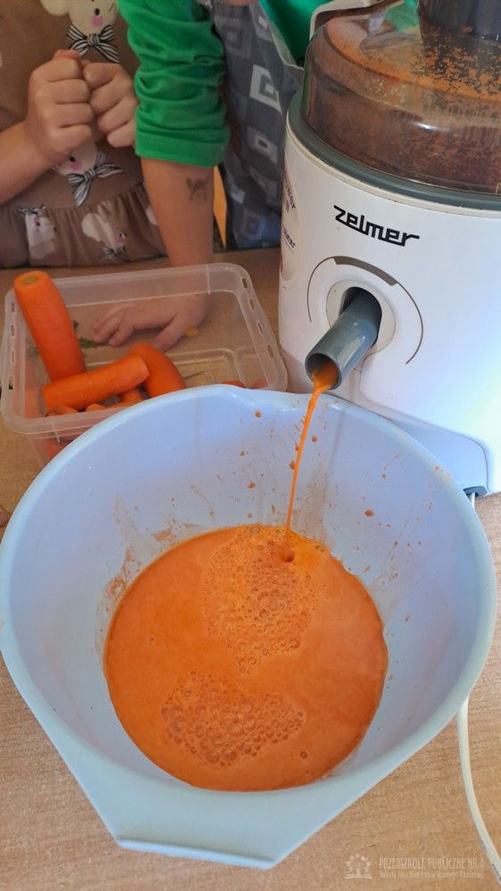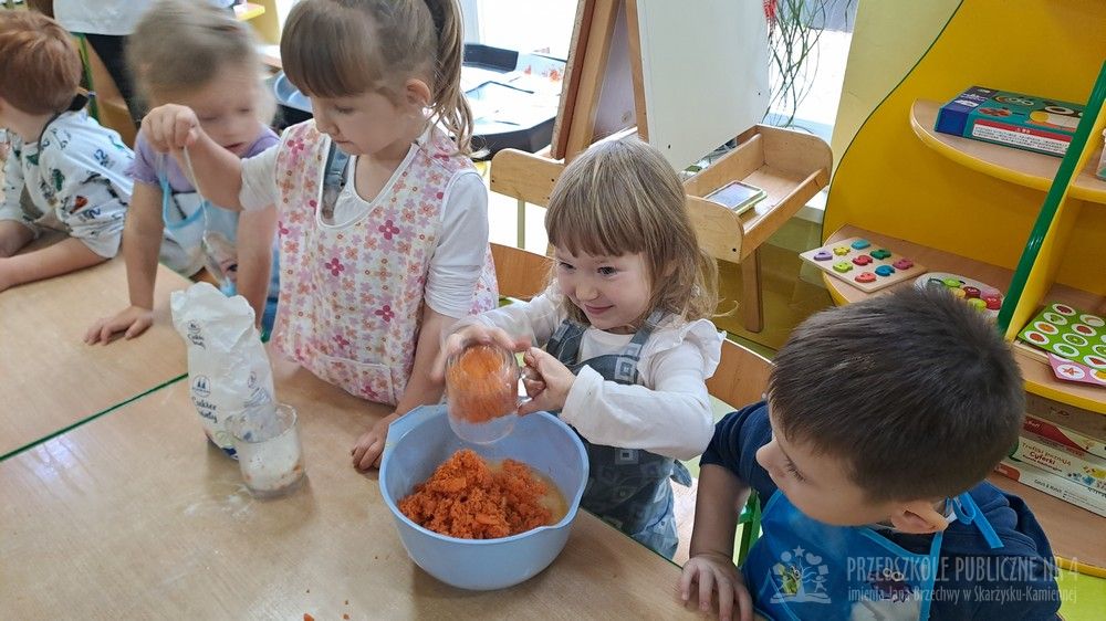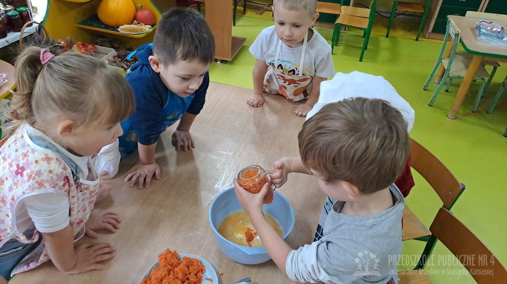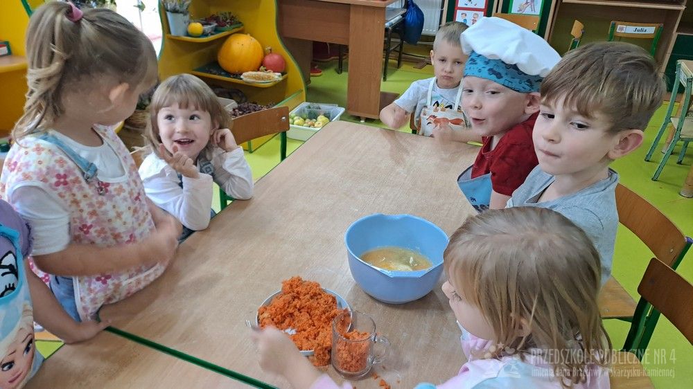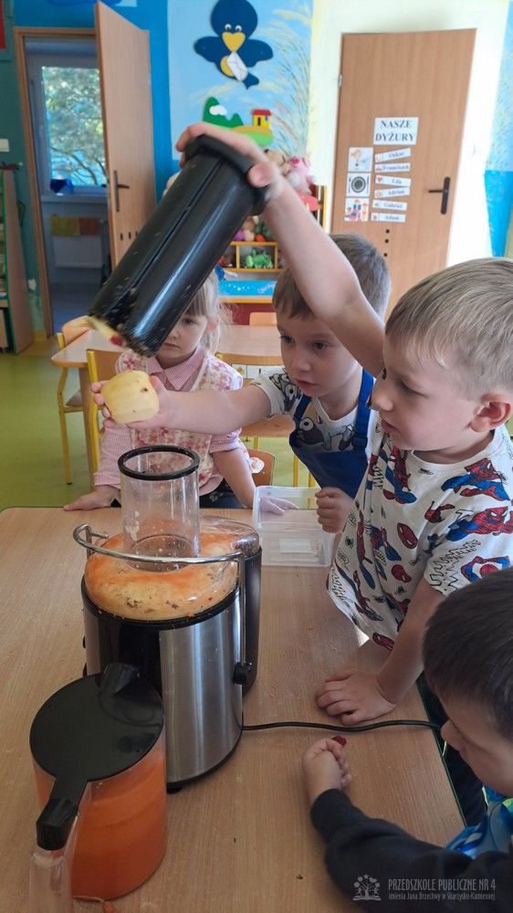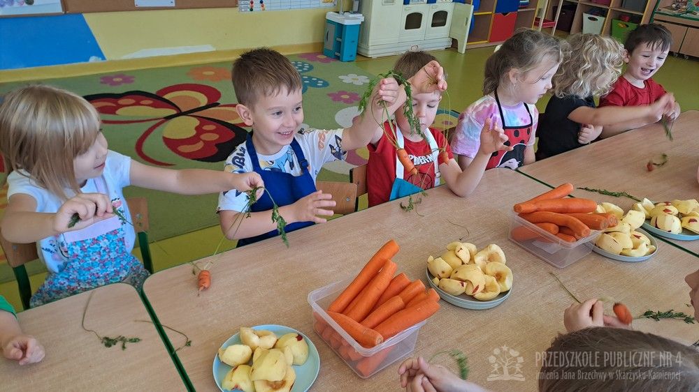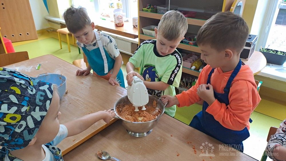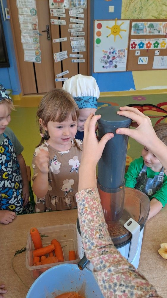 Jesień to czas zbioru owoców i warzyw. My także zebraliśmy plony z naszego ogrodu - pomidory, marchewki i pigwę. Z marchewek i jabłek wspólnie przygotowaliśmy pyszny sok przy pomocy sokowirówek. Nazajutrz upiekliśmy ciasto marchewkowe, które było tak pyszne, że zniknęło w mgnieniu oka. Krasnale bardzo lubią zajęcia kulinarne. Dzięki takim zajęciom rozwijamy u dzieci samodzielność, umiejętności manualne, kompetencje matematyczne. Jest to także doskonala okazja do poznawania zasad bezpieczeństwa, promowania zdrowego żywienia, a także rozwijania umiejętności współpracy i kreatywności zgodnie z koncepcją planu daltońskiego. Ponadto w trakcie zajęć dzieci zapoznają się z różnymi produktami, smakami i zapachami, a także uczą się zasad kulturalnego zachowania przy stole.
