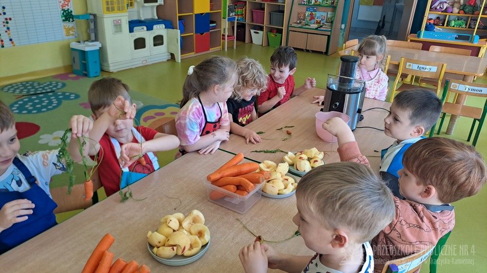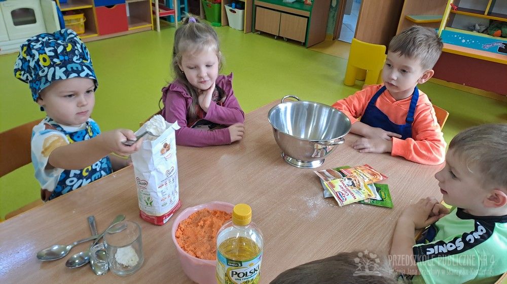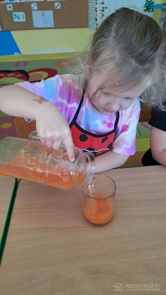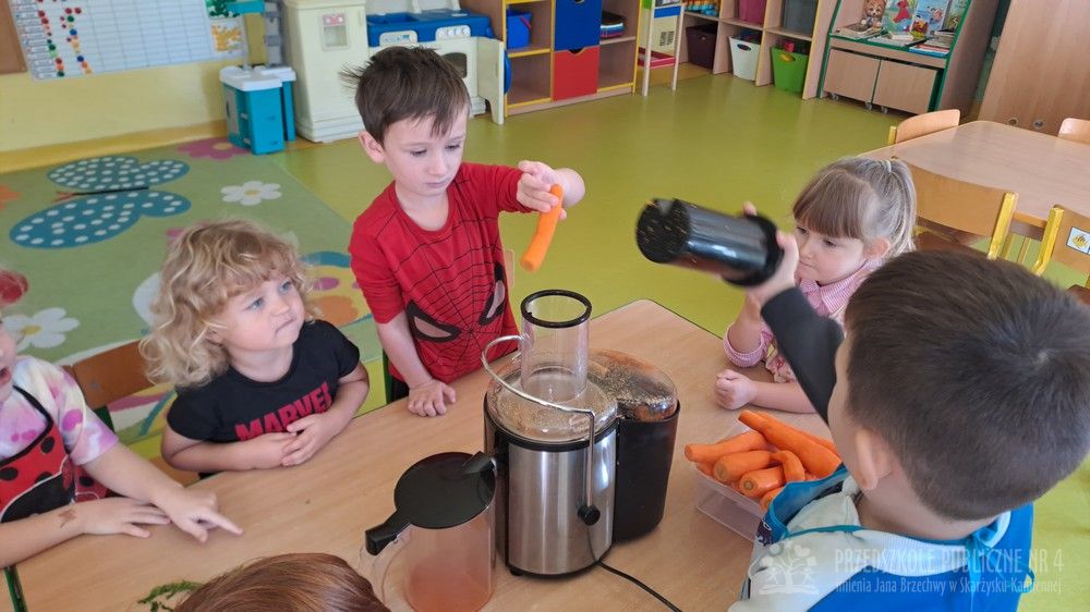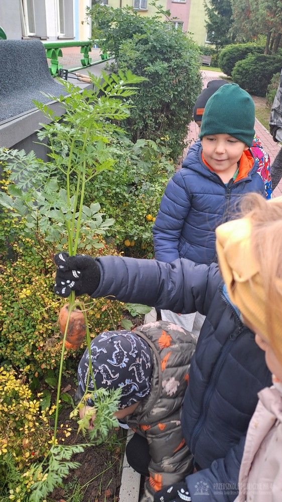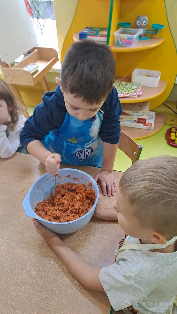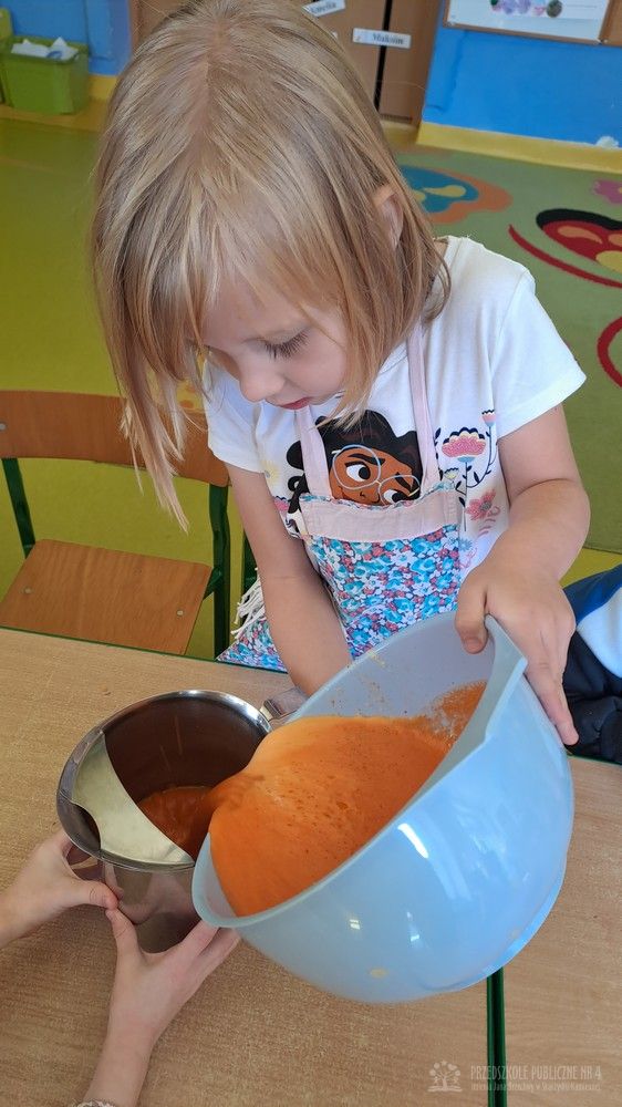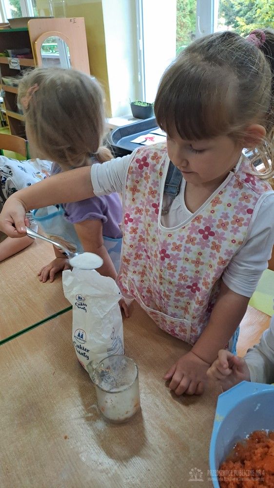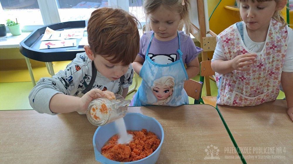 Jesień to czas zbioru owoców i warzyw. My także zebraliśmy plony z naszego ogrodu - pomidory, marchewki i pigwę. Z marchewek i jabłek wspólnie przygotowaliśmy pyszny sok przy pomocy sokowirówek. Nazajutrz upiekliśmy ciasto marchewkowe, które było tak pyszne, że zniknęło w mgnieniu oka. Krasnale bardzo lubią zajęcia kulinarne. Dzięki takim zajęciom rozwijamy u dzieci samodzielność, umiejętności manualne, kompetencje matematyczne. Jest to także doskonala okazja do poznawania zasad bezpieczeństwa, promowania zdrowego żywienia, a także rozwijania umiejętności współpracy i kreatywności zgodnie z koncepcją planu daltońskiego. Ponadto w trakcie zajęć dzieci zapoznają się z różnymi produktami, smakami i zapachami, a także uczą się zasad kulturalnego zachowania przy stole.