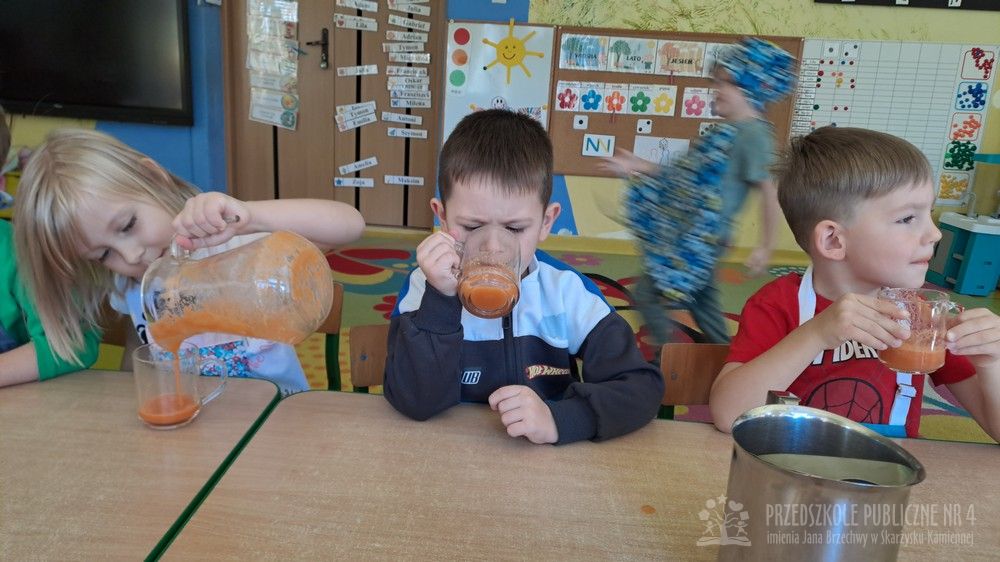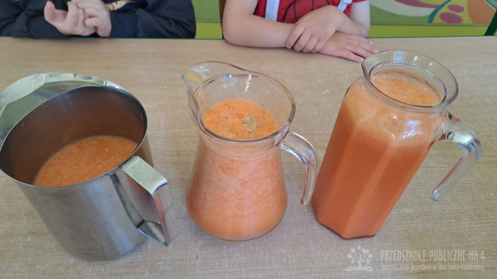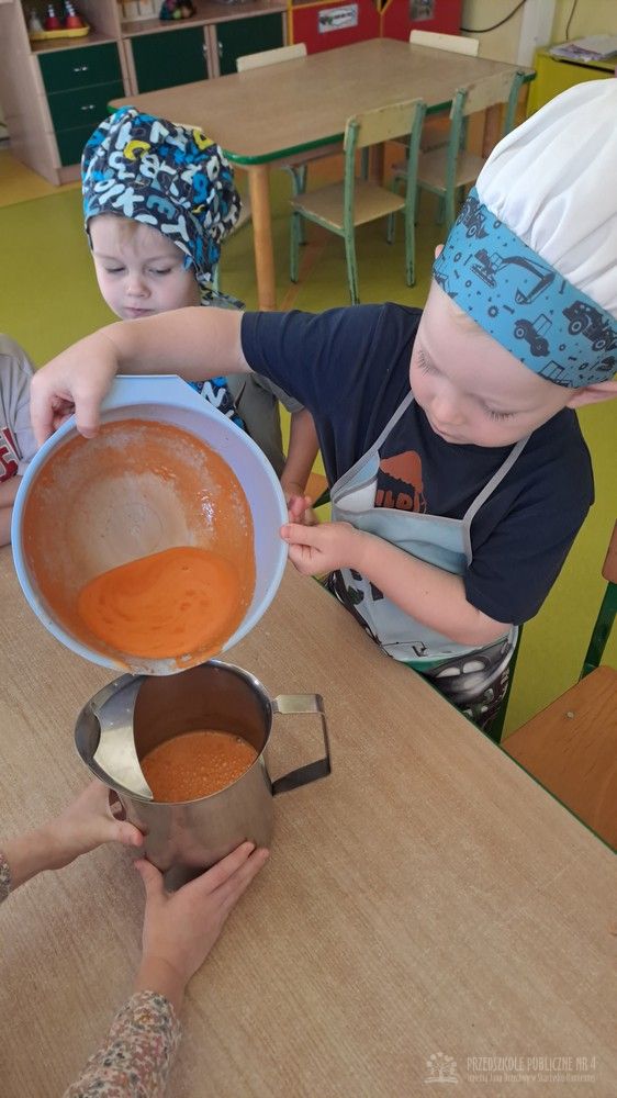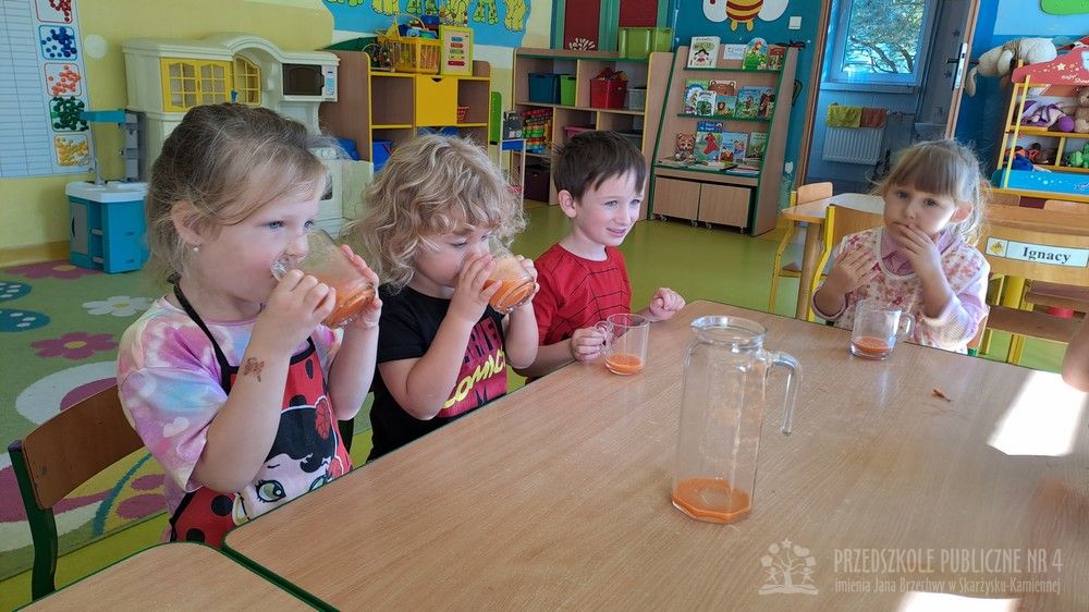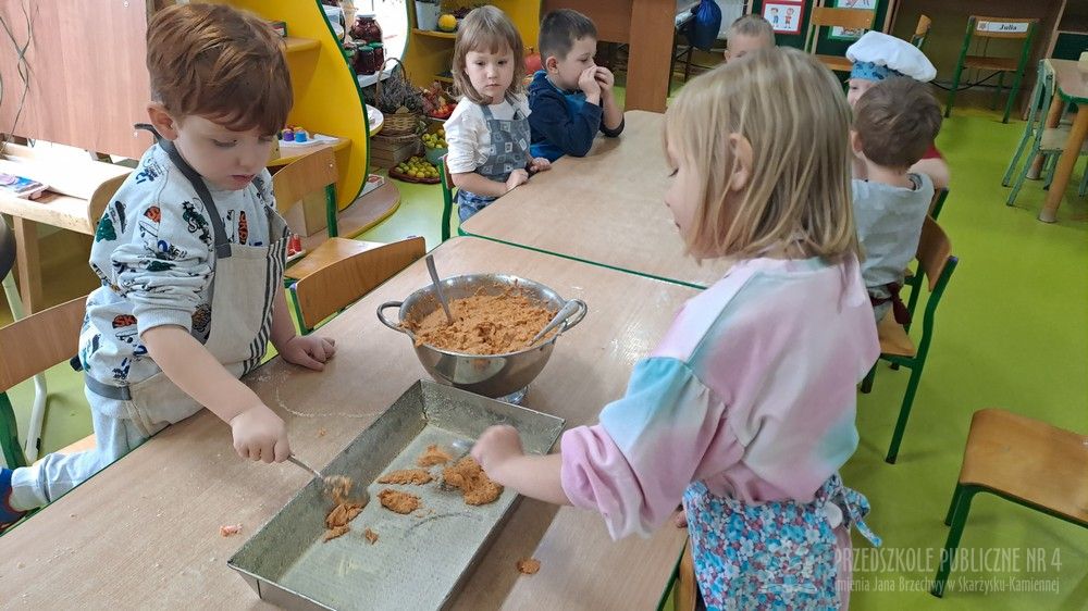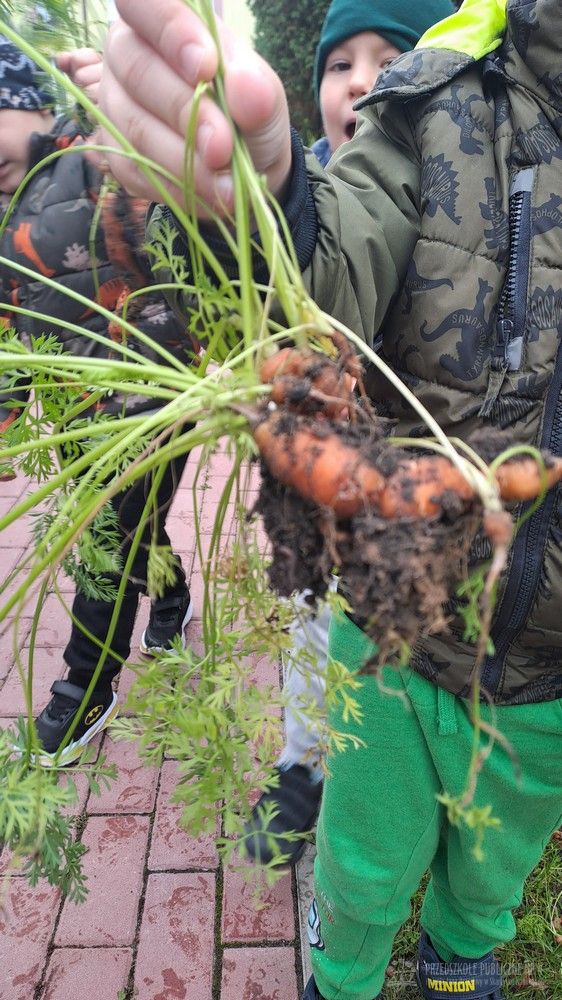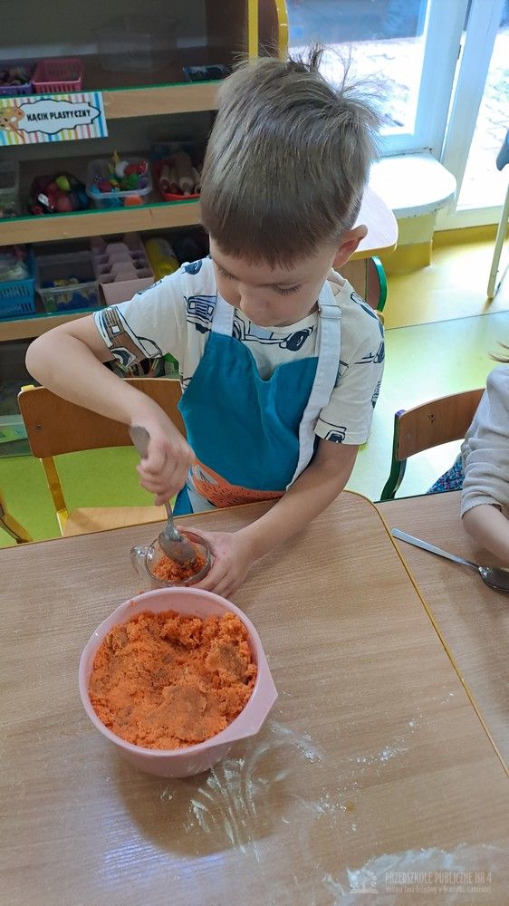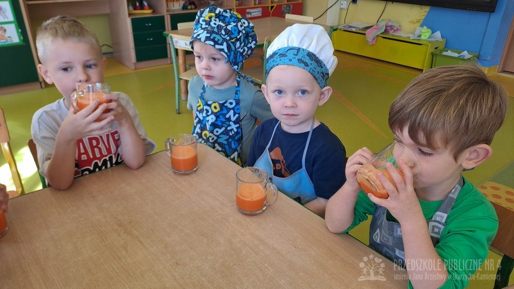 Jesień to czas zbioru owoców i warzyw. My także zebraliśmy plony z naszego ogrodu - pomidory, marchewki i pigwę. Z marchewek i jabłek wspólnie przygotowaliśmy pyszny sok przy pomocy sokowirówek. Nazajutrz upiekliśmy ciasto marchewkowe, które było tak pyszne, że zniknęło w mgnieniu oka. Krasnale bardzo lubią zajęcia kulinarne. Dzięki takim zajęciom rozwijamy u dzieci samodzielność, umiejętności manualne, kompetencje matematyczne. Jest to także doskonala okazja do poznawania zasad bezpieczeństwa, promowania zdrowego żywienia, a także rozwijania umiejętności współpracy i kreatywności zgodnie z koncepcją planu daltońskiego. Ponadto w trakcie zajęć dzieci zapoznają się z różnymi produktami, smakami i zapachami, a także uczą się zasad kulturalnego zachowania przy stole.
