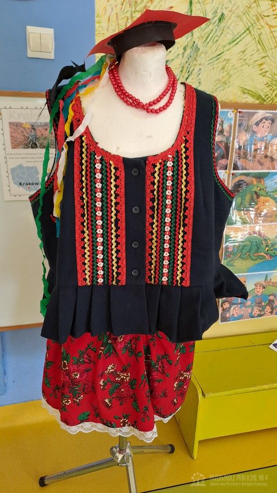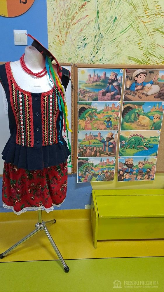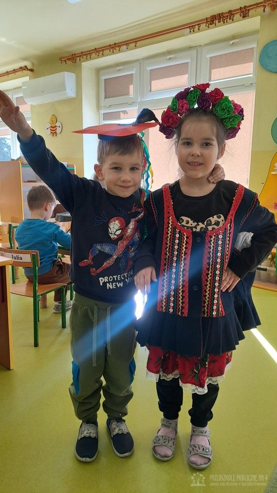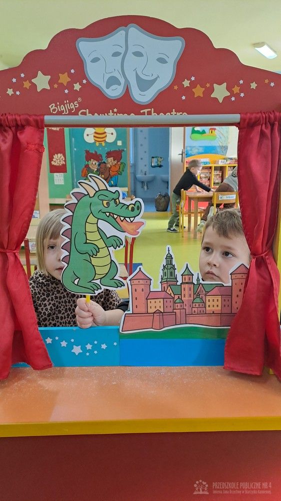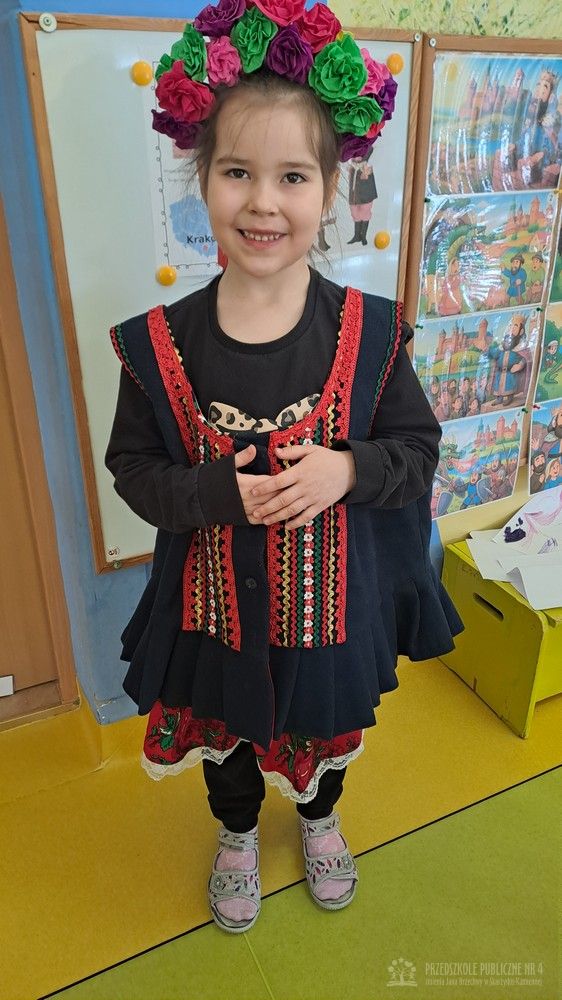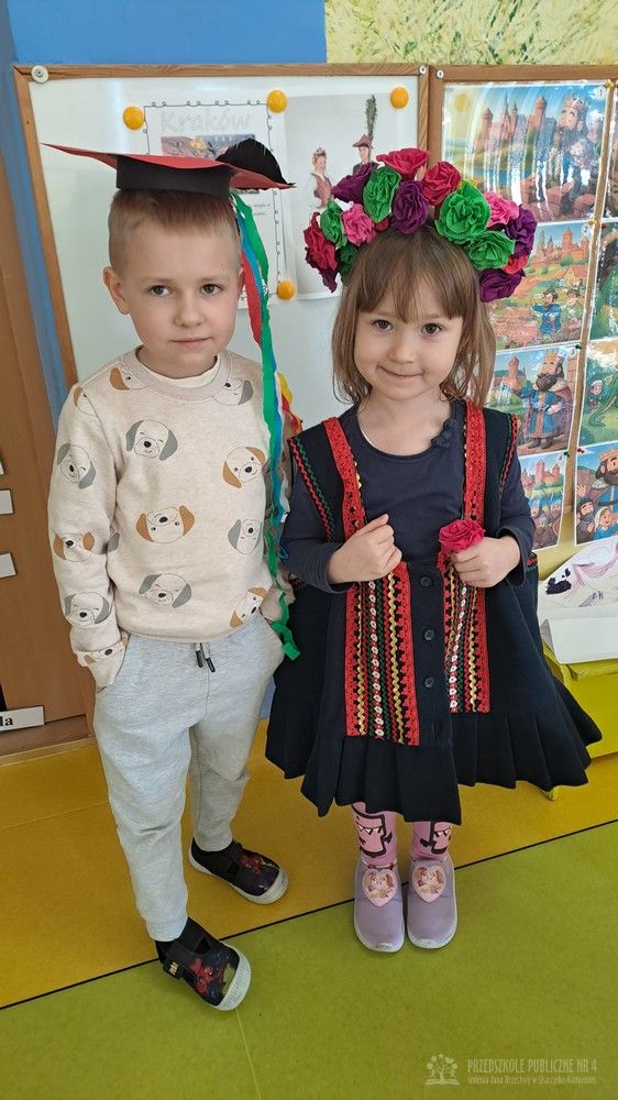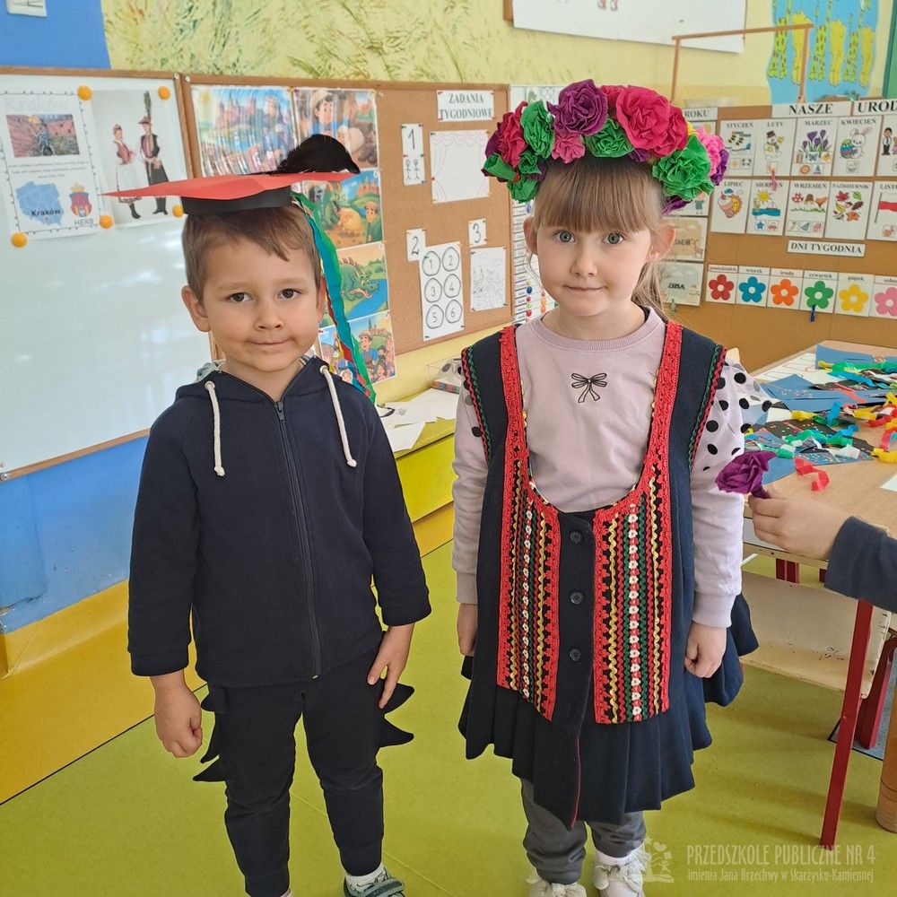 Podczas ostatnich zajęć Krasnale wybrały się w niezwykłą podróż do jednego z najpiękniejszych miast Polski – Krakowa. Dzieci poznały najważniejsze symbole miasta, takie jak Wawel, Wisłę oraz taniec narodowy Krakowiak. Szczególne zainteresowanie wzbudziła "Legenda o Smoku Wawelskim". Przedszkolaki z wielkim zaciekawieniem wysłuchały historii o smoku, który mieszkał u podnóża Wawelu, dzielnym szewczyku oraz sprytnym sposobie pokonania potwora. Następnie dzieci wcieliły się w bohaterów legendy i odegrały ją za pomocą teatrzyku kukiełkowego. Było dużo radości, śmiechu i kreatywnej zabawy. Nie zabrakło także aktywności muzycznej – przedszkolaki nauczyły się podstawowych kroków Krakowiaka i z ogromnym entuzjazmem tańczyły w rytm skocznej muzyki. Podczas zajęć dzieci poznały również tradycyjny strój krakowski - oglądały i przymierzały jego charakterystyczne elementy, takie jak kolorowy gorset, czapka krakuska, wstążki i korale. Każde dziecko wykonało pracę plastyczną inspirowaną strojem krakowskim. Dzieci ozdabiały papierowe elementy stroju – kaftan i gorset – wykorzystując kolorowe naklejki oraz bibułę. Powstały piękne, barwne prace, które stały się wspaniałą pamiątką z naszej „podróży” do Krakowa.