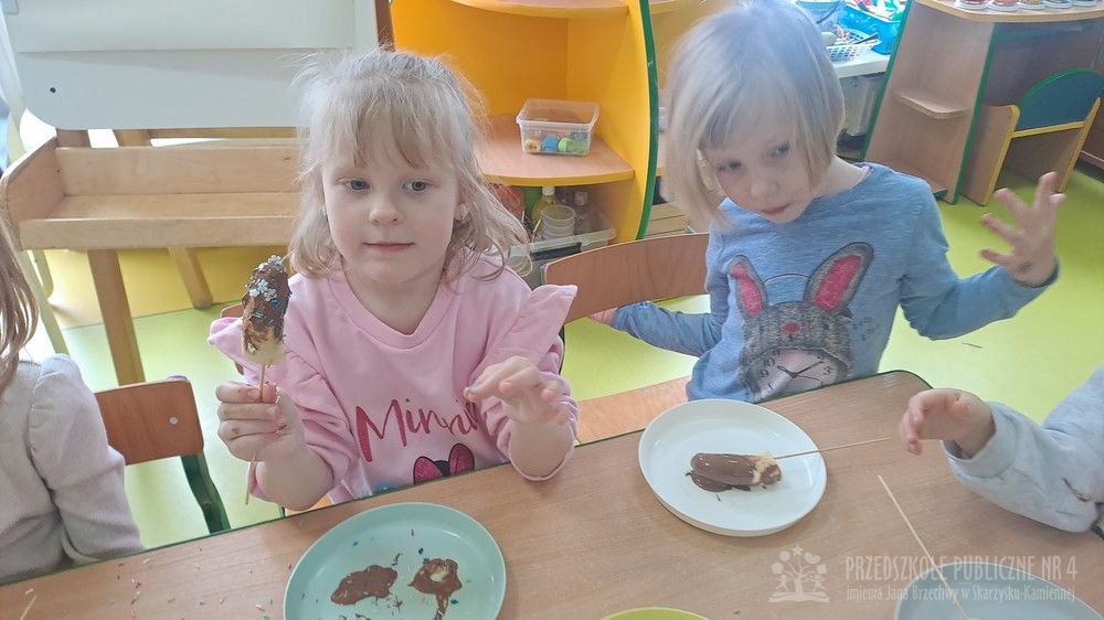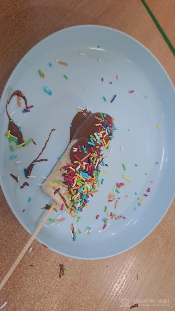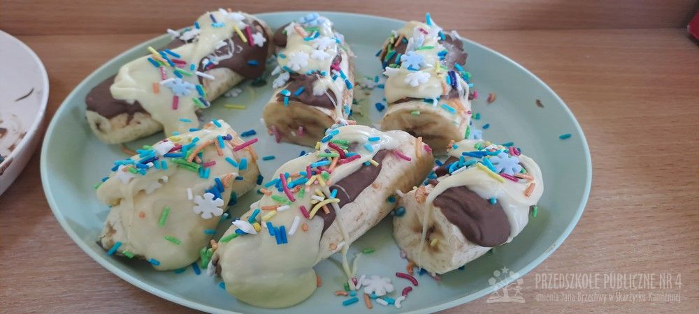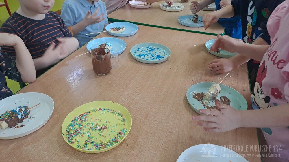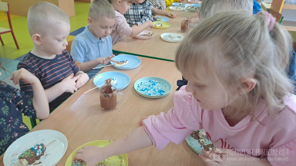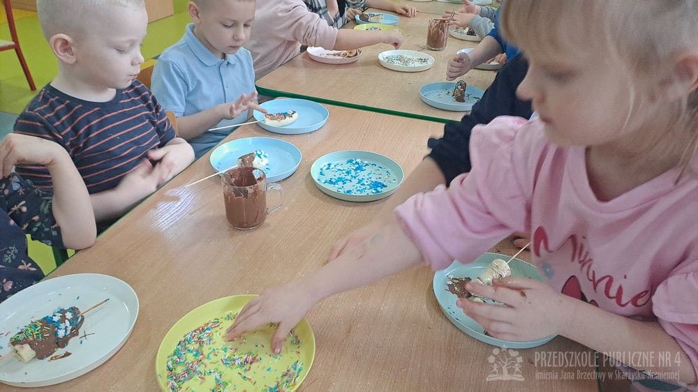 Dziś w naszej sali było wyjątkowo słodko i radośnie! Podczas zajęć dzieci poznały tradycję Tłustego Czwartku – dowiedziały się, dlaczego tego dnia jemy pączki i inne słodkości oraz jak dawniej świętowano zakończenie karnawału. Rozmawialiśmy o ulubionych smakołykach. Jednak największą atrakcją było przygotowanie własnego deseru. Każde dziecko samodzielnie stworzyło słodki przysmak – banana w czekoladzie. Najpierw poznaliśmy zasady bezpieczeństwa i higieny podczas pracy w kuchni, a następnie dzieci kroiły banany, maczały je w rozpuszczonej czekoladzie i dekorowały kolorową posypką. Pracy towarzyszyło dużo śmiechu i ogromne skupienie małych cukierników. Na zakończenie wszyscy wspólnie degustowaliśmy przygotowane słodkości. Dzieci były bardzo dumne ze swoich dzieł, a zajęcia pozwoliły rozwijaćmotorykę małą, samodzielność oraz współpracę w grupie zgodnie z koncepcją planu daltońskiego. To był bardzo smakowity i pełen wrażeń dzień!