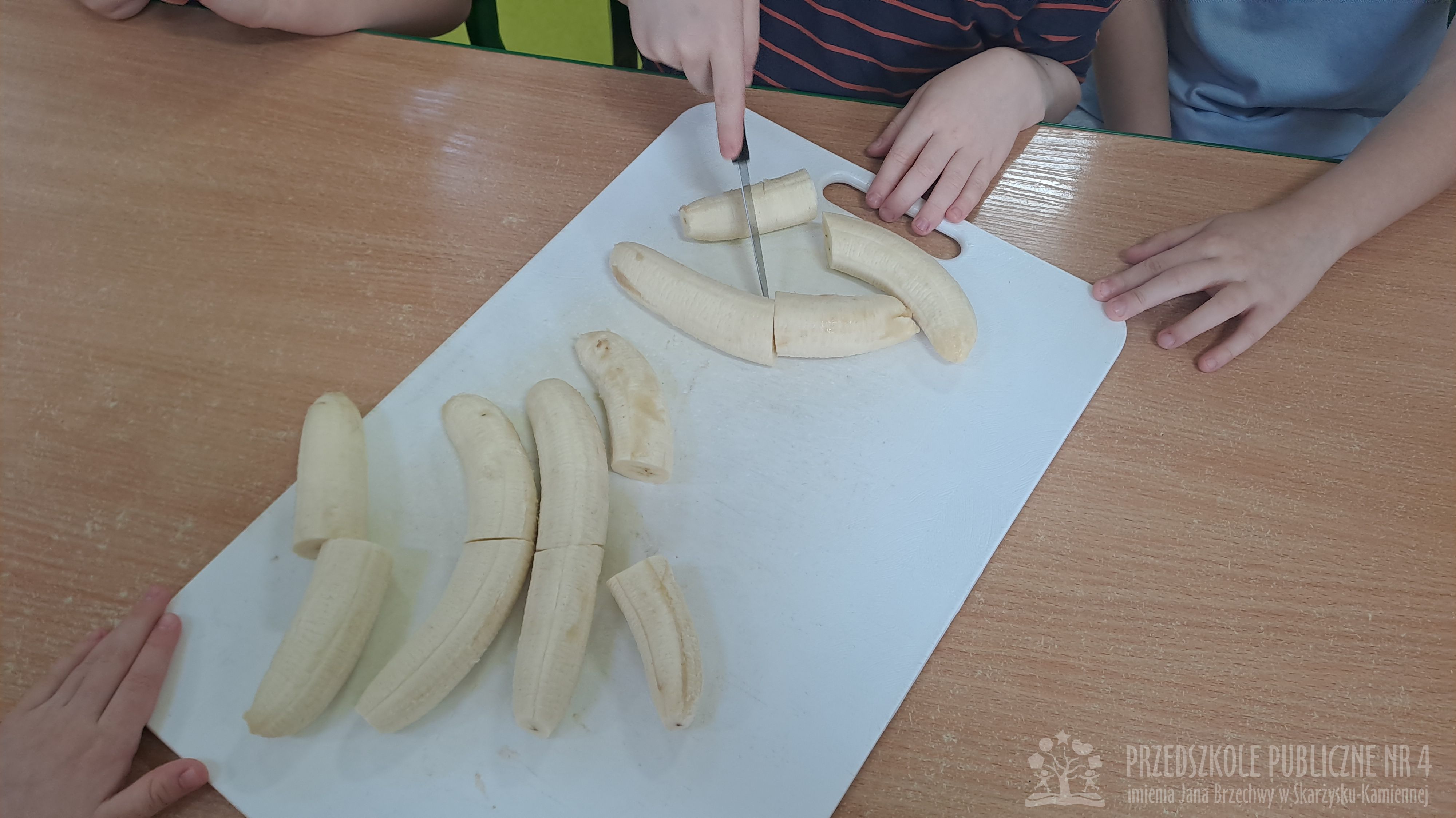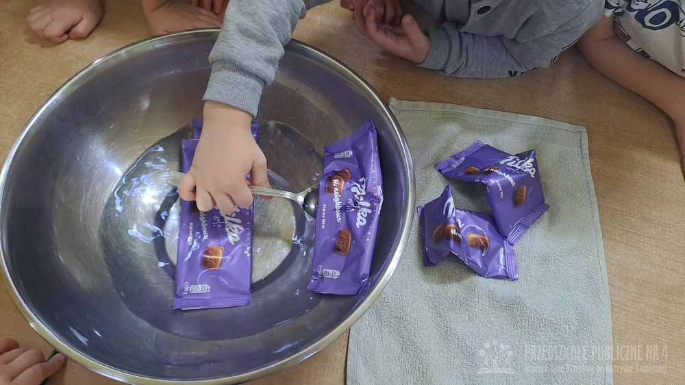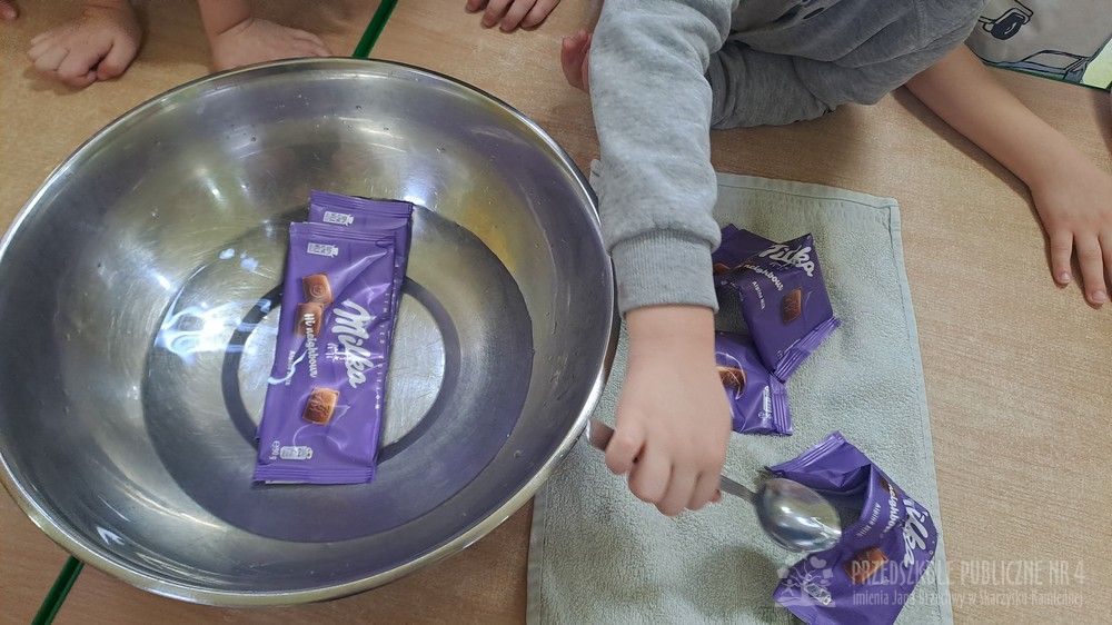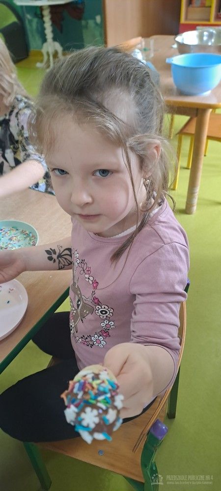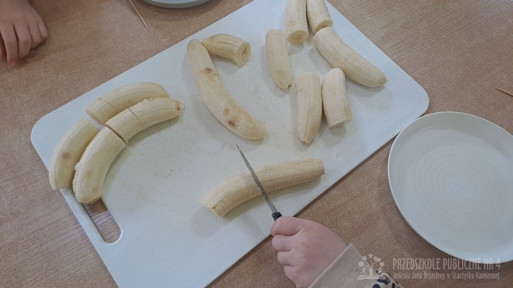 Dziś w naszej sali było wyjątkowo słodko i radośnie! Podczas zajęć dzieci poznały tradycję Tłustego Czwartku – dowiedziały się, dlaczego tego dnia jemy pączki i inne słodkości oraz jak dawniej świętowano zakończenie karnawału. Rozmawialiśmy o ulubionych smakołykach. Jednak największą atrakcją było przygotowanie własnego deseru. Każde dziecko samodzielnie stworzyło słodki przysmak – banana w czekoladzie. Najpierw poznaliśmy zasady bezpieczeństwa i higieny podczas pracy w kuchni, a następnie dzieci kroiły banany, maczały je w rozpuszczonej czekoladzie i dekorowały kolorową posypką. Pracy towarzyszyło dużo śmiechu i ogromne skupienie małych cukierników. Na zakończenie wszyscy wspólnie degustowaliśmy przygotowane słodkości. Dzieci były bardzo dumne ze swoich dzieł, a zajęcia pozwoliły rozwijaćmotorykę małą, samodzielność oraz współpracę w grupie zgodnie z koncepcją planu daltońskiego. To był bardzo smakowity i pełen wrażeń dzień!