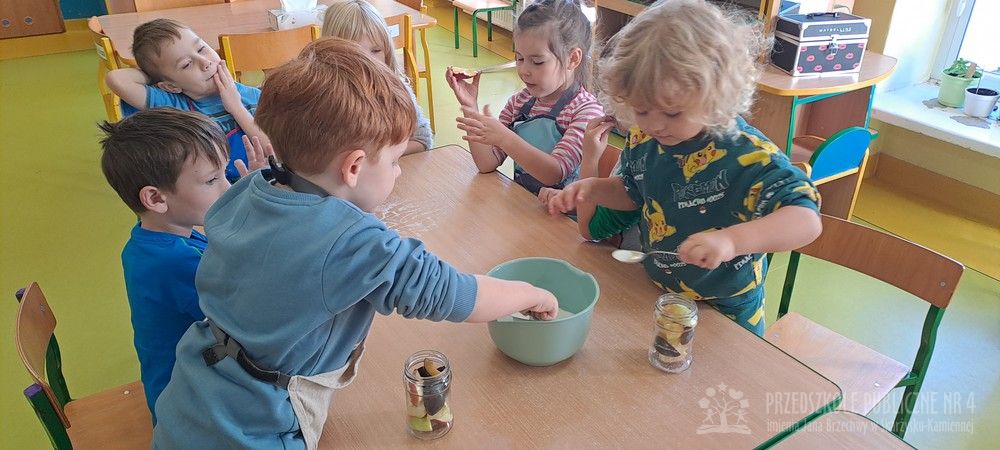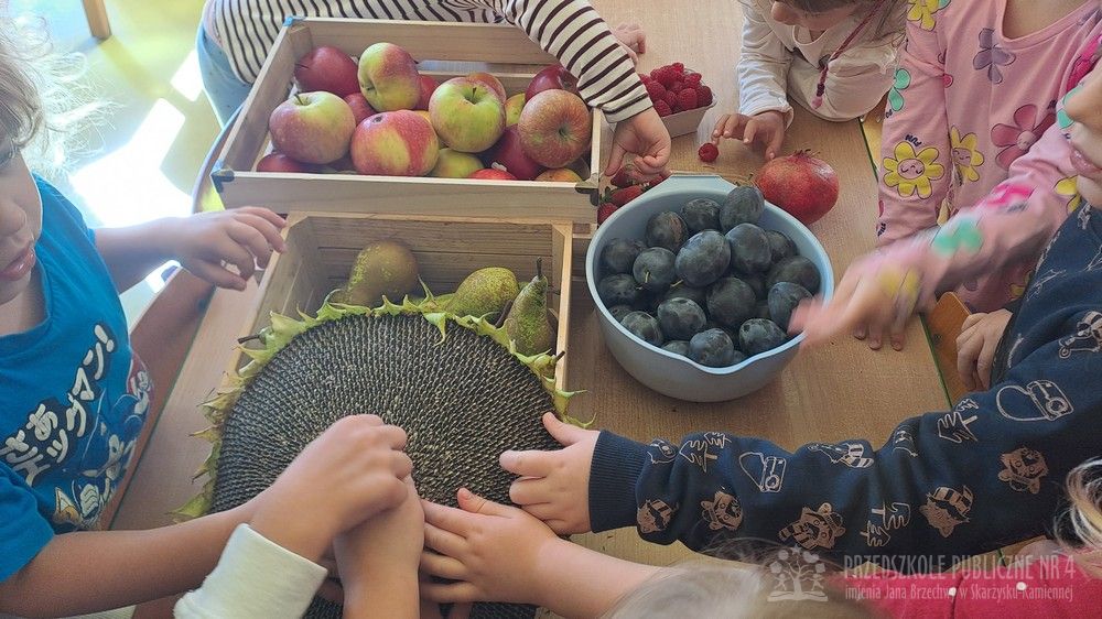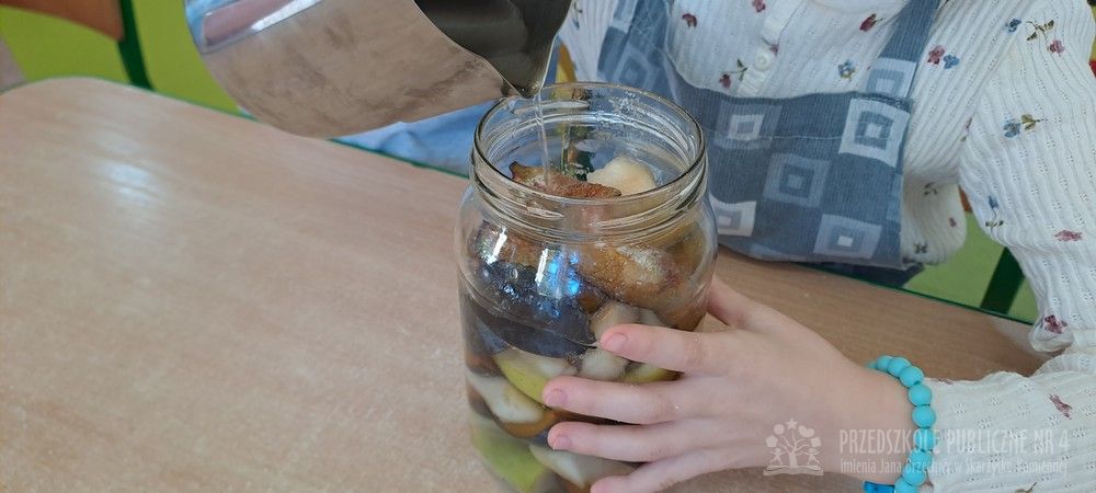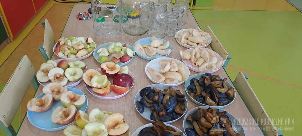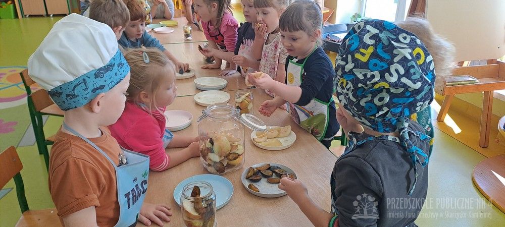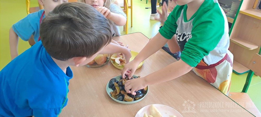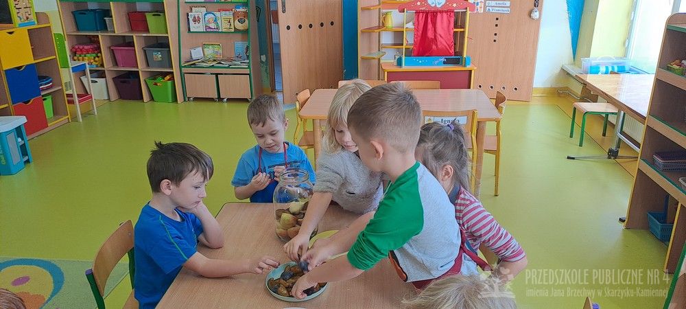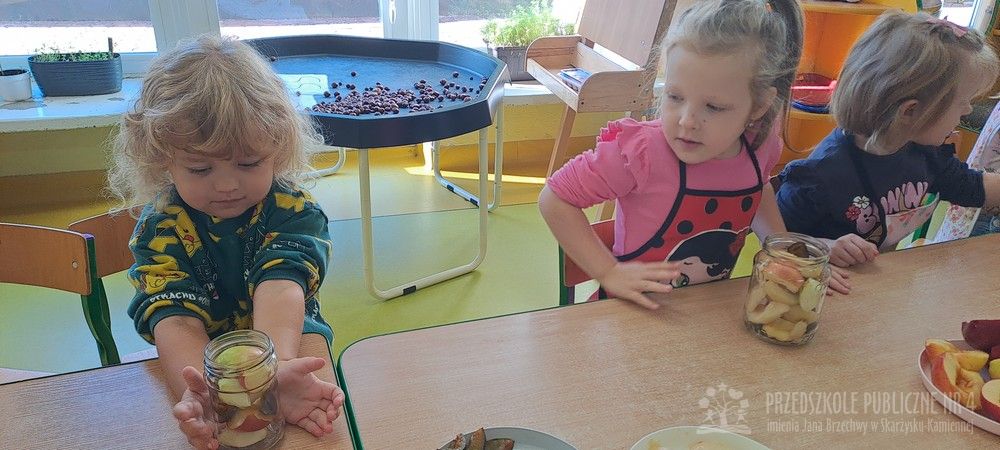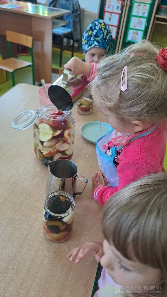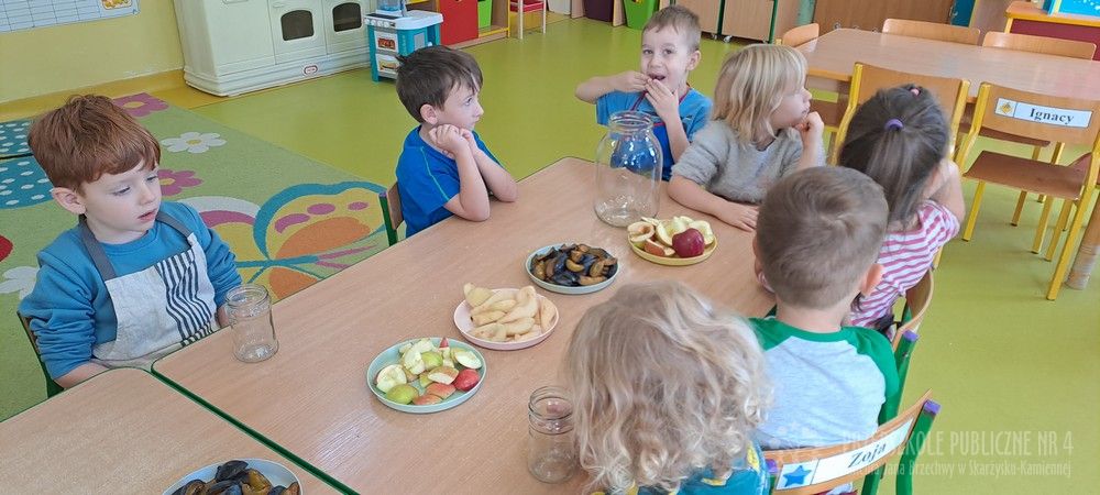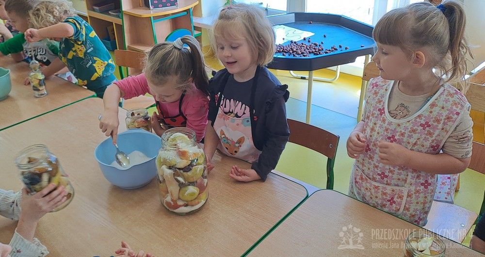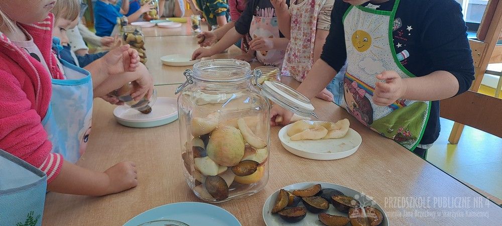 Jesień to czas zbiorów warzyw i owoców oraz przygotowywania różnych przetworów. Krasnale wybrały się do pobliskiego warzywniaka na zakupy, gdzie miały okazję poznać wybrane warzywa i owoce. Dzieci wykazały się bardzo dużą wiedzą w tym zakresie i odpowiedziały na wszystkie pytania zadawane przez panią ekspedientkę. Następnie wybrały owoce, które zakupiliśmy - jabłka, gruszki, śliwki, a nawet maliny i truskawki. Uwagę Krasnali przykuł duży słonecznik, który również postanowiliśmy kupić. Następnego dnia z zakupionych owoców wspólnie przygotowaliśmy kompoty. Podczas zajęć kulinarnych dzieci współpracowały w parach oraz małych zespołach. Wykazały się także dużą samodzielnością wkładając owoce do słoików, zasypując je cukrem i zalewając wodą. Krasnale dowiedziały się także, na czym polega pasteryzacja, której zostały poddane nasze przetwory. Takie zajęcia idealnie wpisują się w koncepcję planu daltońskiego, rozwijając samodzielność, odpowiedzialność, współpracę oraz pozwalają dzieciom na aktywne działanie.