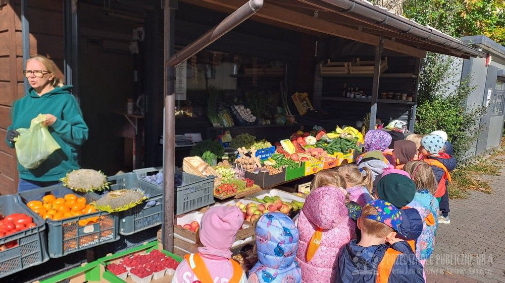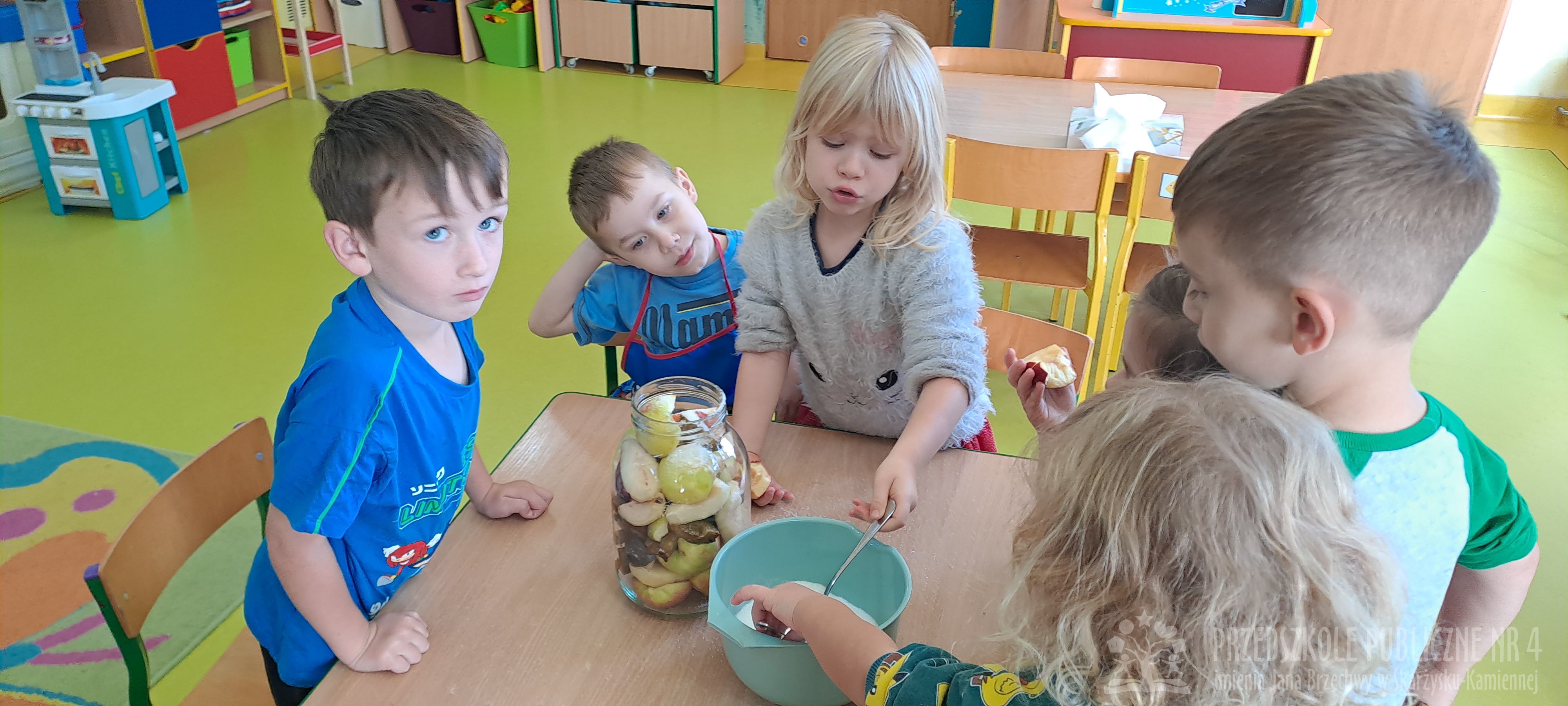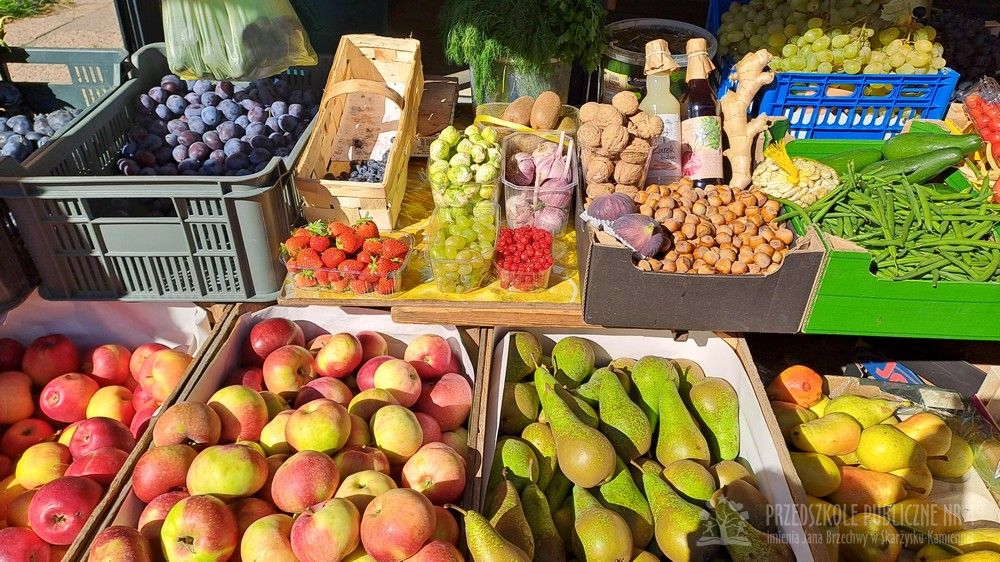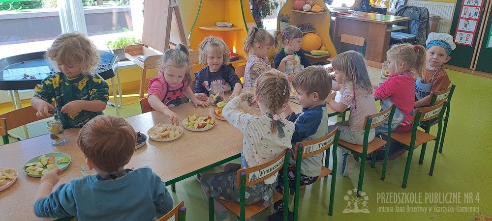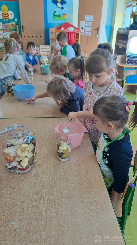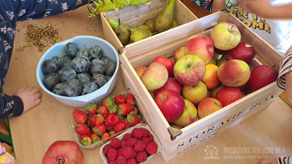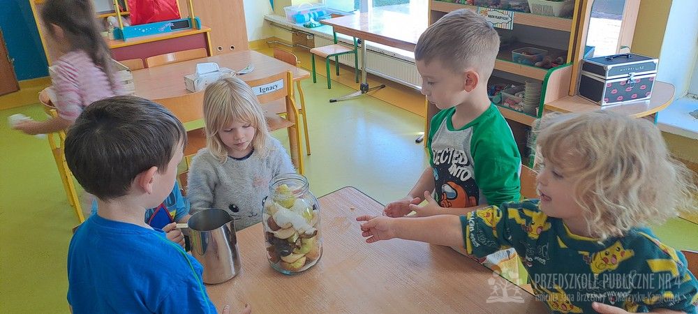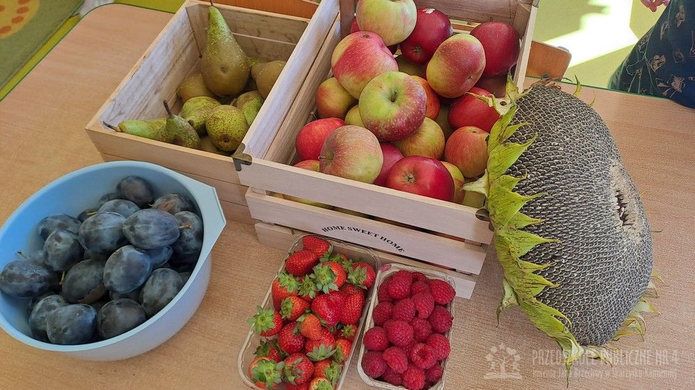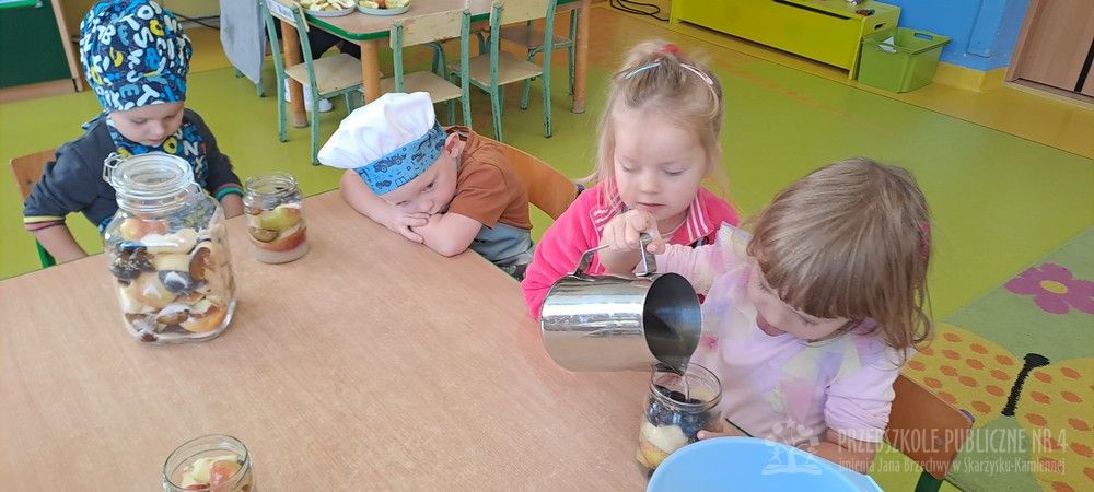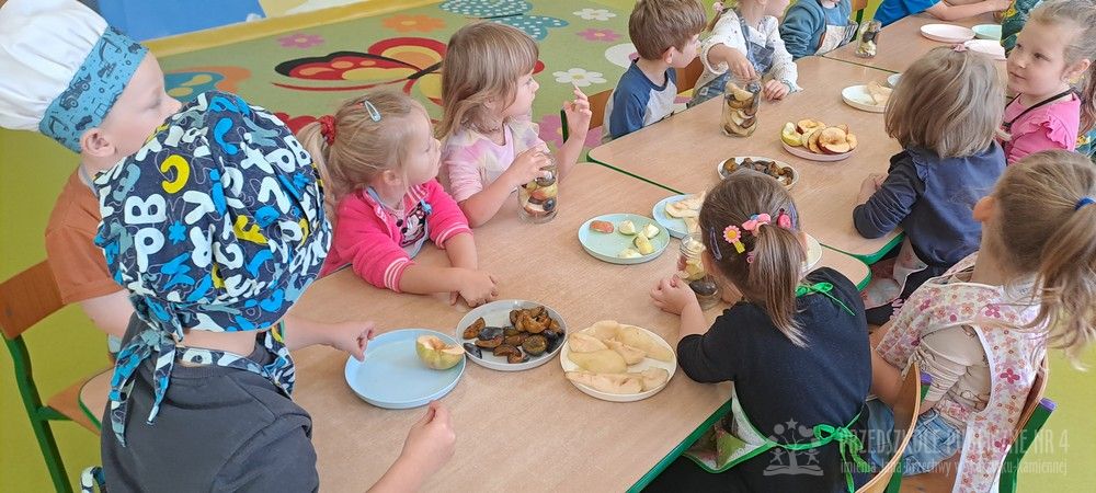 Jesień to czas zbiorów warzyw i owoców oraz przygotowywania różnych przetworów. Krasnale wybrały się do pobliskiego warzywniaka na zakupy, gdzie miały okazję poznać wybrane warzywa i owoce. Dzieci wykazały się bardzo dużą wiedzą w tym zakresie i odpowiedziały na wszystkie pytania zadawane przez panią ekspedientkę. Następnie wybrały owoce, które zakupiliśmy - jabłka, gruszki, śliwki, a nawet maliny i truskawki. Uwagę Krasnali przykuł duży słonecznik, który również postanowiliśmy kupić. Następnego dnia z zakupionych owoców wspólnie przygotowaliśmy kompoty. Podczas zajęć kulinarnych dzieci współpracowały w parach oraz małych zespołach. Wykazały się także dużą samodzielnością wkładając owoce do słoików, zasypując je cukrem i zalewając wodą. Krasnale dowiedziały się także, na czym polega pasteryzacja, której zostały poddane nasze przetwory. Takie zajęcia idealnie wpisują się w koncepcję planu daltońskiego, rozwijając samodzielność, odpowiedzialność, współpracę oraz pozwalają dzieciom na aktywne działanie.