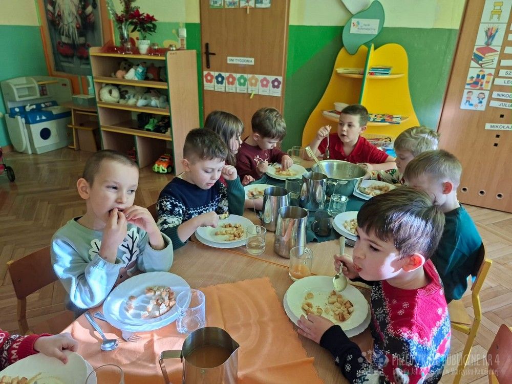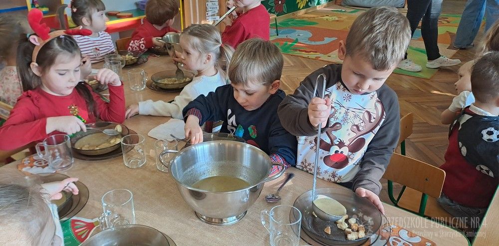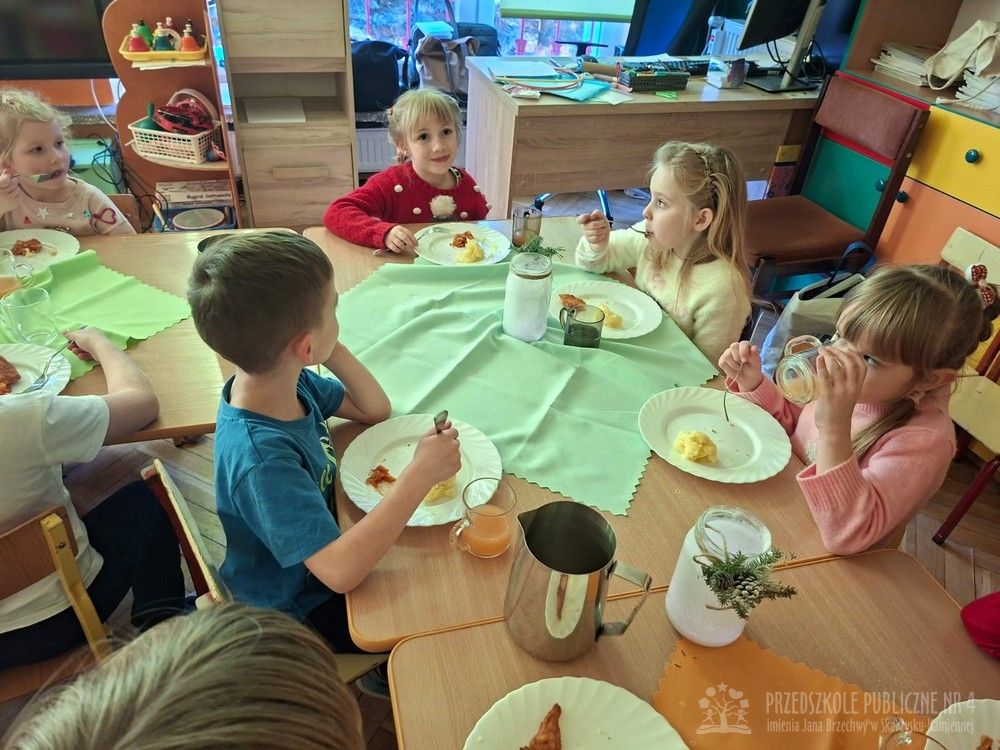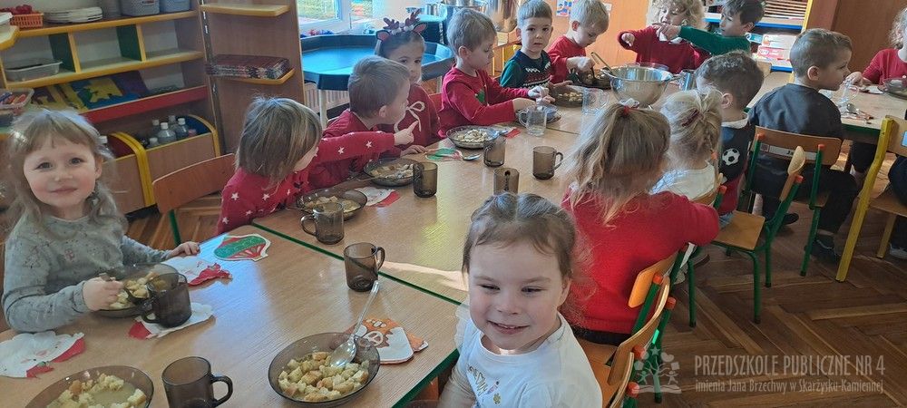 Dzieci ubrane w świąteczne sweterki z radością zasiadły do stołów. Wspólny posiłek był okazją do rozmów, uśmiechów oraz kultywowania świątecznych tradycji.