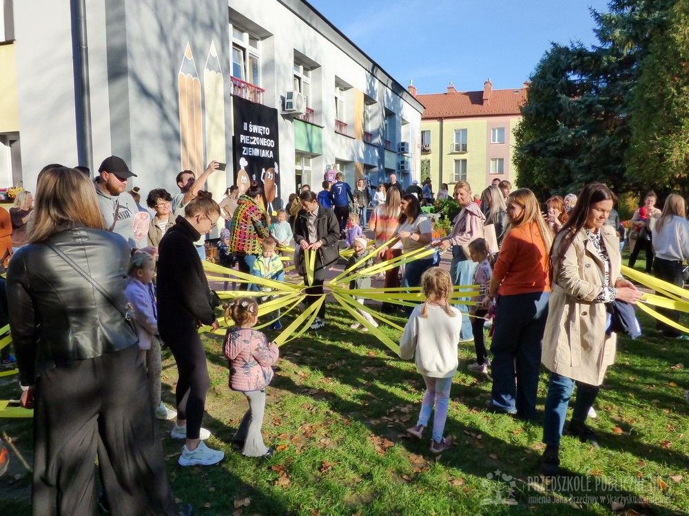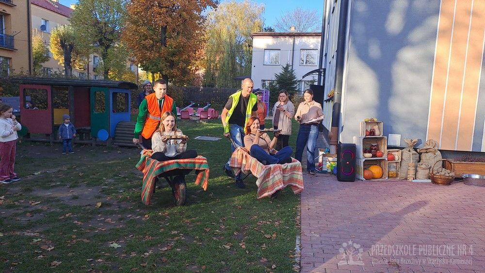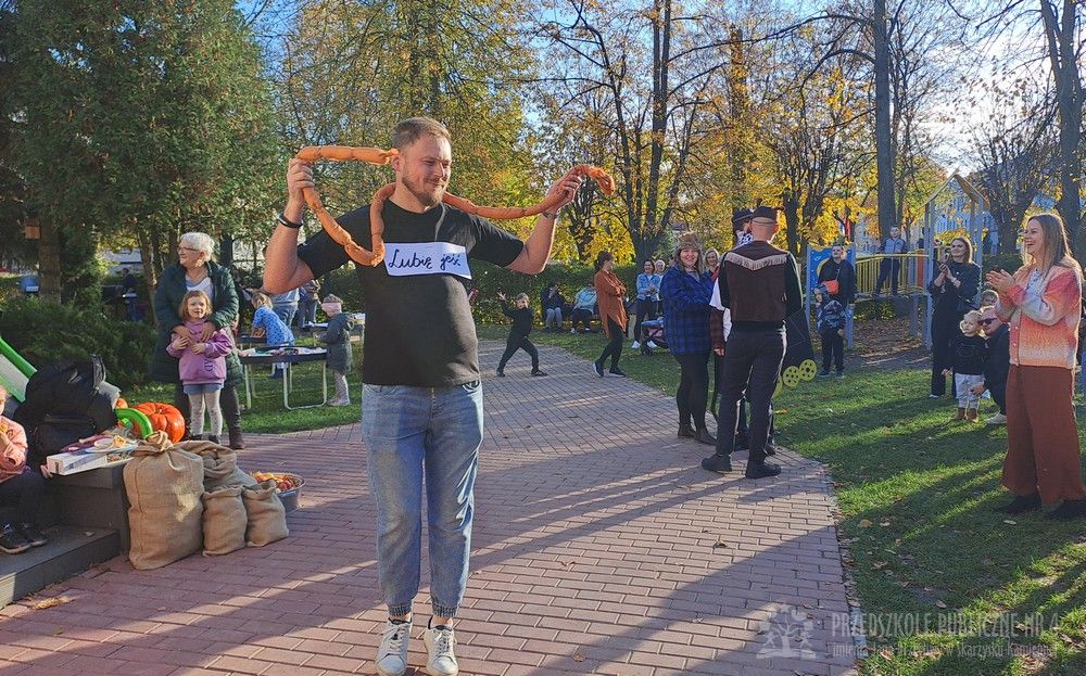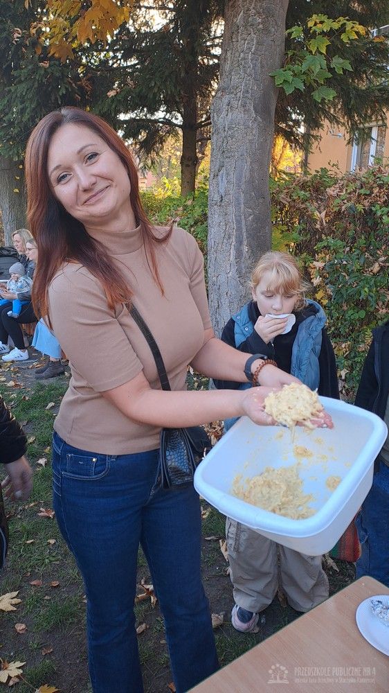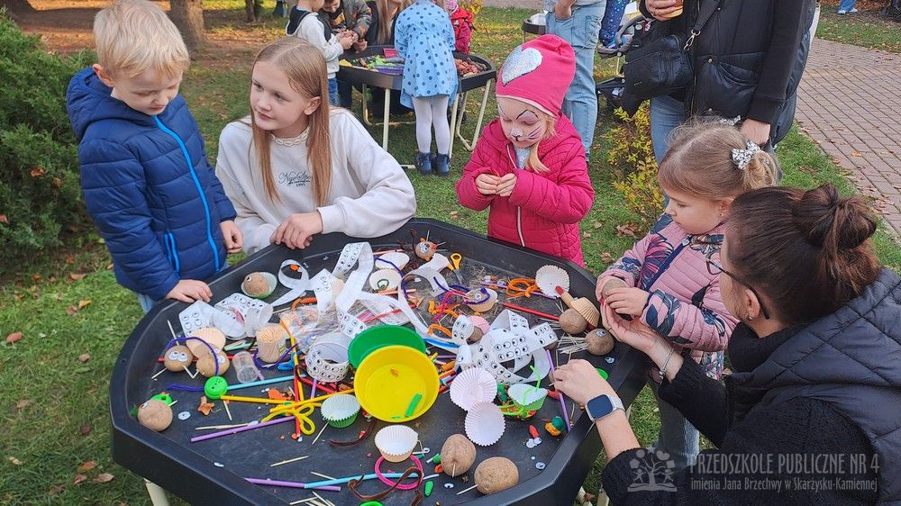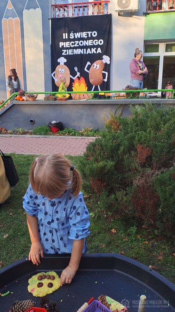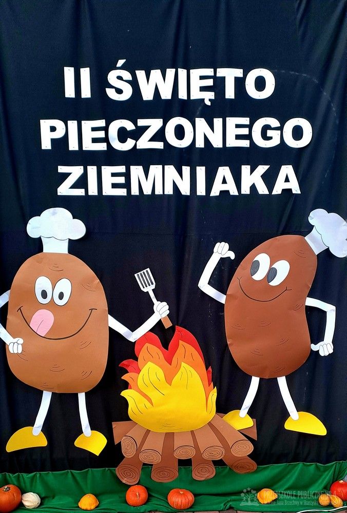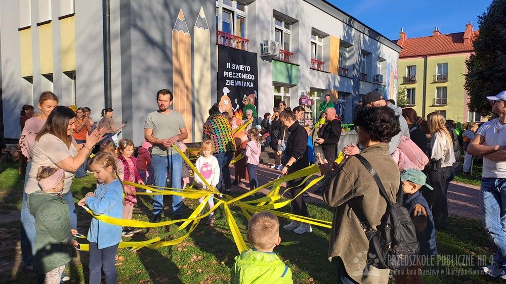 W czwartek 23 października w naszym przedszkolu zapanował radosny i jesienny nastrój, a wszystko za sprawą cudownej pogody oraz uwielbianego przez wszystkich kartofla, którego czciliśmy podczas „II Święta Pieczonego Ziemniaka”. W tym dniu w naszym ogrodzie zebrała się cała społeczność przedszkolna - Przedszkolaki wraz z Rodzicami oraz wszyscy pracownicy. Swoją obecnością zaszczycili nas także: Prezydent Miasta Pan Arkadiusz Bogucki, Naczelnik Wydziału Edukacji Pan Robert Wójcik, Dyrektor ZPO nr 4 Pani Renata Karpeta. Uroczystość rozpoczęła się od wspólnych zabaw przy jesiennej muzyce. Następnie przyszedł czas na inscenizację wiersza J.Tuwima "Lokomotywa", w której zaprezentowali się Rodzice. Kolejnym punktem programu były wesołe konkurencje, w których rywalizowali Rodzice - wykopywanie ziemniaków z wykorzystaniem różnych rekwizytów, a następnie przygotowywanie ciasta na placki ziemniaczane. Dużo emocji wywołał wyścig taczek. Nie zabrakło także twórczych zadań. Dzieci zamieniły ziemniaki w małe dzieła sztuki - wykonywały śmieszne ludziki z wykorzystaniem wykałaczek, a także odbijały stempelki tworząc z nich jesienne wzory, lepiły z gliny oraz tkały na krosnach. Radość i pomysłowość maluchów były nieograniczone! Kulminacyjnym punktem dnia była oczywiście degustacja pieczonych ziemniaków oraz kiełbasek. Wśród kulinarnych przysmaków znalazły się także chleb ze smalcem oraz różnego rodzaju ciasta. Dużym zainteresowaniem wśród przedszkolaków cieszyło się malowanie twarzy oraz pchli targ, gdzie można było nabyć m. in. gry, zabawki, puzzle, książki.„Święto Pieczonego Ziemniaka” było nie tylko okazją do wesołej zabawy i sportowej rywalizacji, ale również do integracji i wzbogacenia wiedzy na temat darów jesieni. Wszystkie dzieci bawiły się wyśmienicie, a uśmiechy nie schodziły z ich twarzy! Już nie możemy się doczekać przyszłorocznego, równie udanego, ziemniaczanego świętowania!