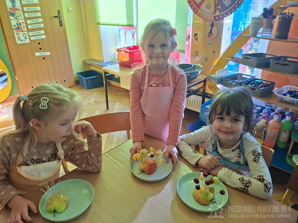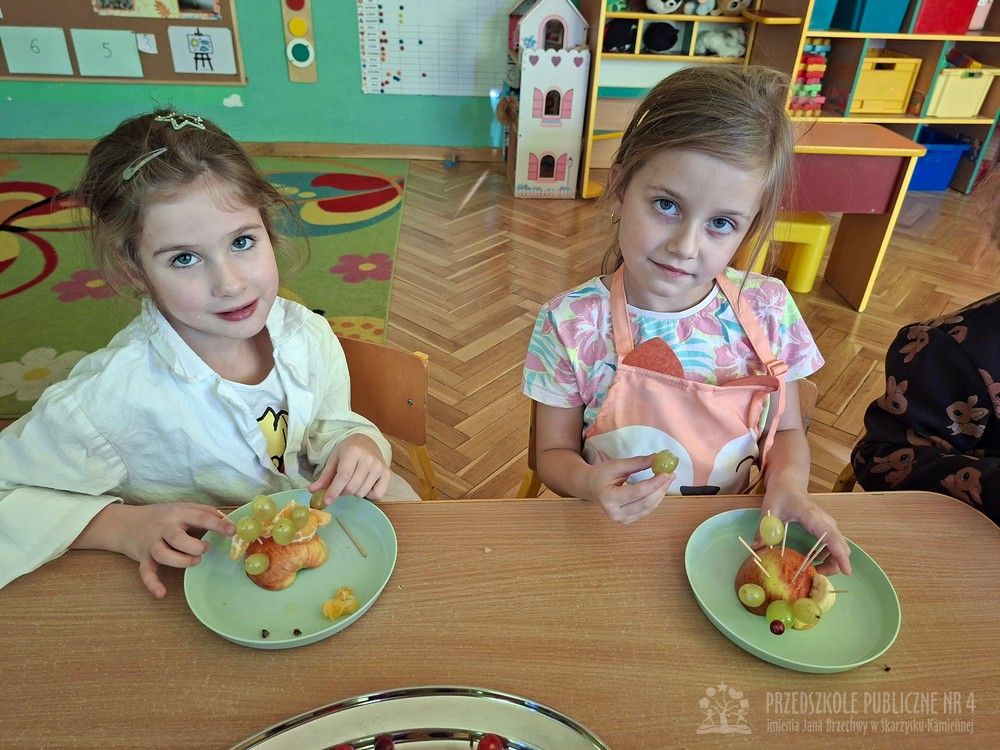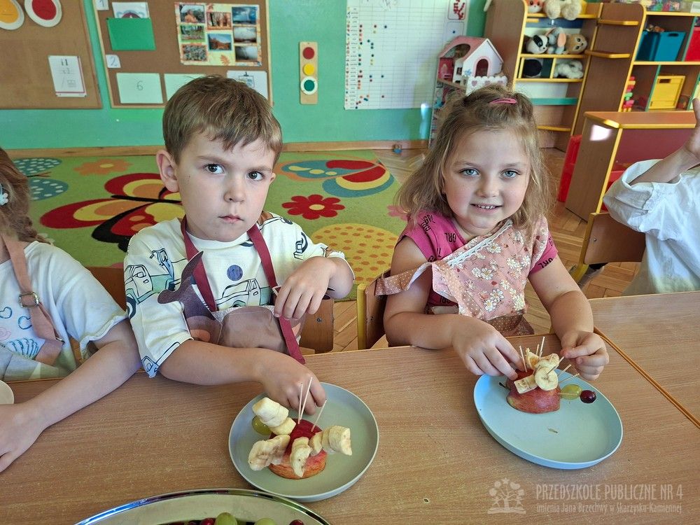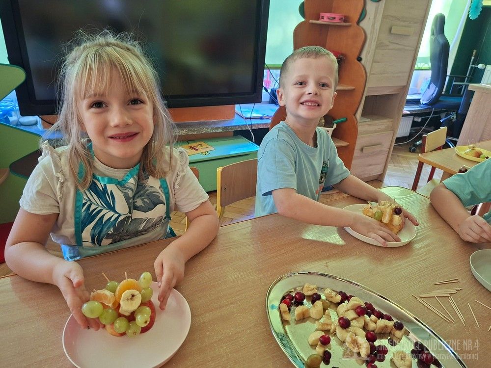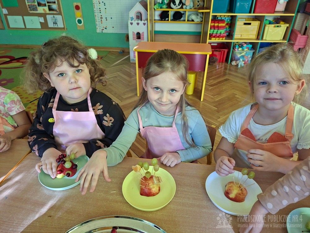 Dzsiejszego dnia Słoneczka poznały wartości odżywcze owoców. Dzieci własnoręcznie wykonały owocowe jeże, samodzielnie kroiły ulubione owoce na kawałki, po czym komponowały i nadziewały je na patyczki. Na końcu nastąpiła degustacja powstałych jeży.