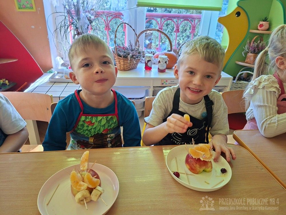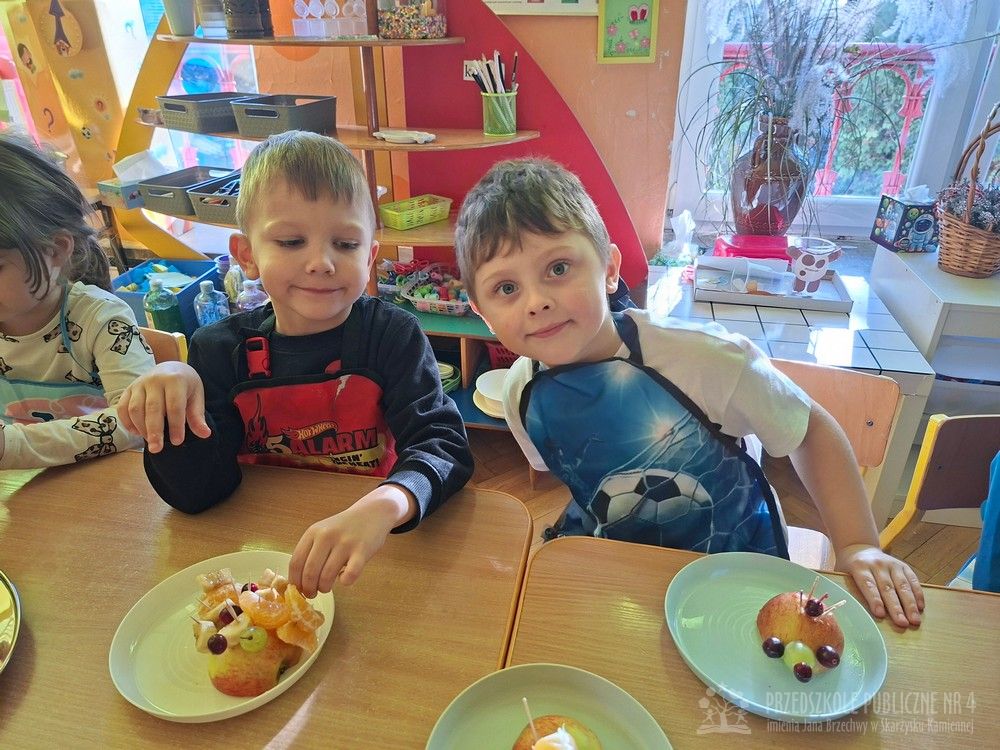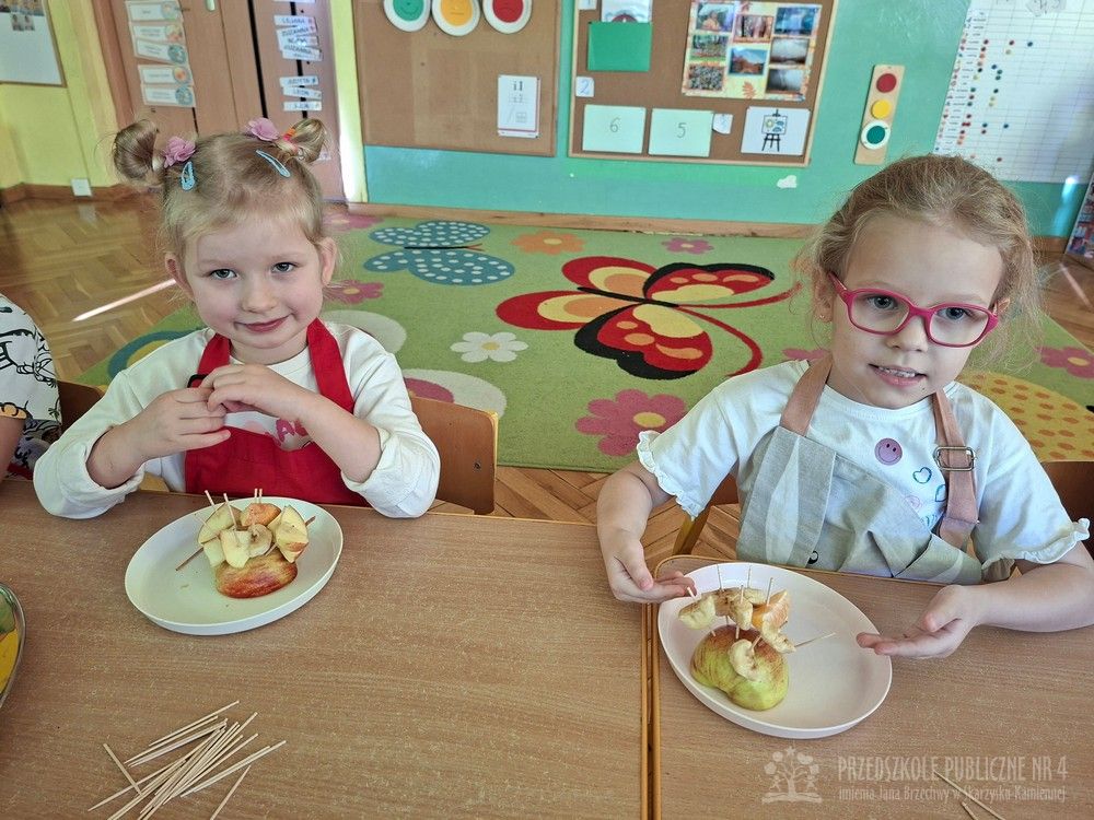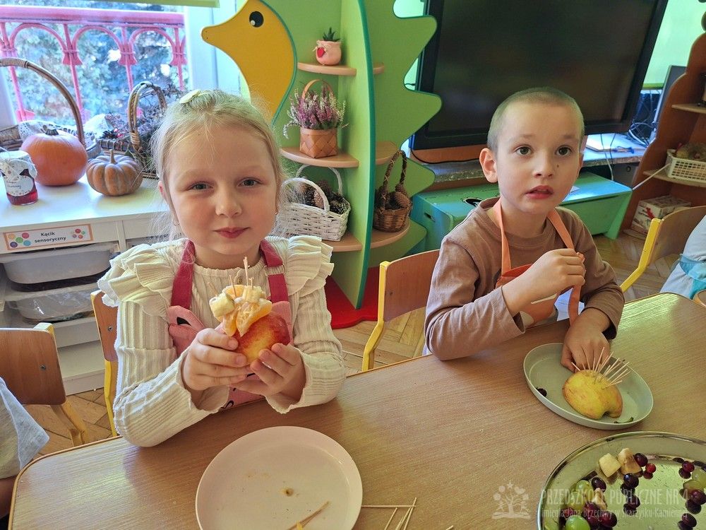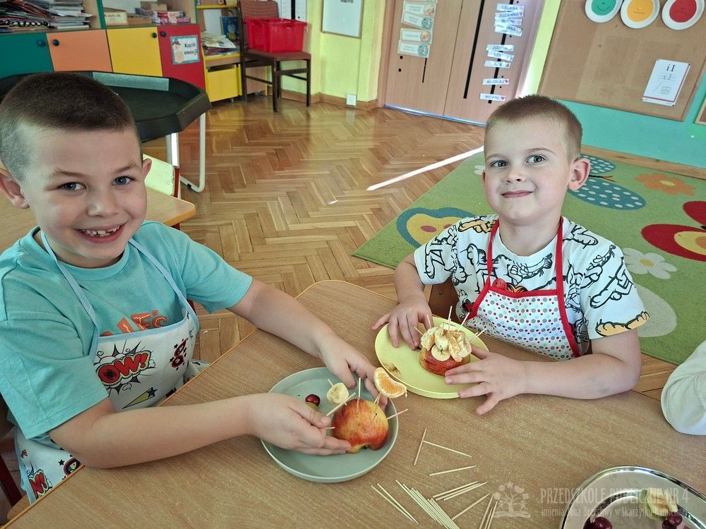Dzsiejszego dnia Słoneczka poznały wartości odżywcze owoców. Dzieci własnoręcznie wykonały owocowe jeże, samodzielnie kroiły ulubione owoce na kawałki, po czym komponowały i nadziewały je na patyczki. Na końcu nastąpiła degustacja powstałych jeży.