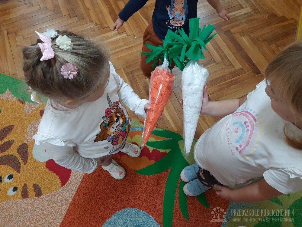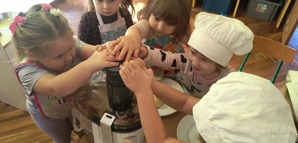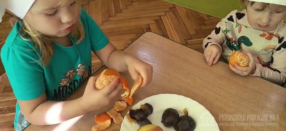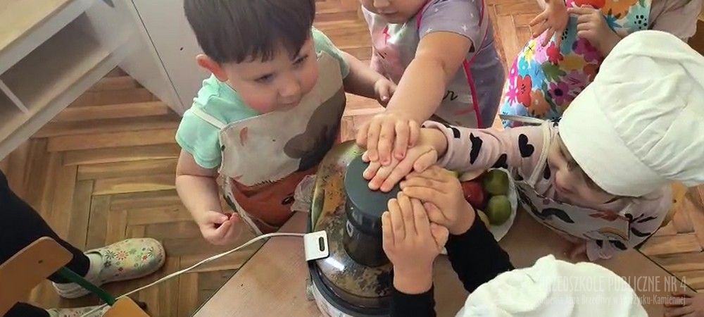 Maluszki ucząc się o owocach i warzywach mogły je dotknąć, wąchać, spróbować - doświadczać wszystkimi zmysłami. Dzieci podczas zajęć nazywały, rozróżniały warzywa i owoce, a nawet przygotowały pyszny sok, który ze smakiem spałaszowały.