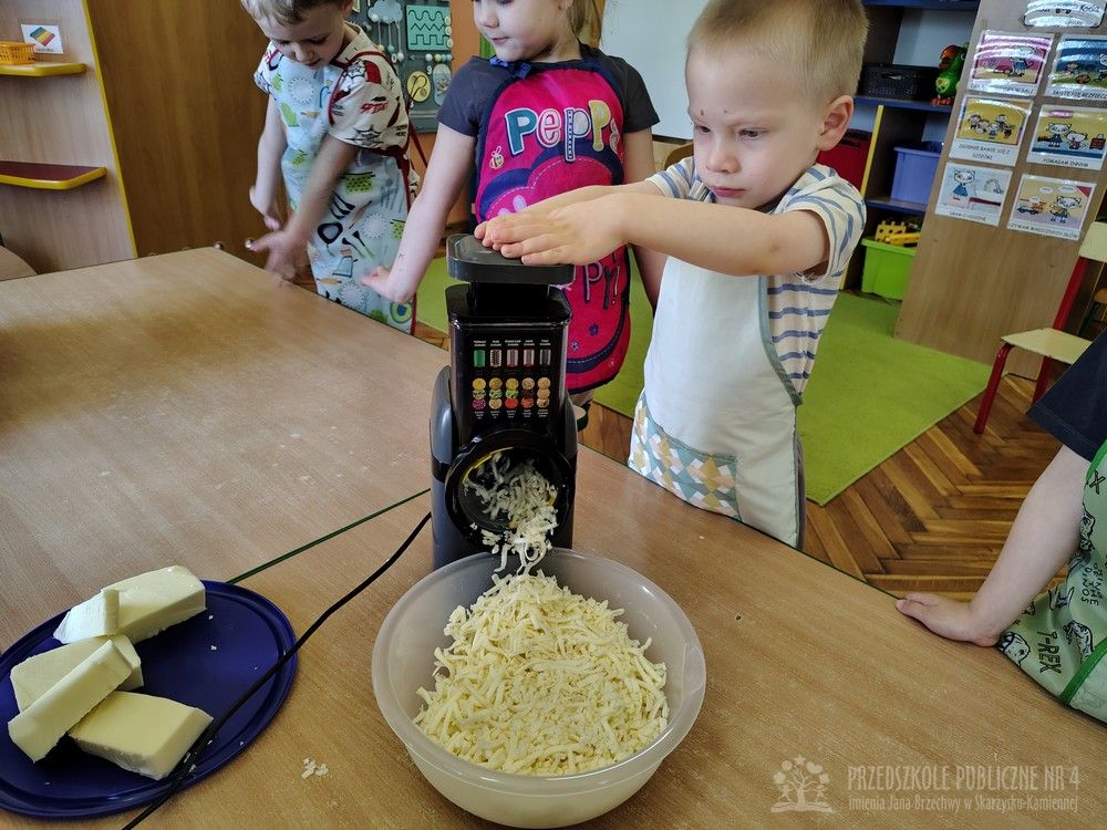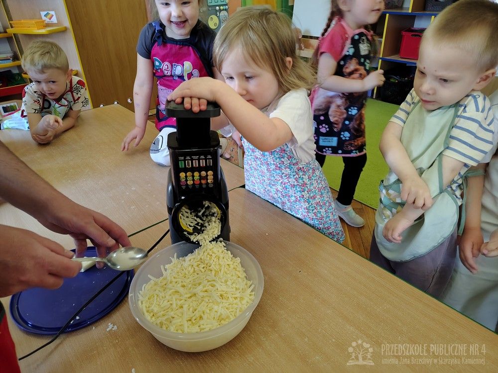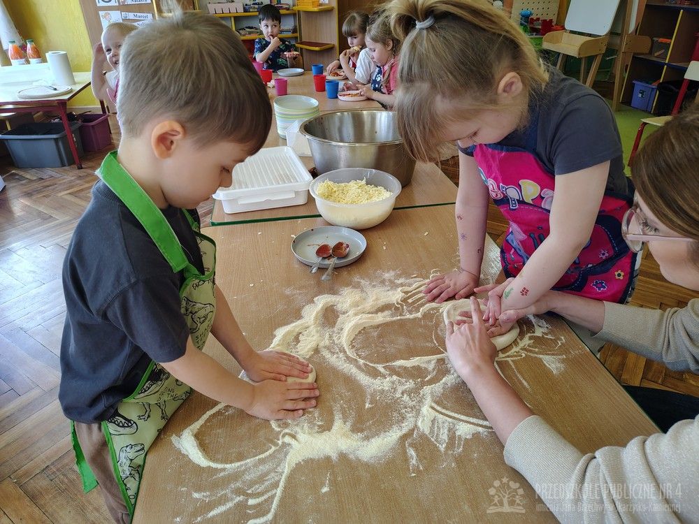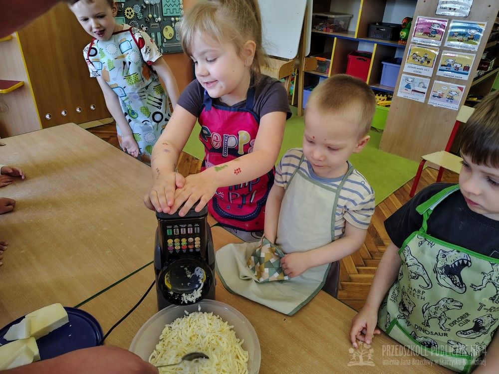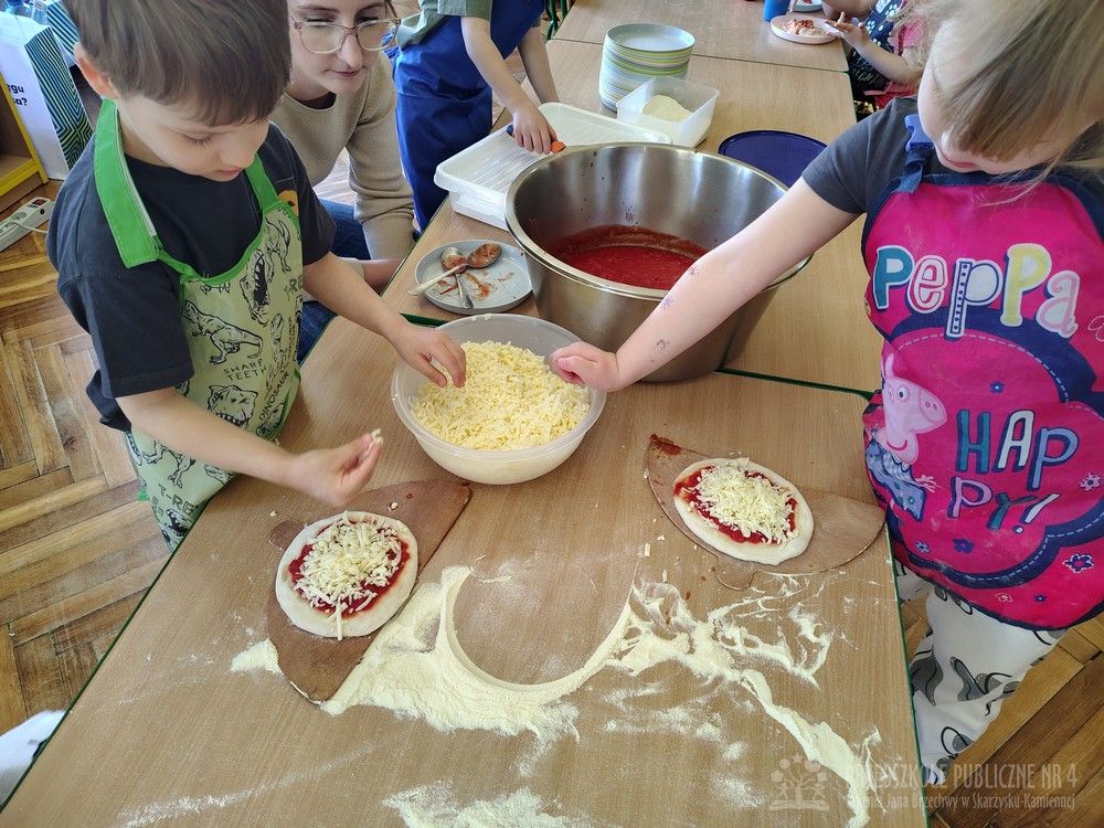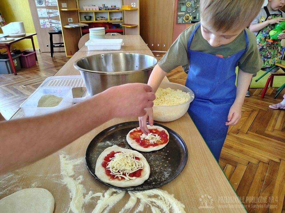 Dzieci z ogromnym zaangażowaniem uczestniczyły w warsztatach – samodzielnie formowały ciasto, smarowały je sosem pomidorowym oraz dodawały sera- mozarelli. Było to nie tylko świetne doświadczenie kulinarne, ale także okazja do rozwijania samodzielności i współpracy w grupie, a to przecież jedne z filarów planu daltońskiego.