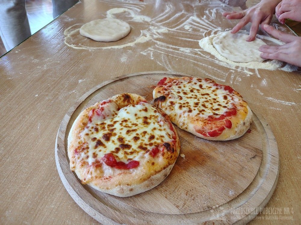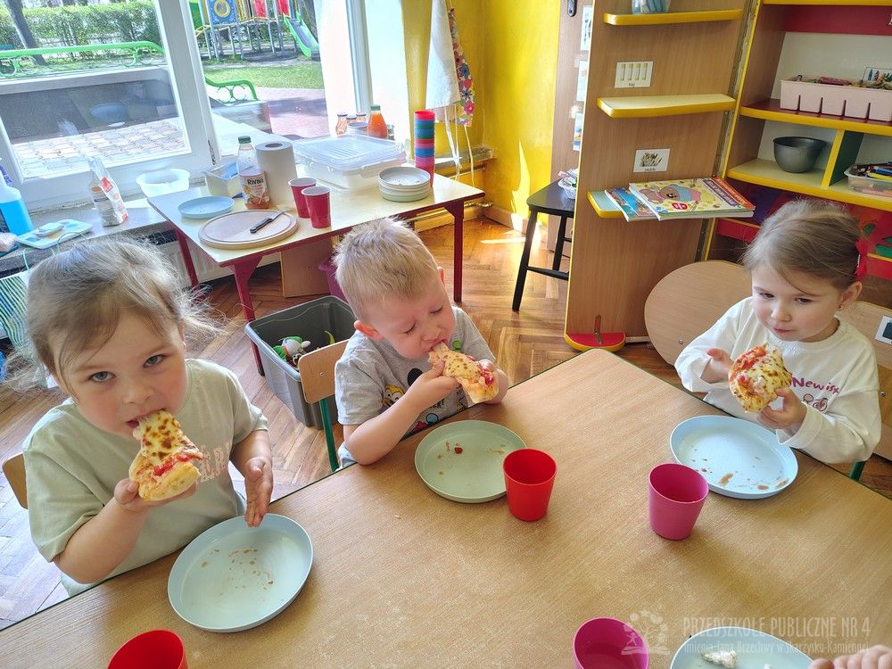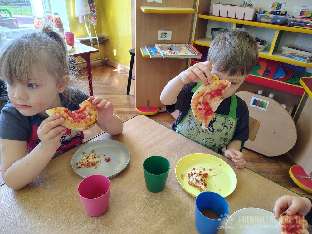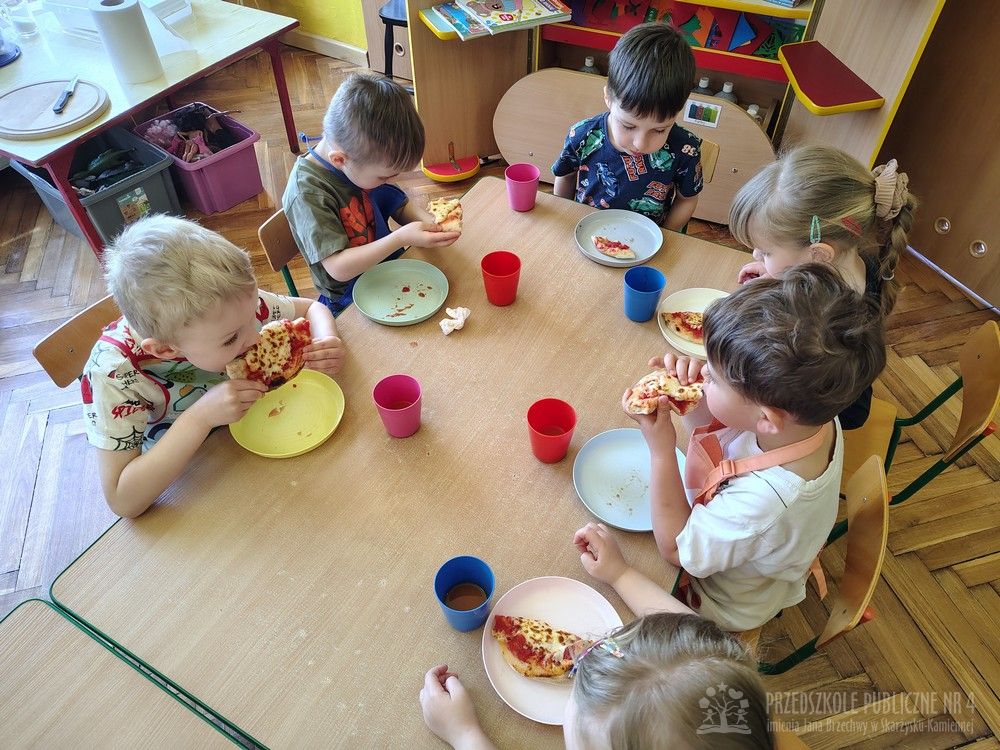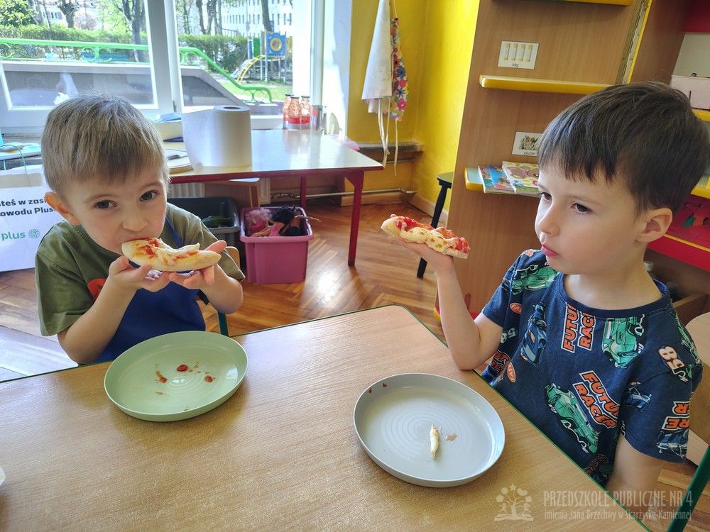 Po zakończeniu pieczenia mali kucharze z dumą zaprezentowali swoje wypieki, które ze smakiem spałaszowały oraz zaprosili kolegów z przedszkola na wspólną degustację. Przygotowana przez dzieci pizza cieszyła się dużym uznaniem i szybko zniknęła z talerzy.