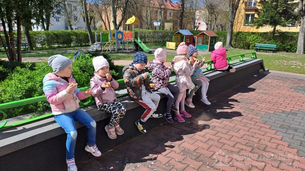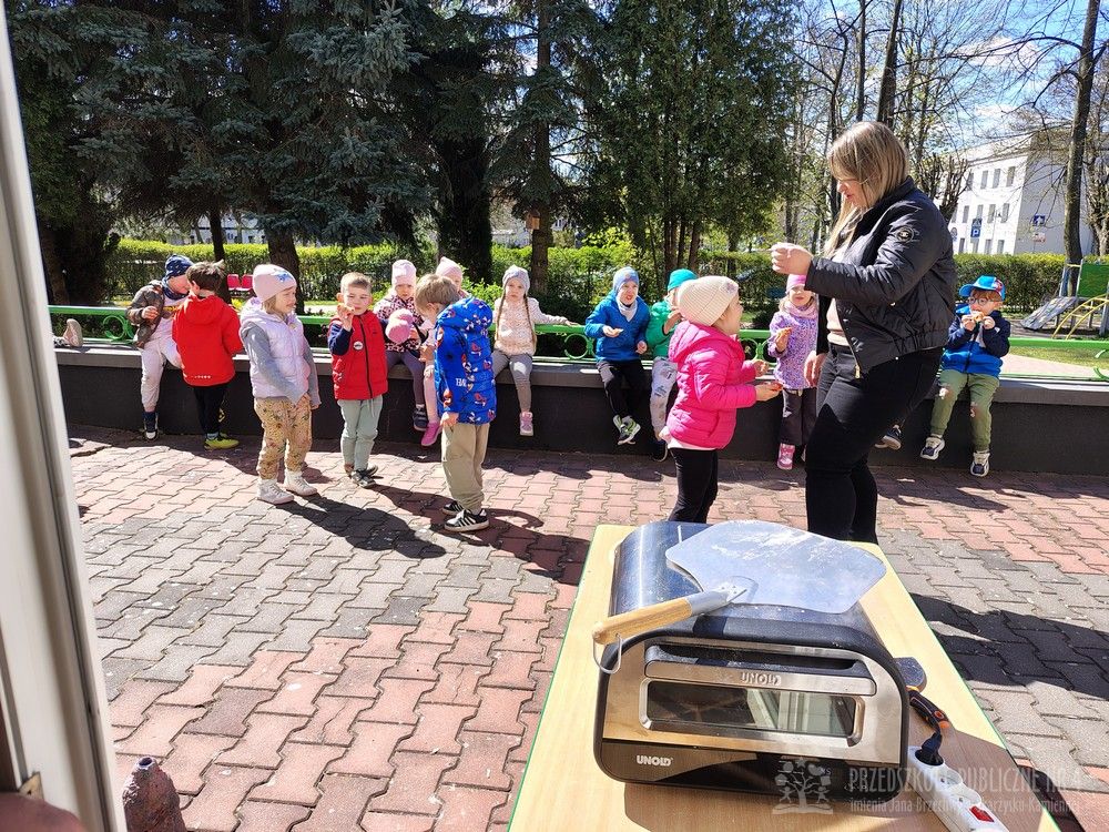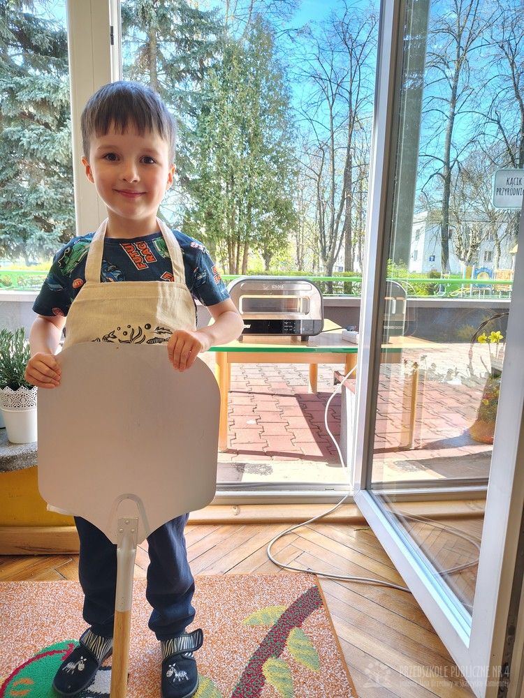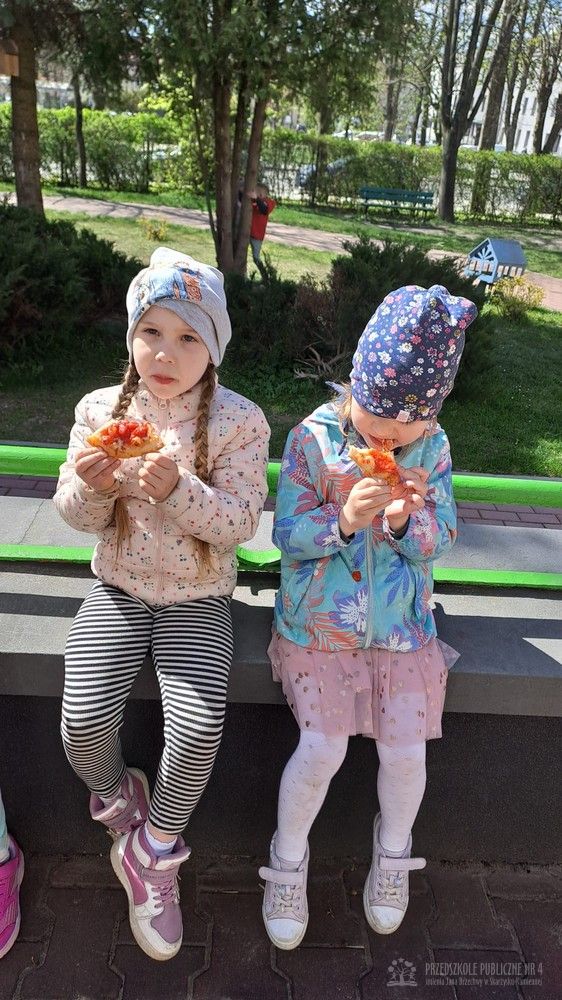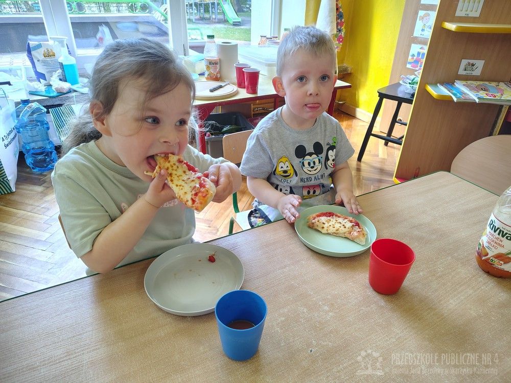 Po zakończeniu pieczenia mali kucharze z dumą zaprezentowali swoje wypieki, które ze smakiem spałaszowały oraz zaprosili kolegów z przedszkola na wspólną degustację. Przygotowana przez dzieci pizza cieszyła się dużym uznaniem i szybko zniknęła z talerzy.