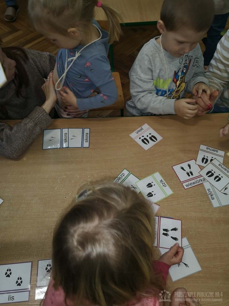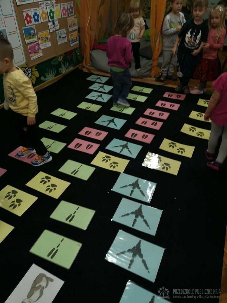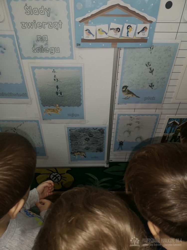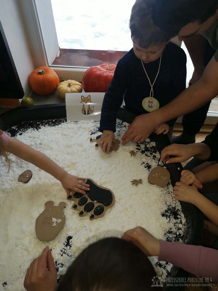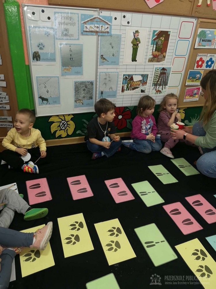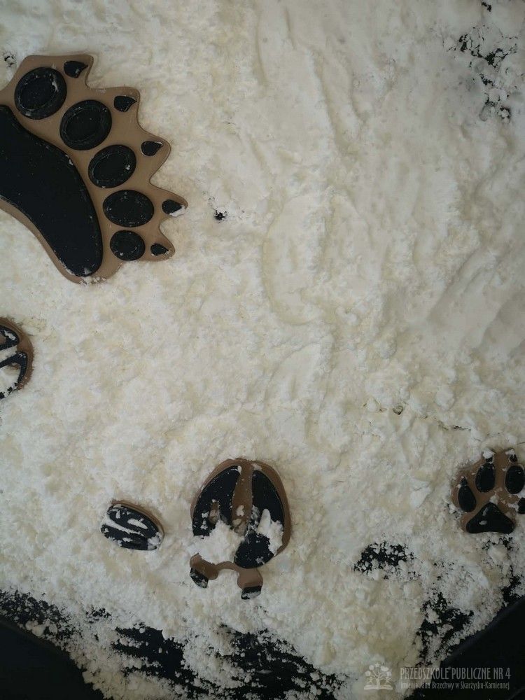Zajęcia rozpoczęły się od rozmowy kierowanej na temat zimy i warunków życia zwierząt w tym okresie. Dzieci oglądały ilustracje przedstawiające różne tropy zwierząt (m.in. zająca, lisa, sarny, ptaka) i próbowały je rozpoznawać. Następnie brały udział w zabawach ruchowych i dydaktycznych, utrwalających zdobyte wiadomości.