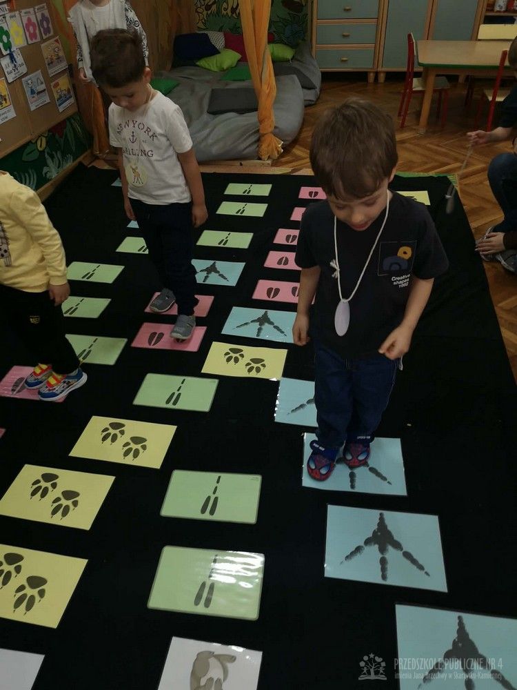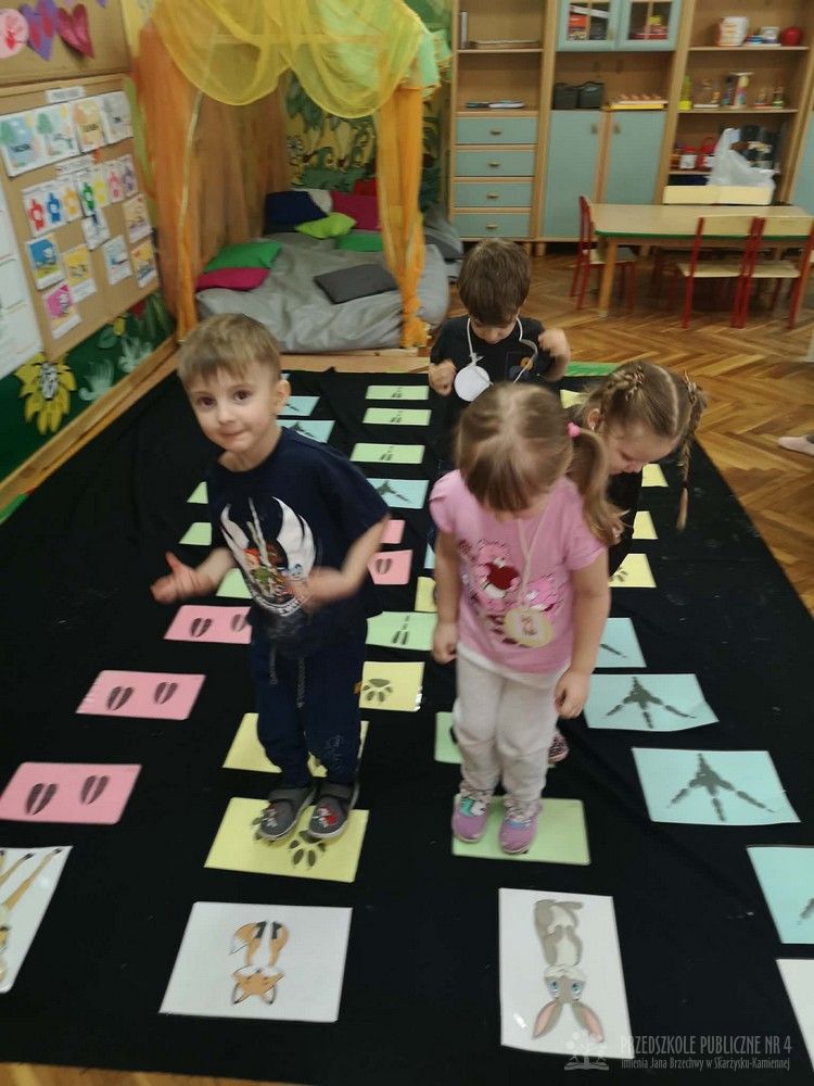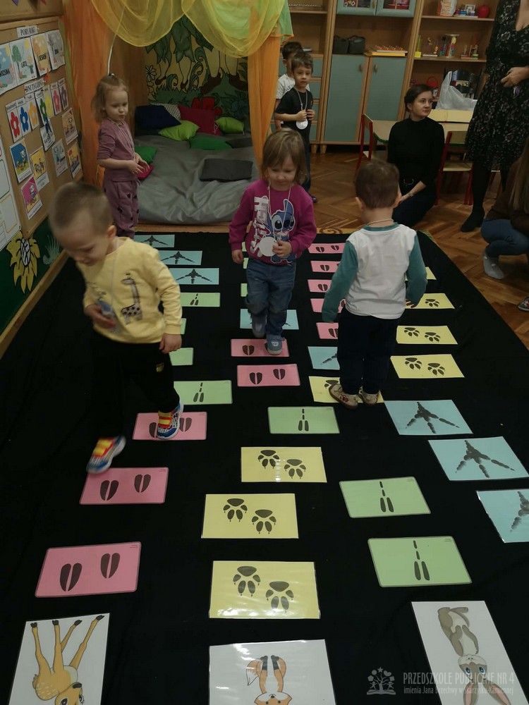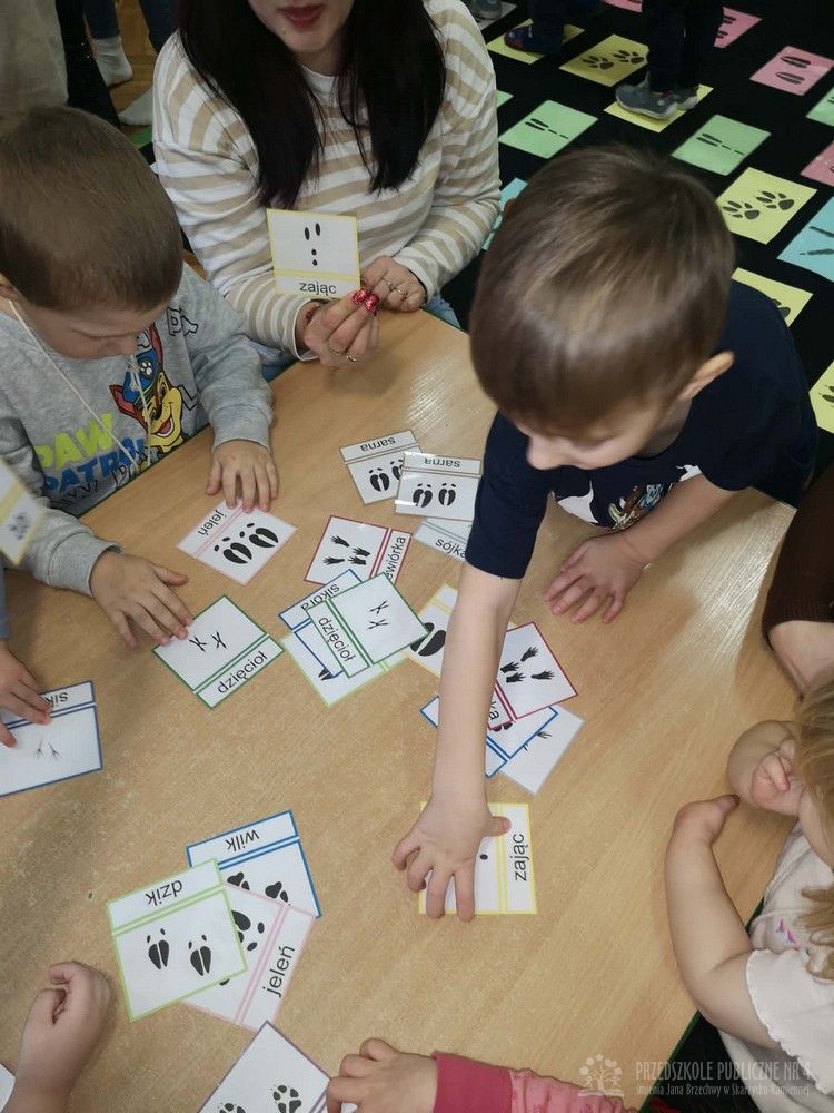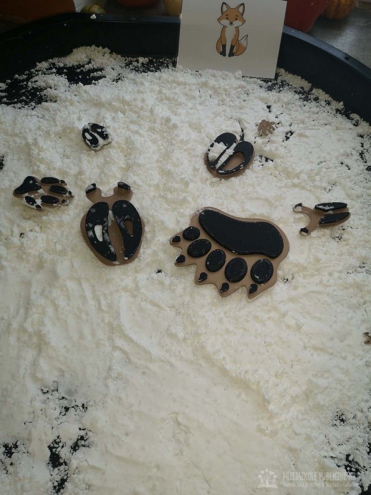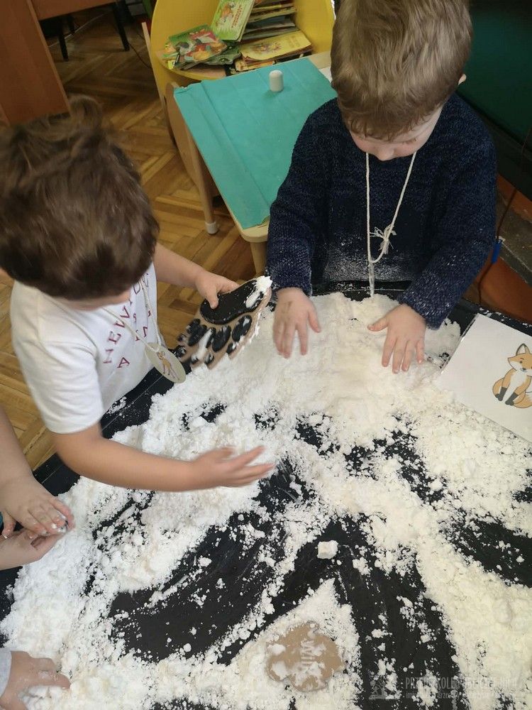 Zajęcia rozpoczęły się od rozmowy kierowanej na temat zimy i warunków życia zwierząt w tym okresie. Dzieci oglądały ilustracje przedstawiające różne tropy zwierząt (m.in. zająca, lisa, sarny, ptaka) i próbowały je rozpoznawać. Następnie brały udział w zabawach ruchowych i dydaktycznych, utrwalających zdobyte wiadomości.