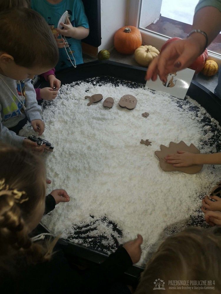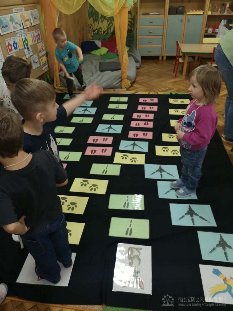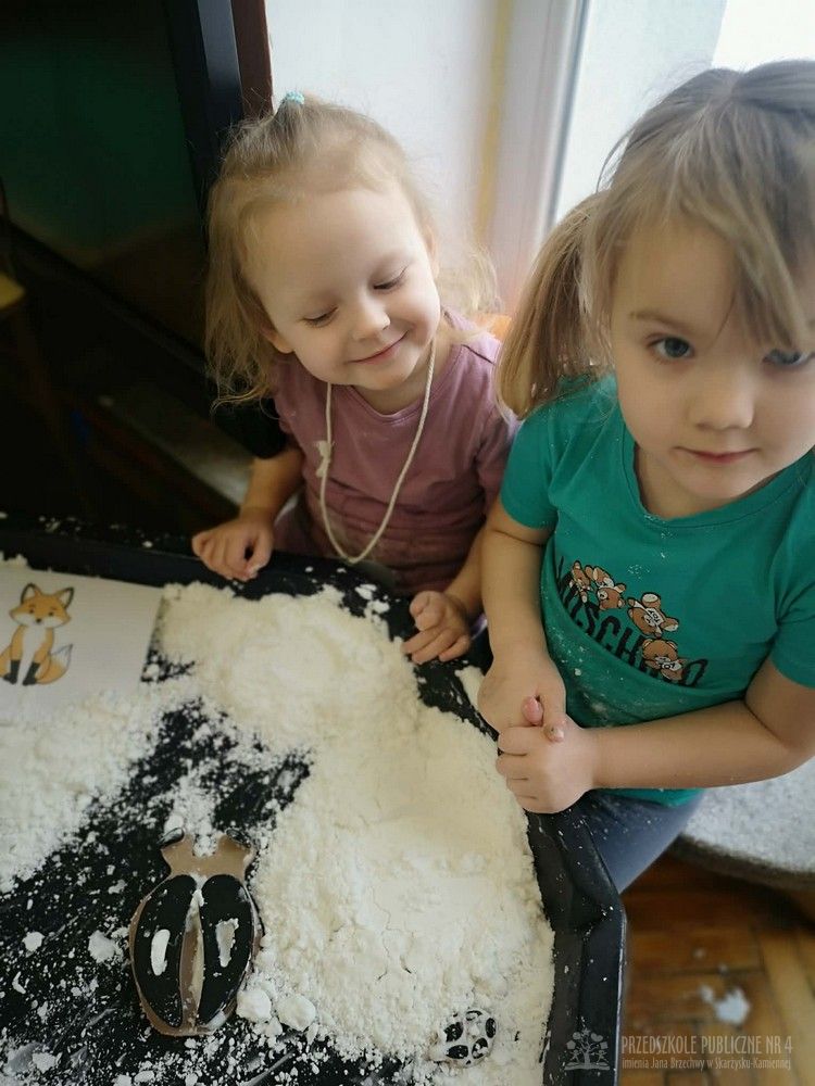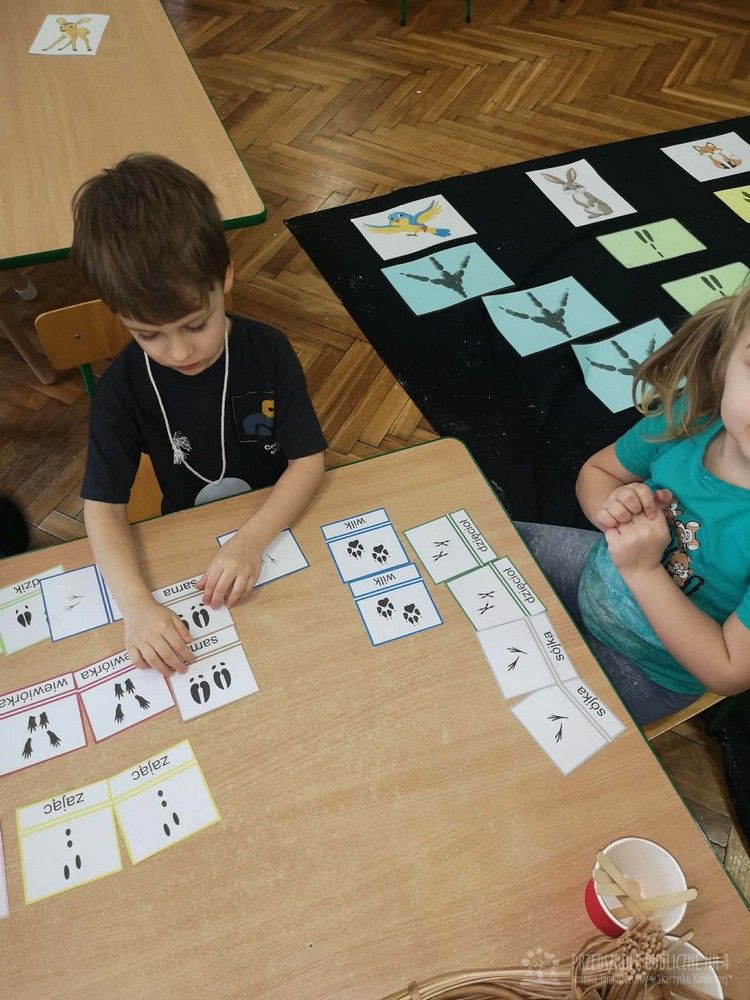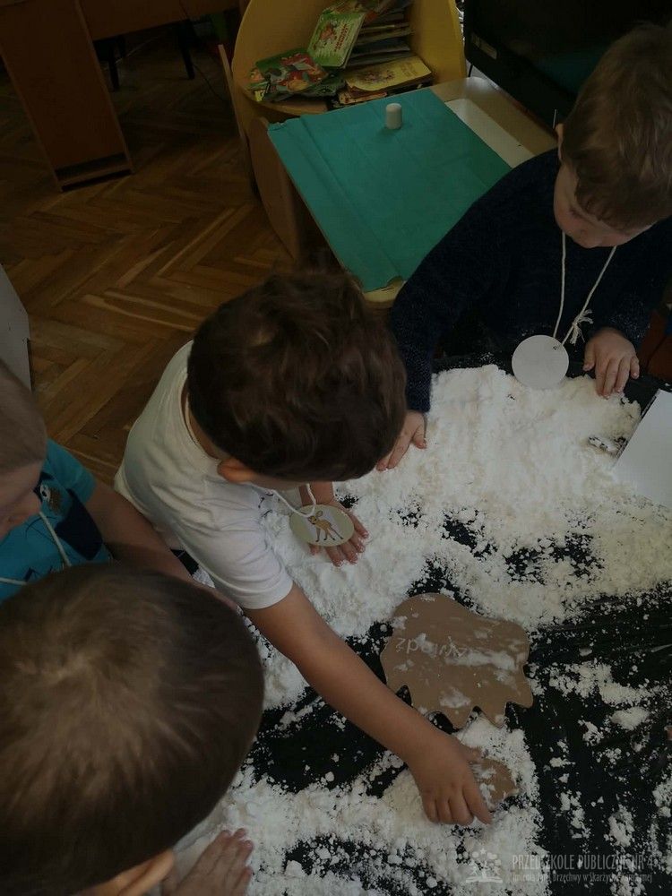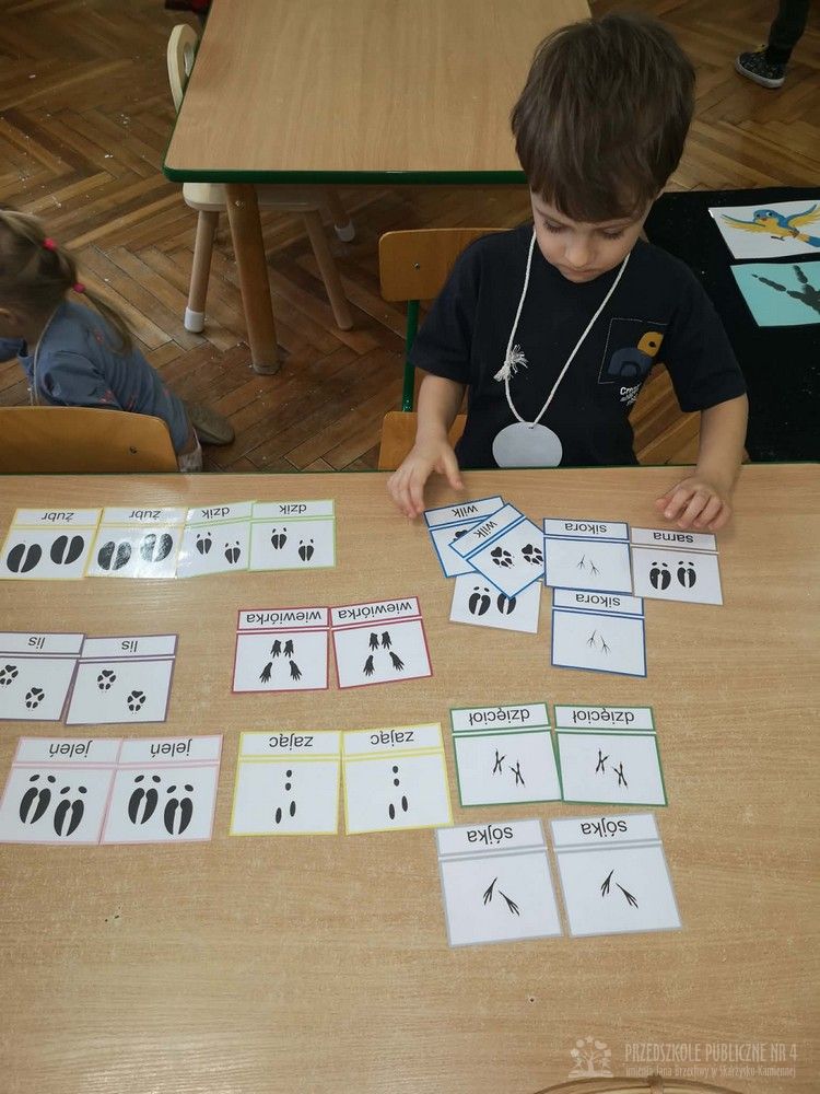 Zajęcia rozpoczęły się od rozmowy kierowanej na temat zimy i warunków życia zwierząt w tym okresie. Dzieci oglądały ilustracje przedstawiające różne tropy zwierząt (m.in. zająca, lisa, sarny, ptaka) i próbowały je rozpoznawać. Następnie brały udział w zabawach ruchowych i dydaktycznych, utrwalających zdobyte wiadomości.