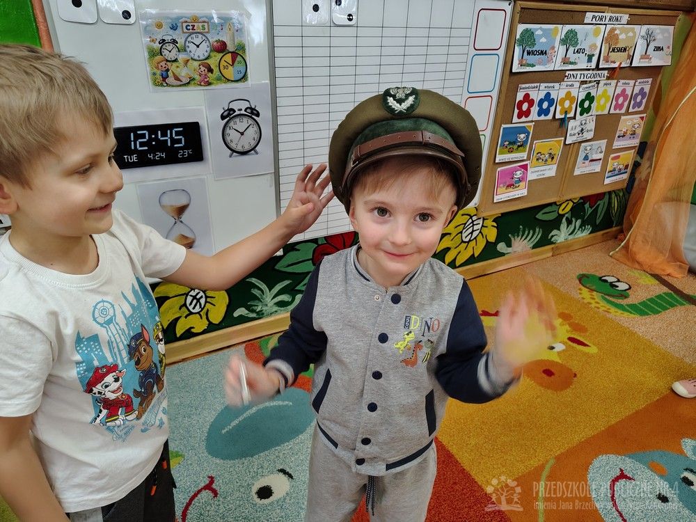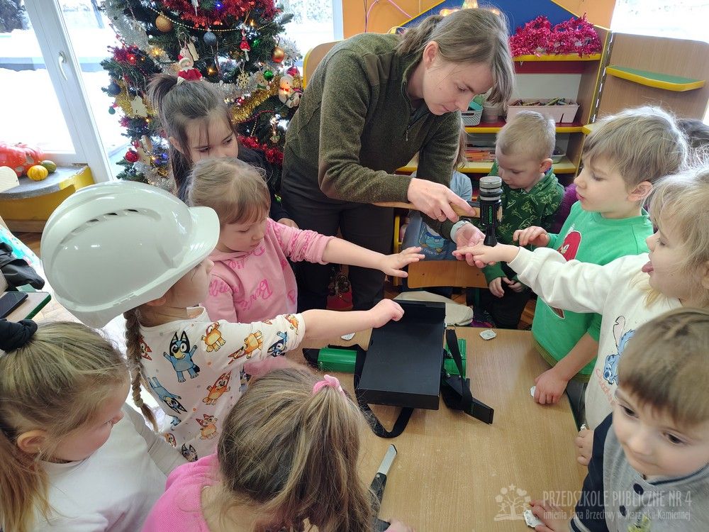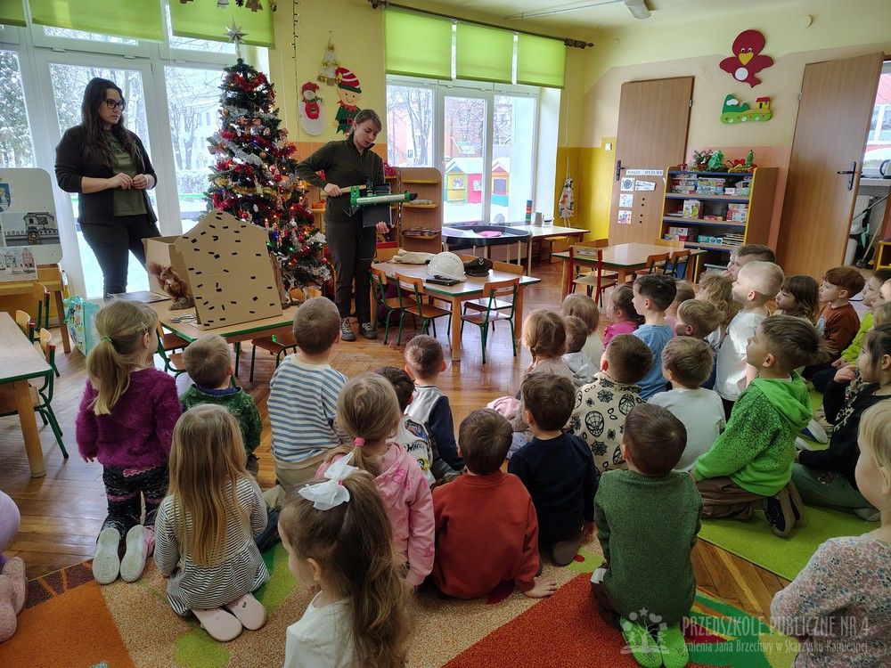 Naszym gościem były leśniczki, które opowiedziały dzieciom o swojej pracy oraz o życiu lasu. Przedszkolaki dowiedziały się, jakie zwierzęta mieszkają w lesie, jak należy zachowywać się podczas spacerów w lesie oraz dlaczego ochrona przyrody jest tak ważna. Dzieci miały okazję obejrzeć akcesoria leśnika, zadawały pytania i chętnie dzieliły się swoimi spostrzeżeniami.